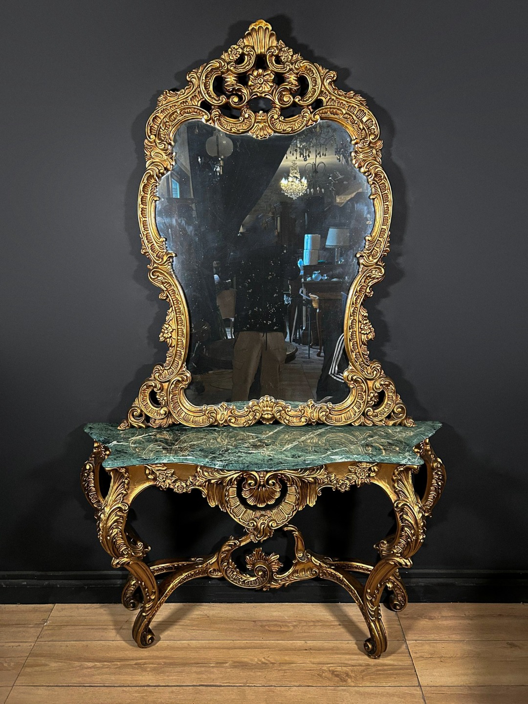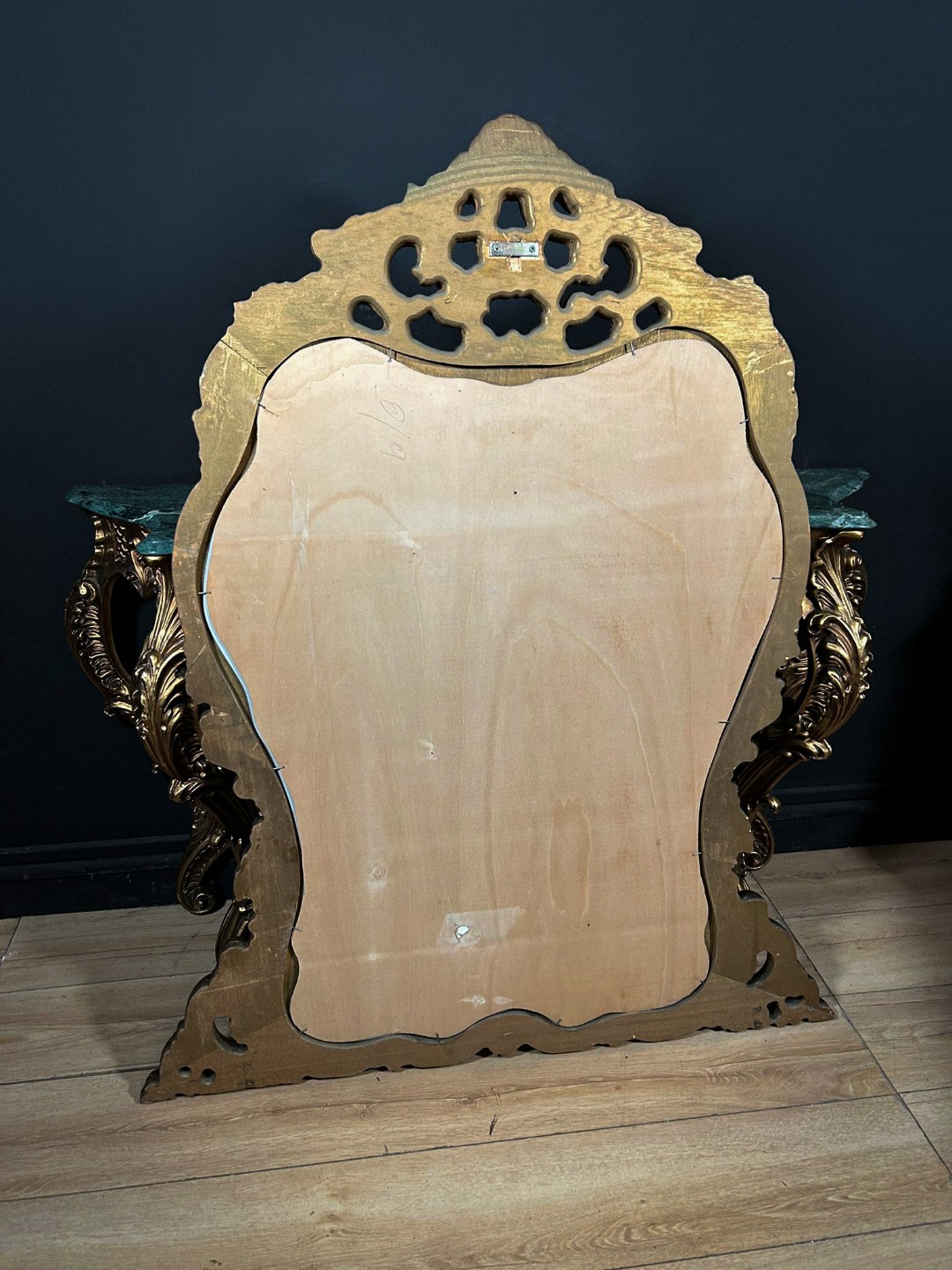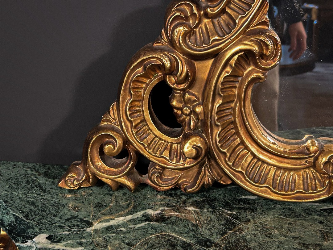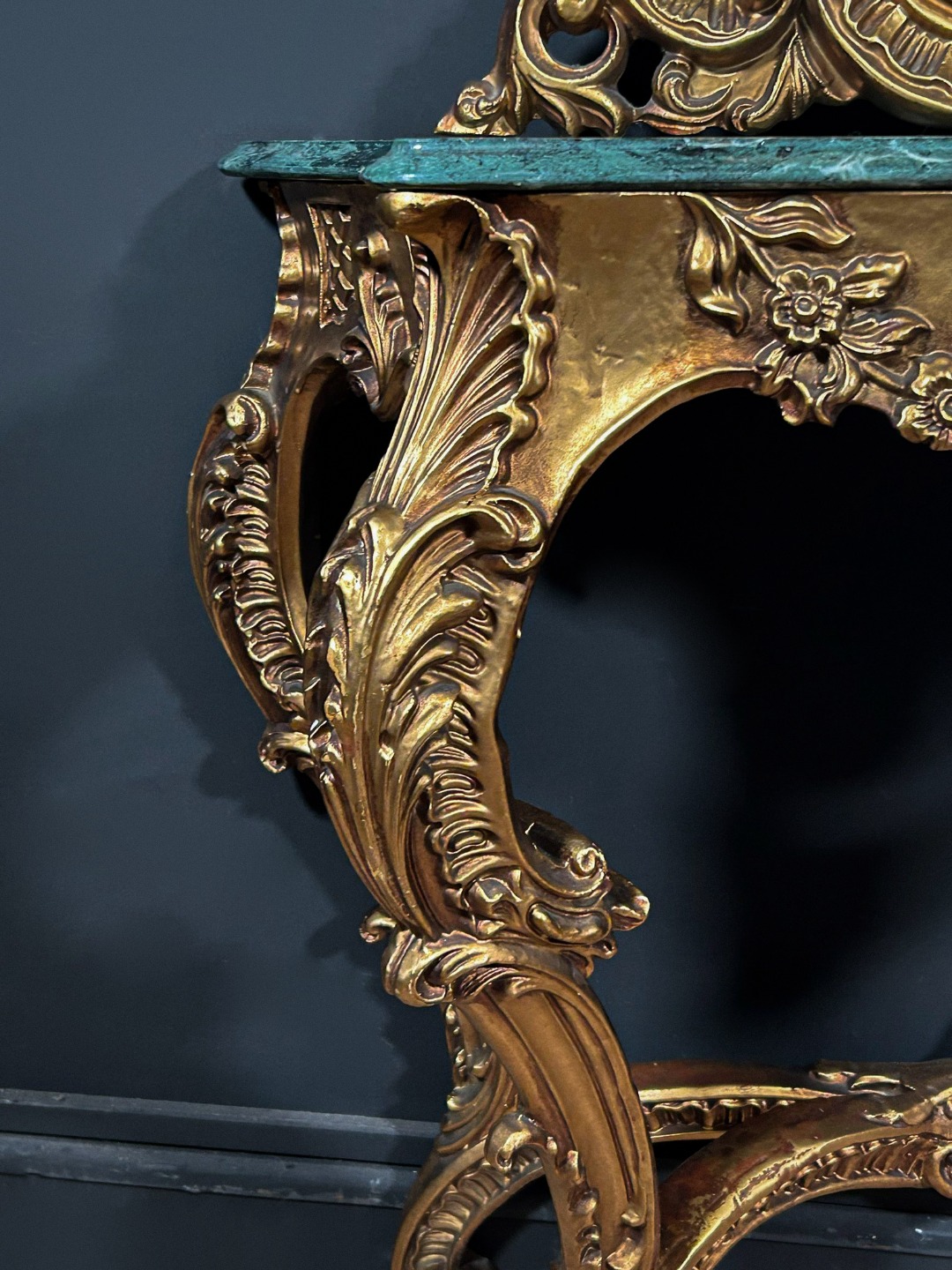 Consolle Barocchetta Stile Luigi XV con Specchiera – Legno Dorato e Piano in Marmo Verde