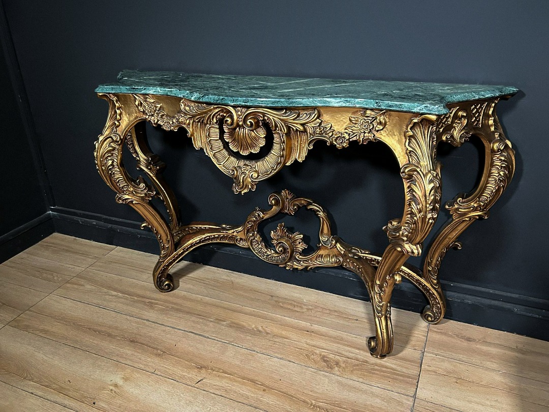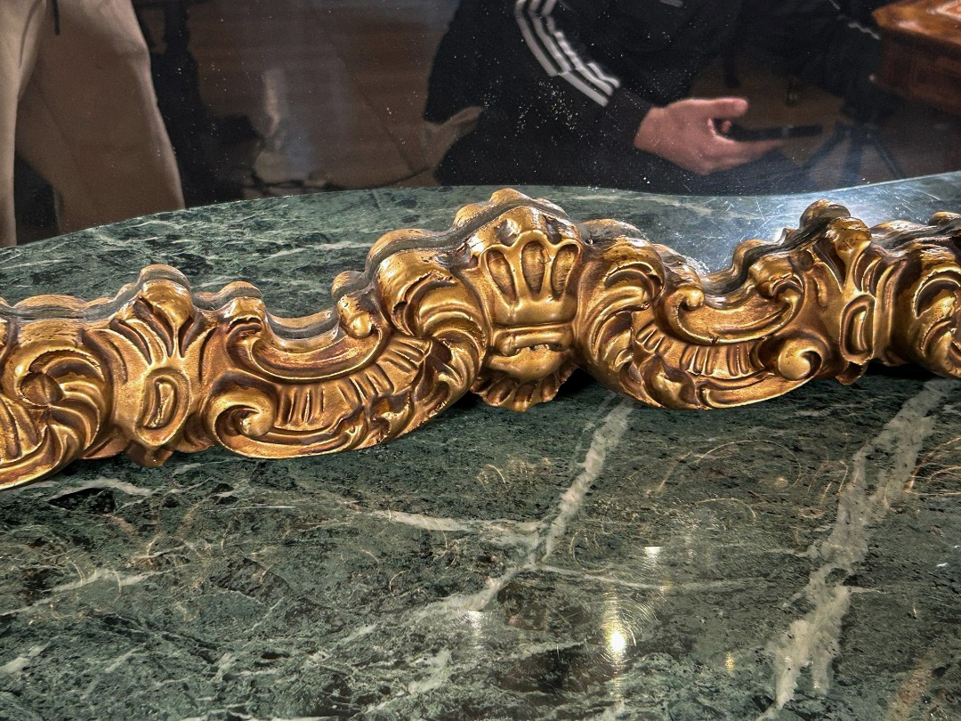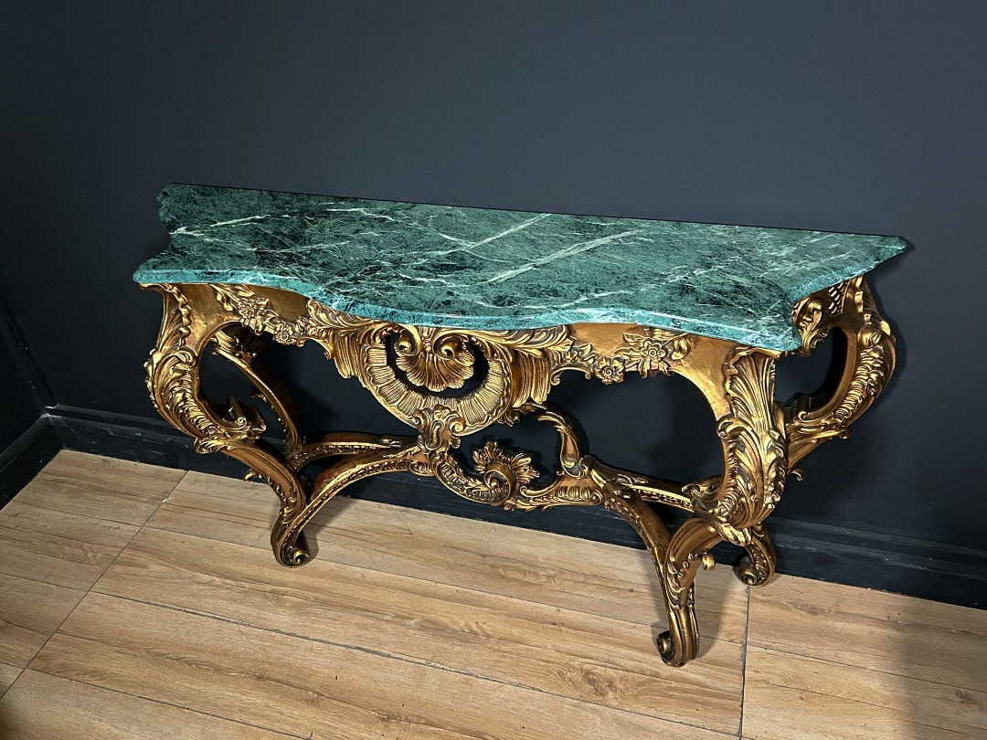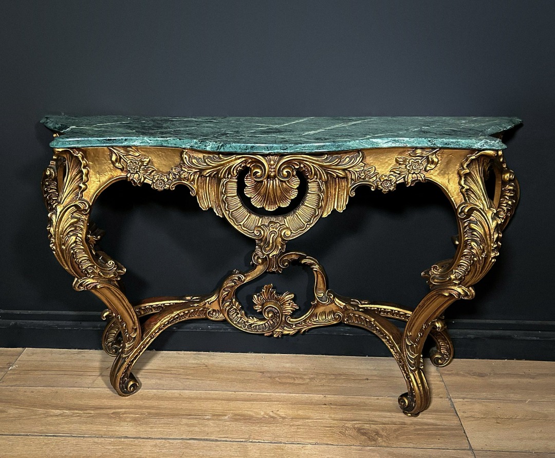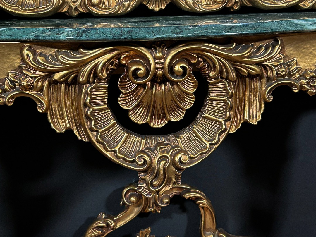 Consolle Barocchetta Stile Luigi XV con Specchiera – Legno Dorato e Piano in Marmo Verde