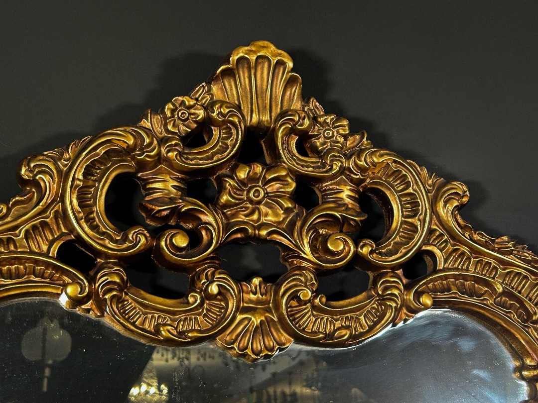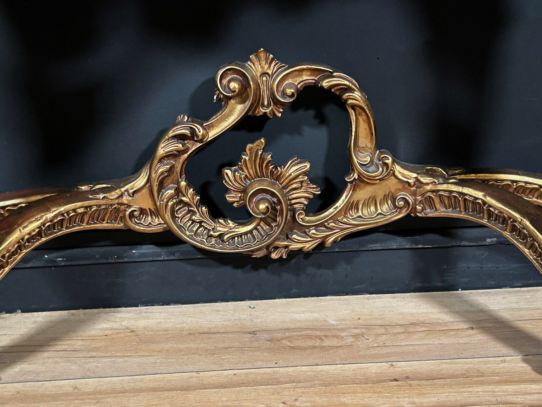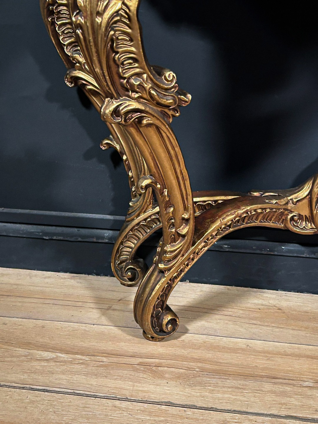 Elegante consolle barocchetta in stile Luigi XV, finemente realizzata in legno scolpito e dorato, completa della sua importante specchiera coordinata.