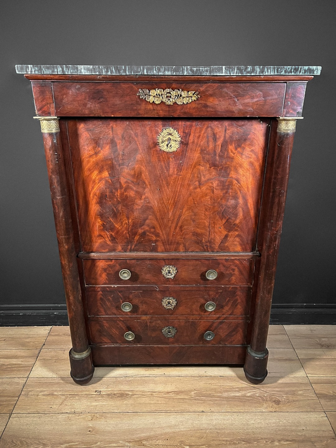 Elegante secretaire antico di stile Impero, realizzato in legno di mogano, caratterizzato da una linea solida e armoniosa tipica della prima metà dell’Ottocento. La struttura presenta un’impostazione architettonica con colonne laterali tornite, arricchite da capitelli e dettagli in bronzo dorato, che conferiscono al mobile un aspetto monumentale ed equilibrato.