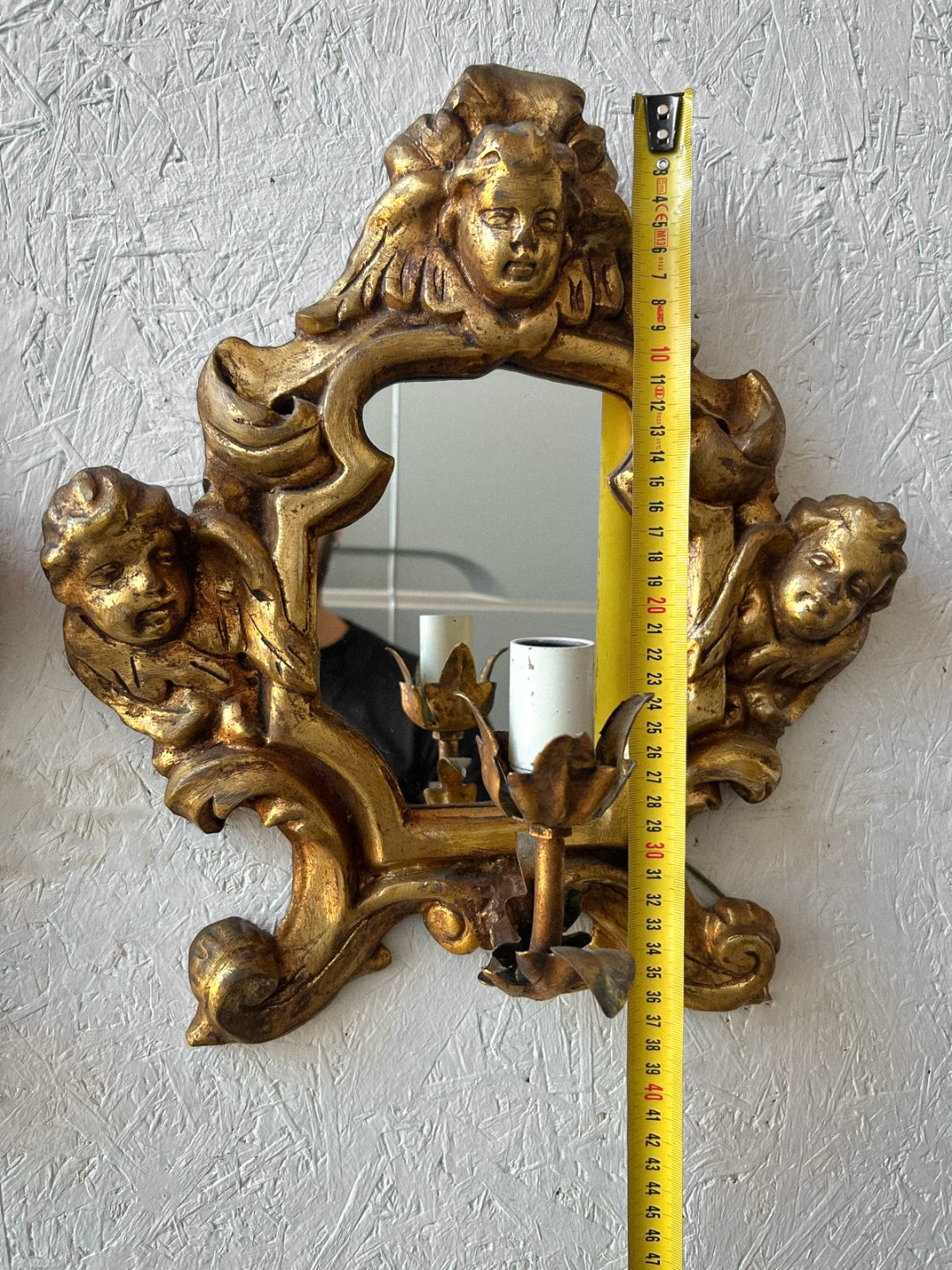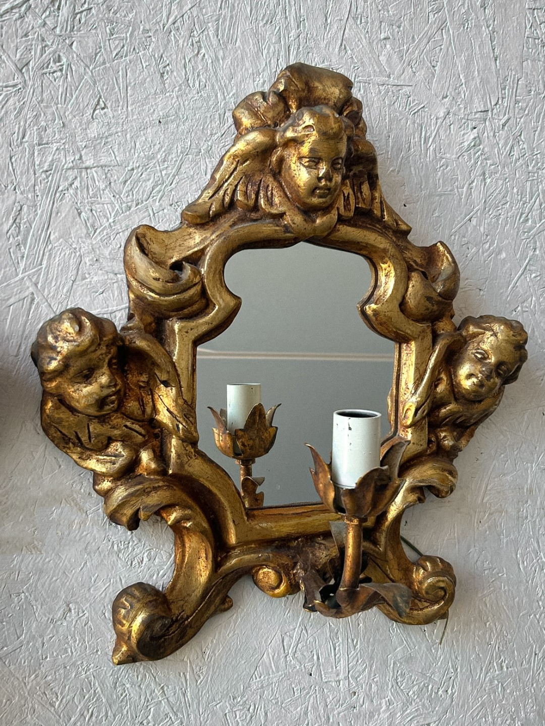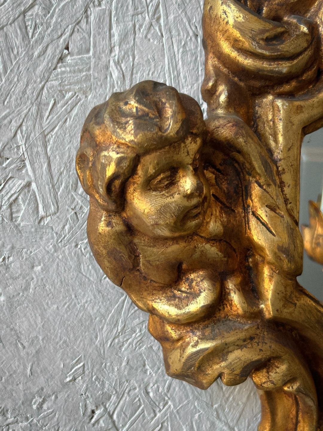 Splendida coppia di antiche carte gloria, successivamente adattate ad applique, realizzate in legno dorato e finemente intagliato. I manufatti sono arricchiti da delicate sculture di putti a rilievo, che donano un forte impatto decorativo e una rara raffinatezza. Ogni applique presenta un punto luce centrale, armoniosamente inserito nella struttura.
