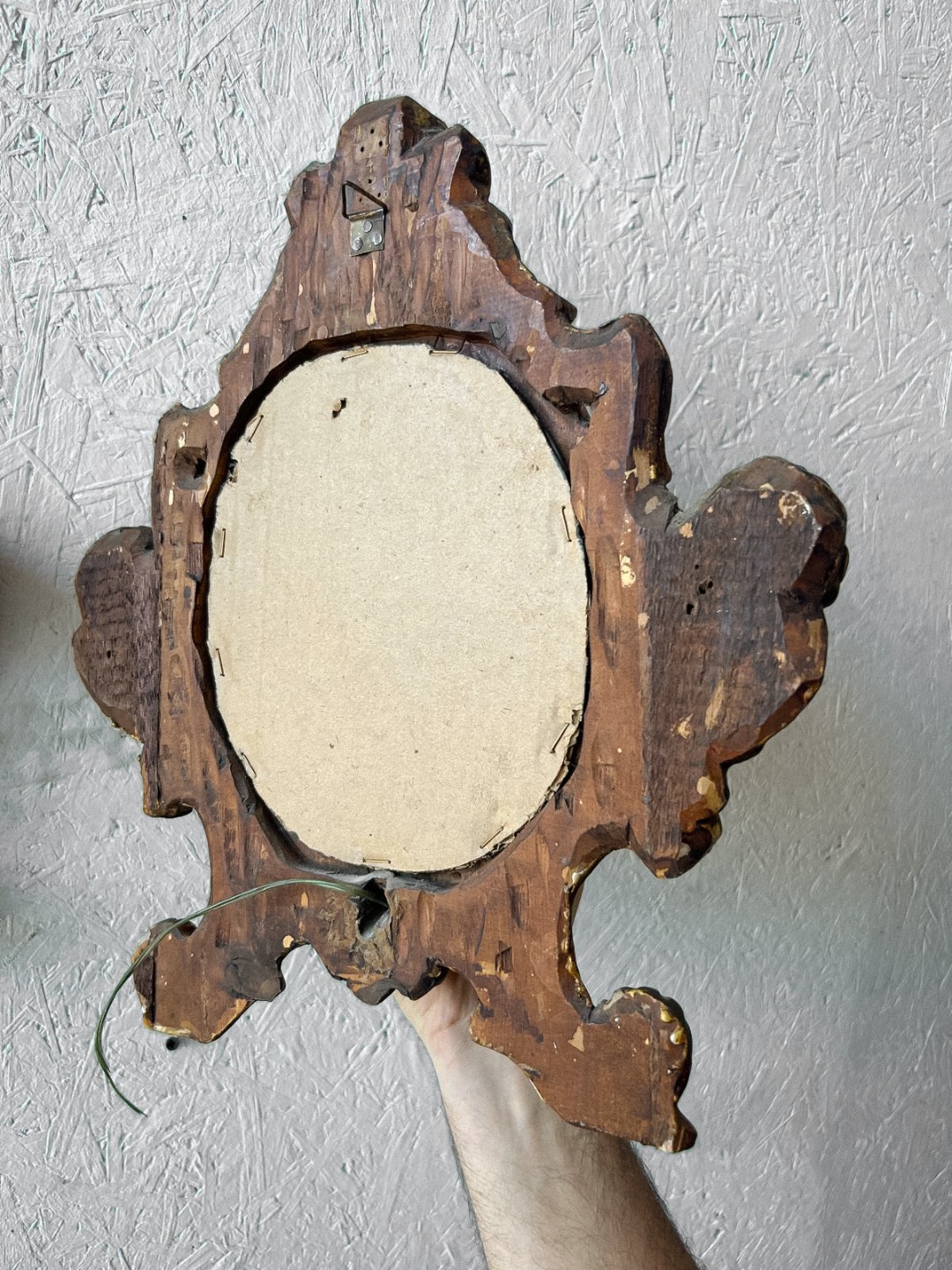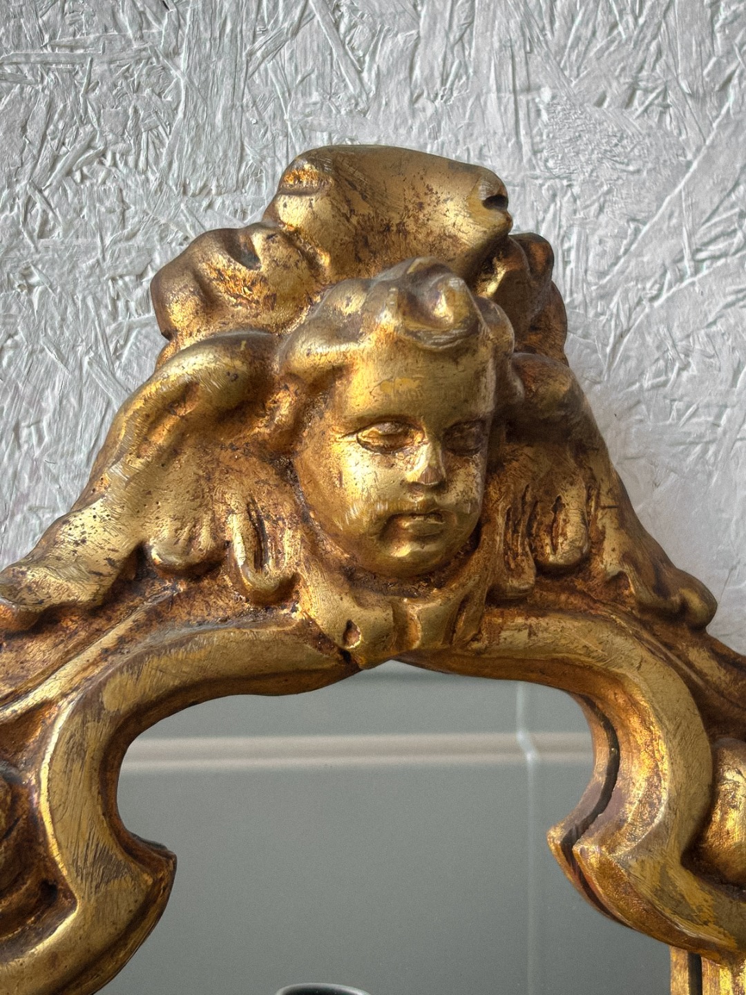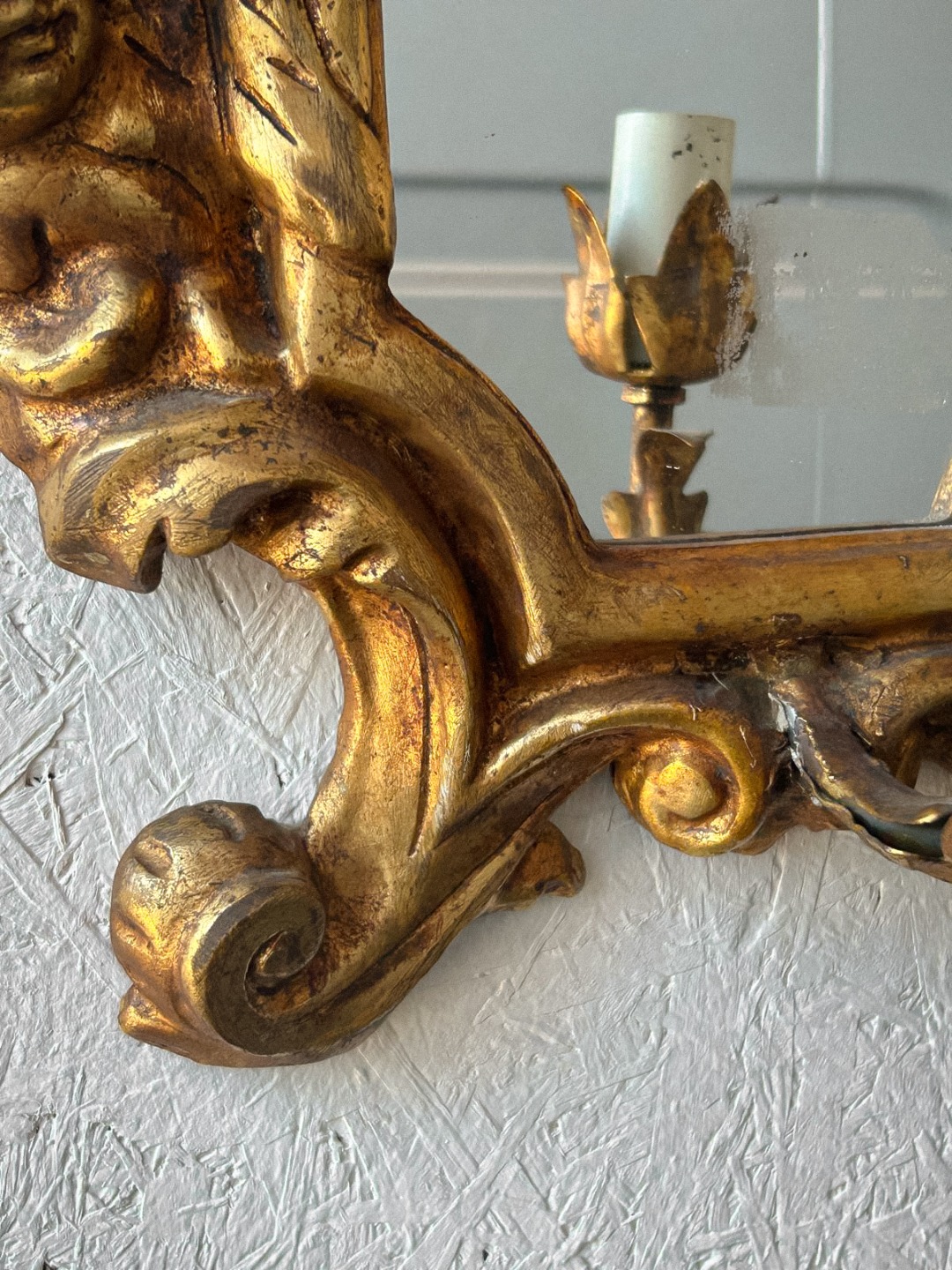 Splendida coppia di antiche carte gloria, successivamente adattate ad applique, realizzate in legno dorato e finemente intagliato. I manufatti sono arricchiti da delicate sculture di putti a rilievo, che donano un forte impatto decorativo e una rara raffinatezza. Ogni applique presenta un punto luce centrale, armoniosamente inserito nella struttura.