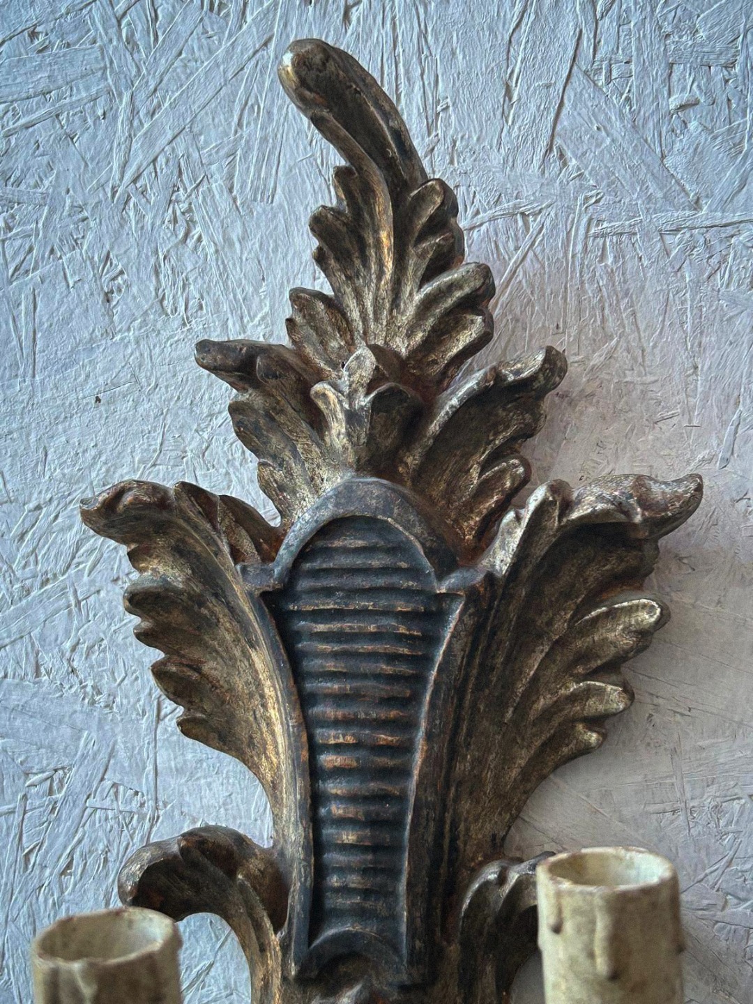 Elegante coppia di applique di epoca fine XIX secolo, realizzate in legno con finitura in argento mecca, che conferisce raffinate sfumature luminose e pregiate. La struttura, finemente intagliata con motivi vegetali, ospita ciascuna tre punti luce, disposti in modo armonico e scenografico.