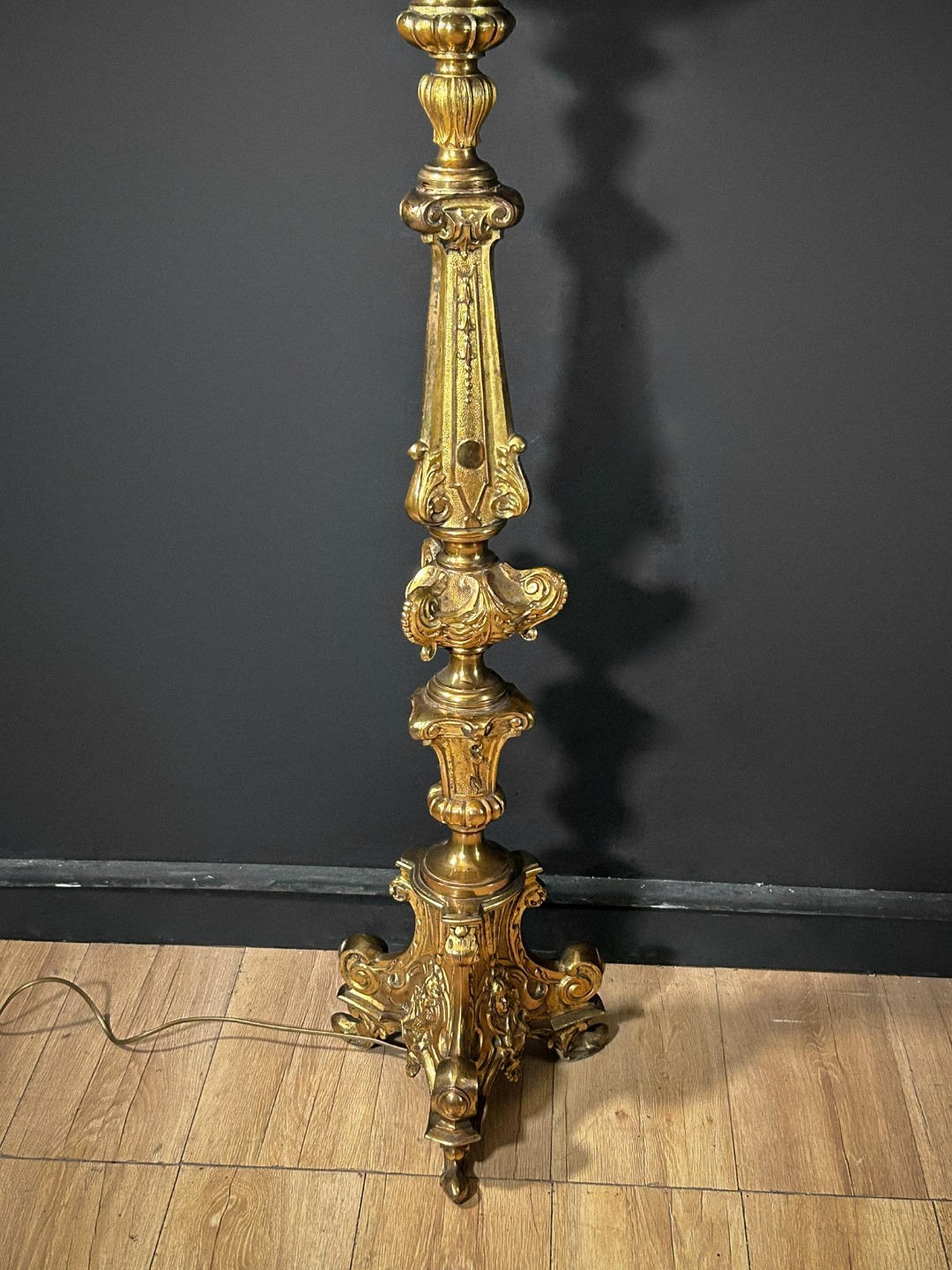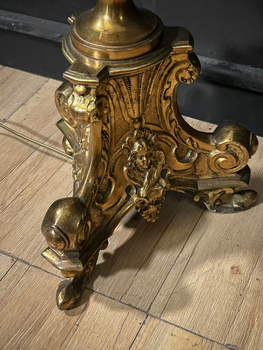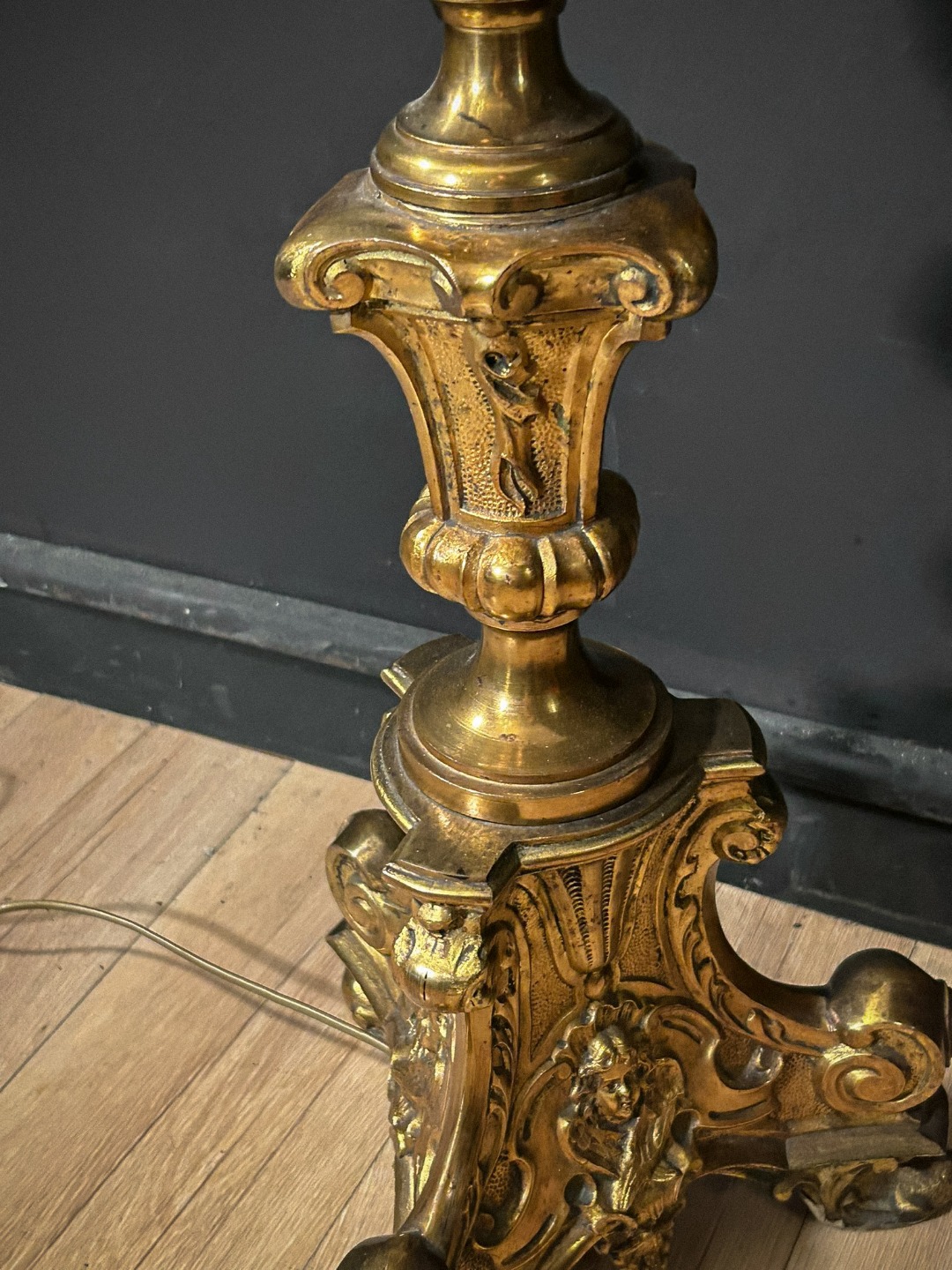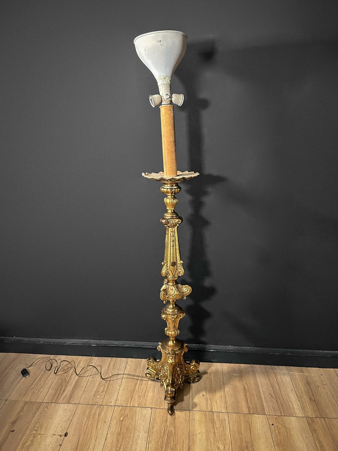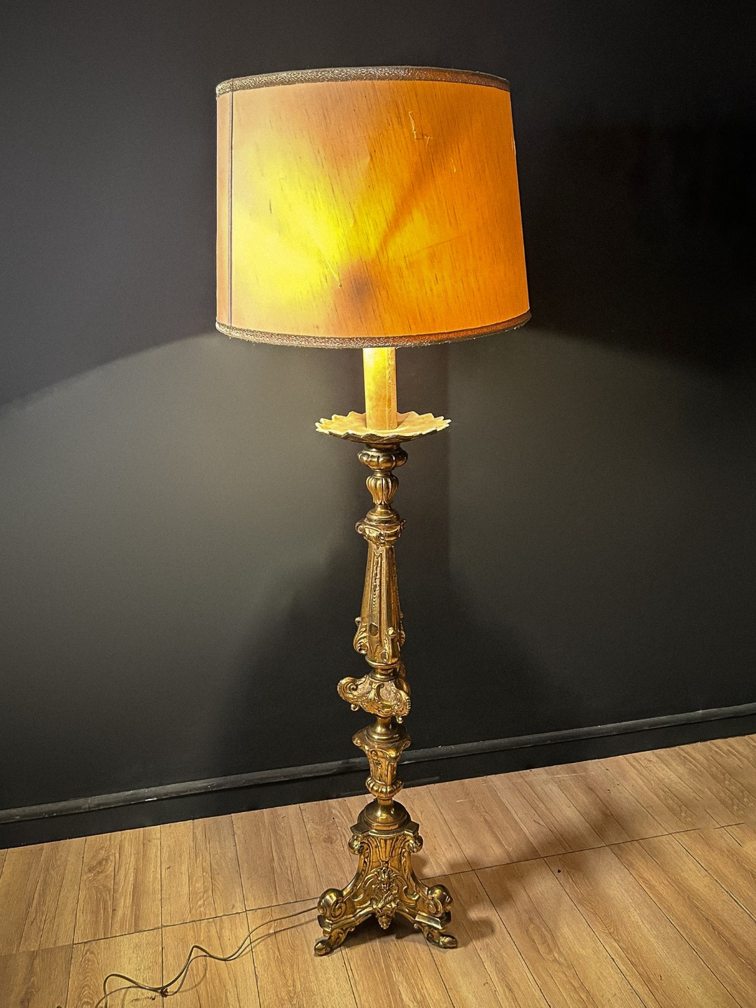 La doratura originale dona luminosità e profondità al manufatto, esaltando i dettagli scultorei. Il torciere è stato elettrificato in epoca successiva, mantenendo comunque la linea e l’estetica importanti del pezzo. Completo di paralume montato su supporto superiore.