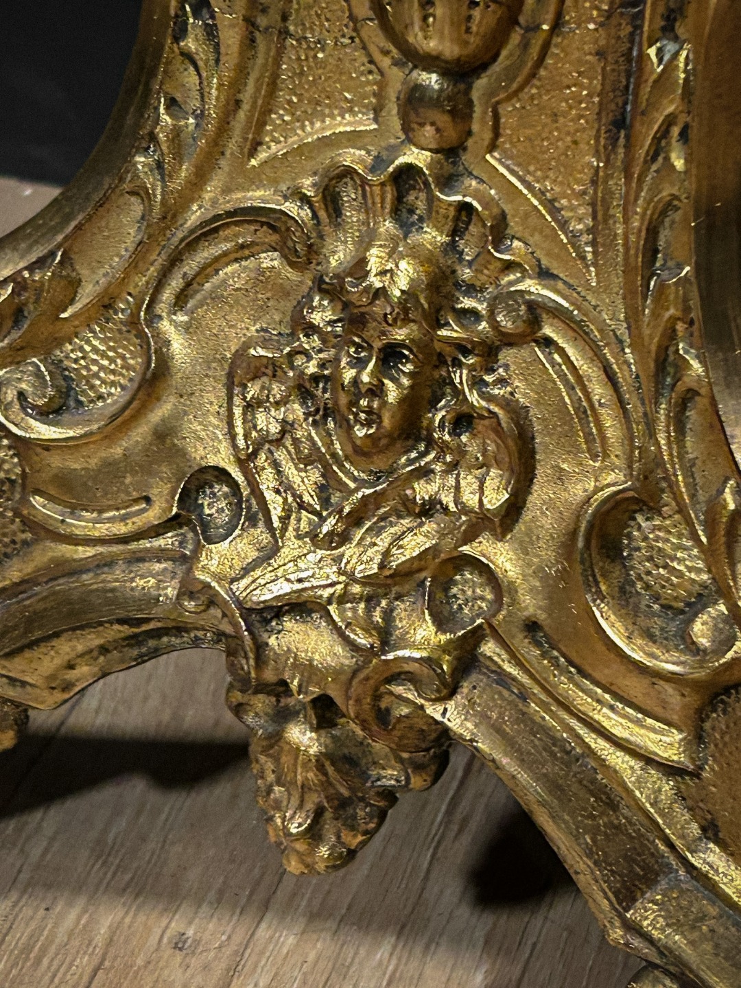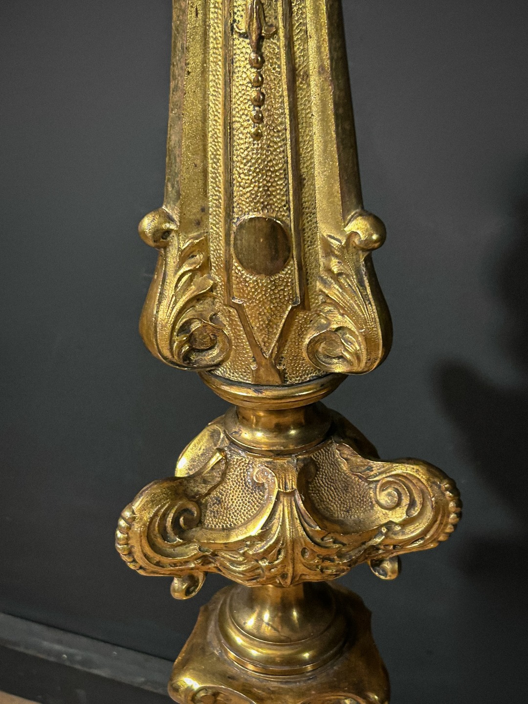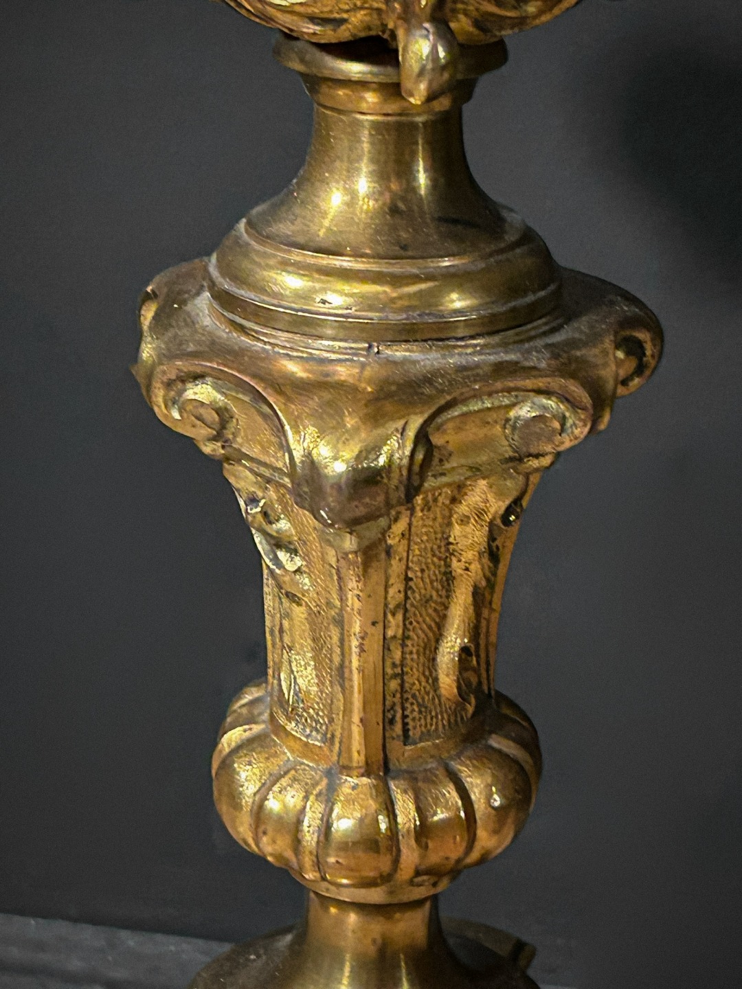 Importante torciere italiano in bronzo massiccio dorato, appartenente alla fine dell’Ottocento. Il fusto presenta una ricca decorazione a rilievo con motivi fogliacei, volute e mascheroni finemente modellati, realizzati con grande maestria artigianale. La base tripode, solida e riccamente scolpita, è caratterizzata da elementi ornamentali in stile barocco revival con figure e decori floreali di notevole pregio.