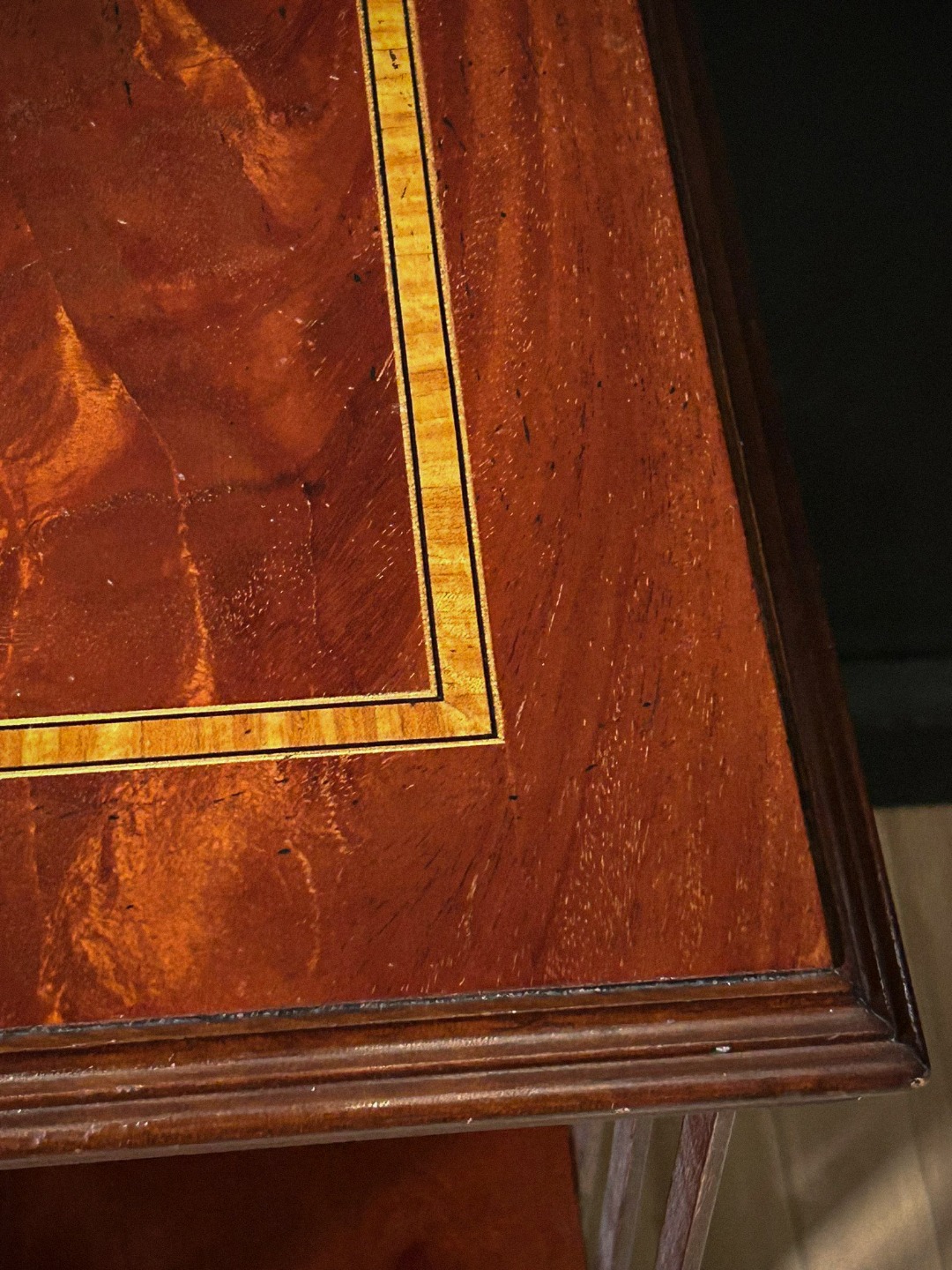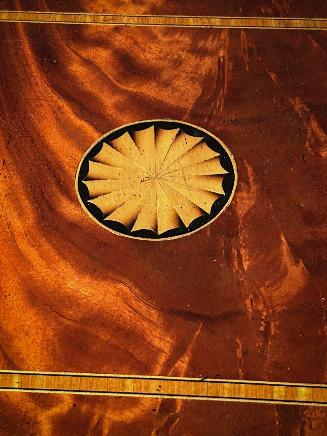 Elegante libreria girevole realizzata in mogano, caratterizzata da una raffinata decorazione intarsiata a raggiera sul piano e da filettature geometriche in legni chiari.