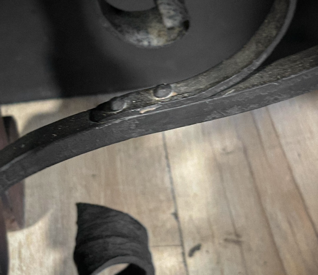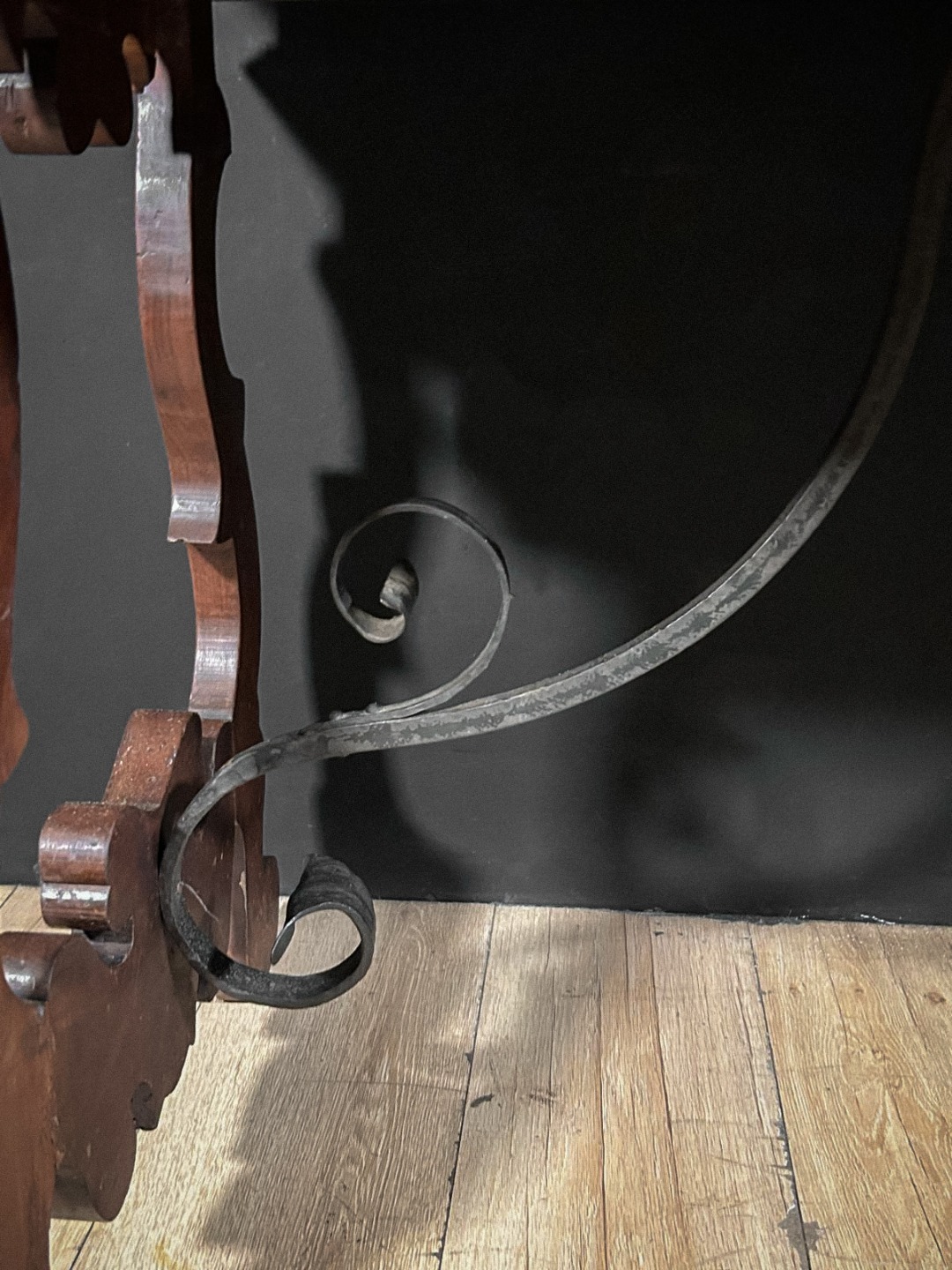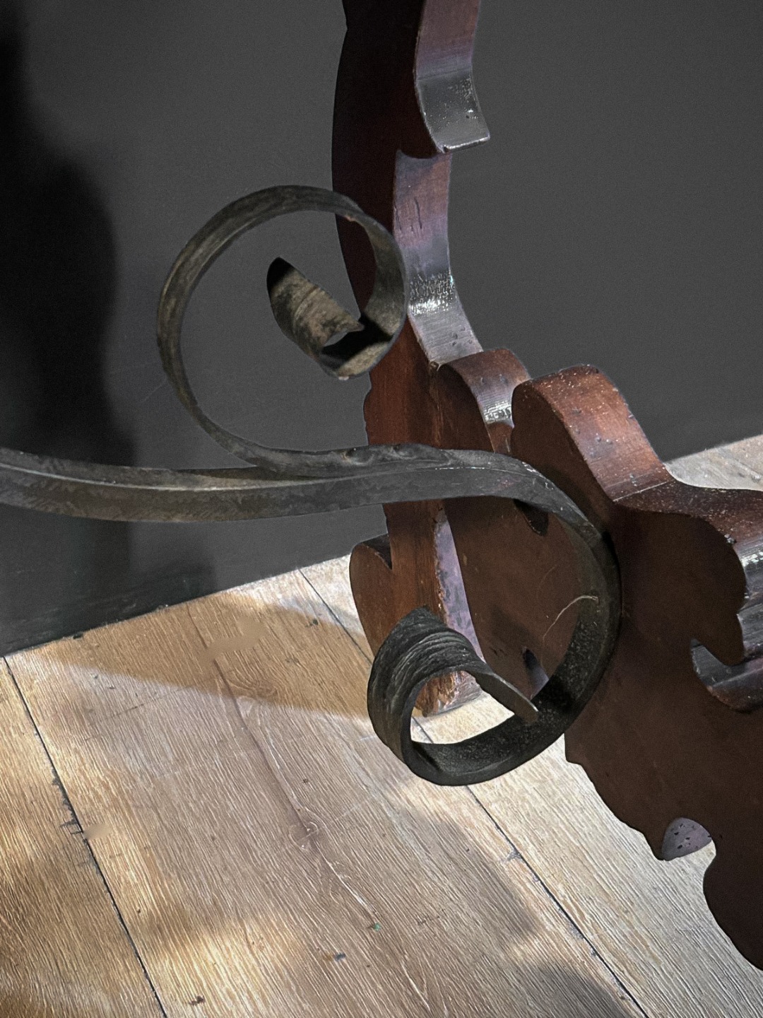 Gambe mosse scolpite unite da traversa in ferro ricurvo.