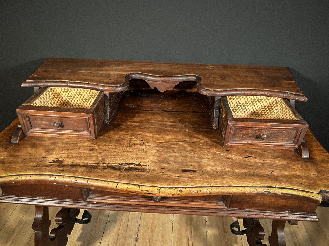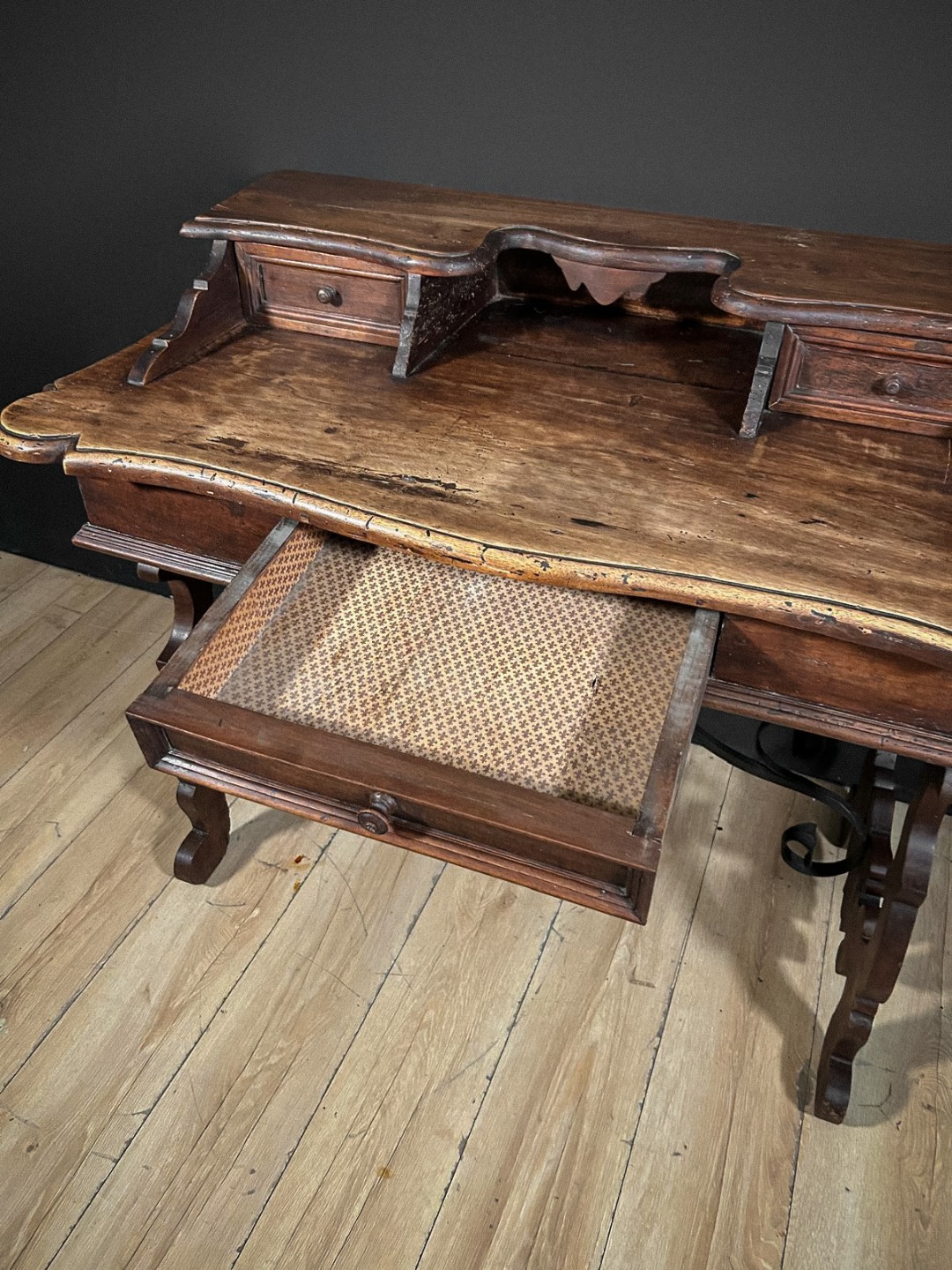 Raffinato scrittoio del XVIII secolo, caratterizzato da un’elegante alzata superiore sagomata con due cassettini laterali e vano centrale.