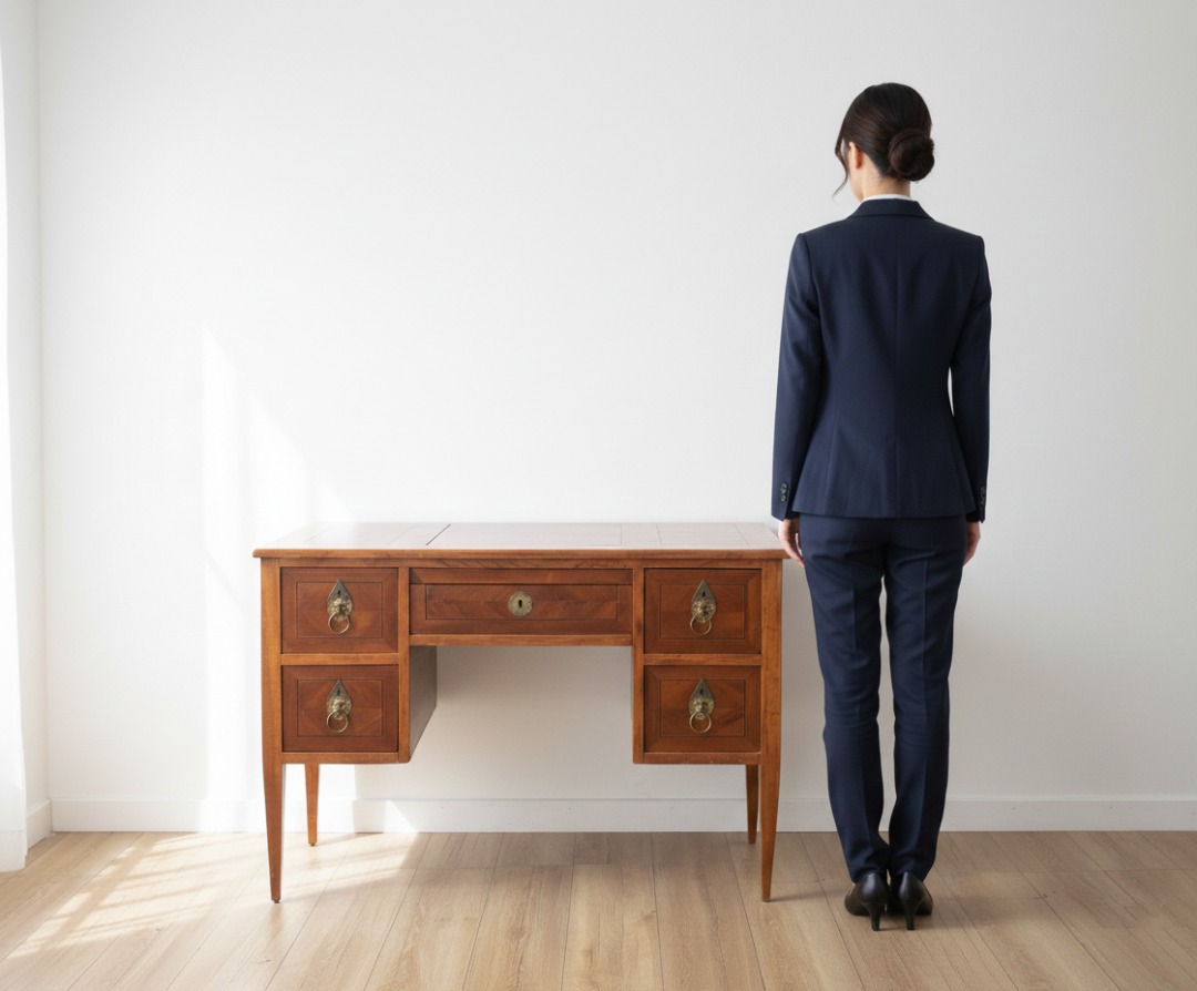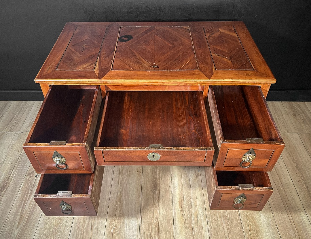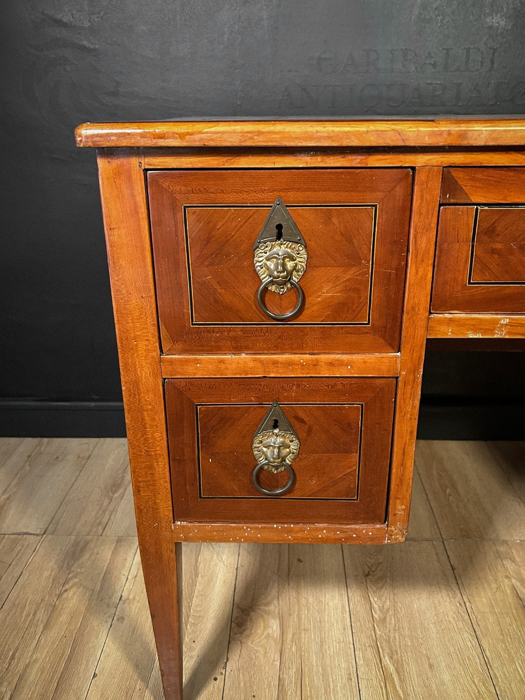 Importante scrittoio Tolentina italiano in legno di ciliegio, appartenente alla fine del Settecento, espressione raffinata del gusto Luigi XVI. Il piano presenta una raffinata lastronatura geometrica a spina di pesce e pannelli filettati, con ribalta centrale che cela uno specchio originale e un vano interno rivestito in tessuto. La struttura è composta da quattro cassetti laterali e un ampio cassetto centrale, tutti dotati di maniglie originali in bronzo dorato con mascheroni e anelli pendenti. Le gambe rastremate conferiscono slancio ed eleganza al mobile, mentre il retro in legno massello testimonia l’autenticità e la costruzione d’epoca. Le proporzioni equilibrate, la qualità dei materiali e la finezza delle finiture rendono questo scrittoio un pezzo di grande pregio, ideale per studi, camere o ambienti di rappresentanza.