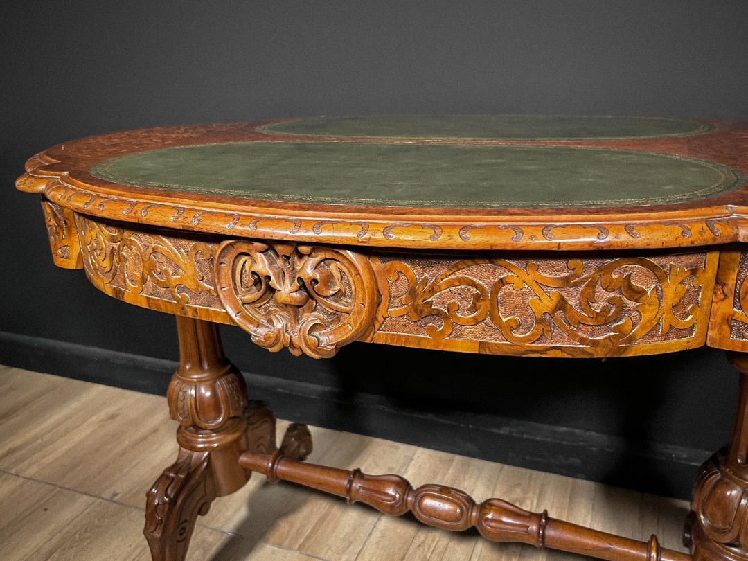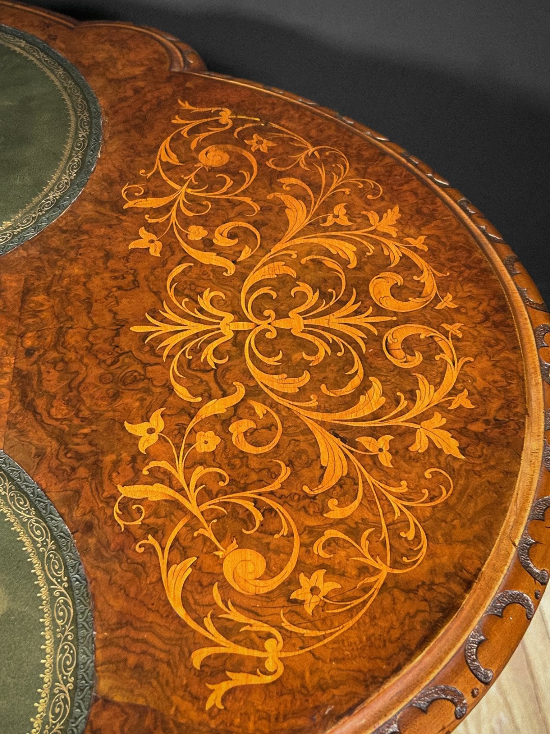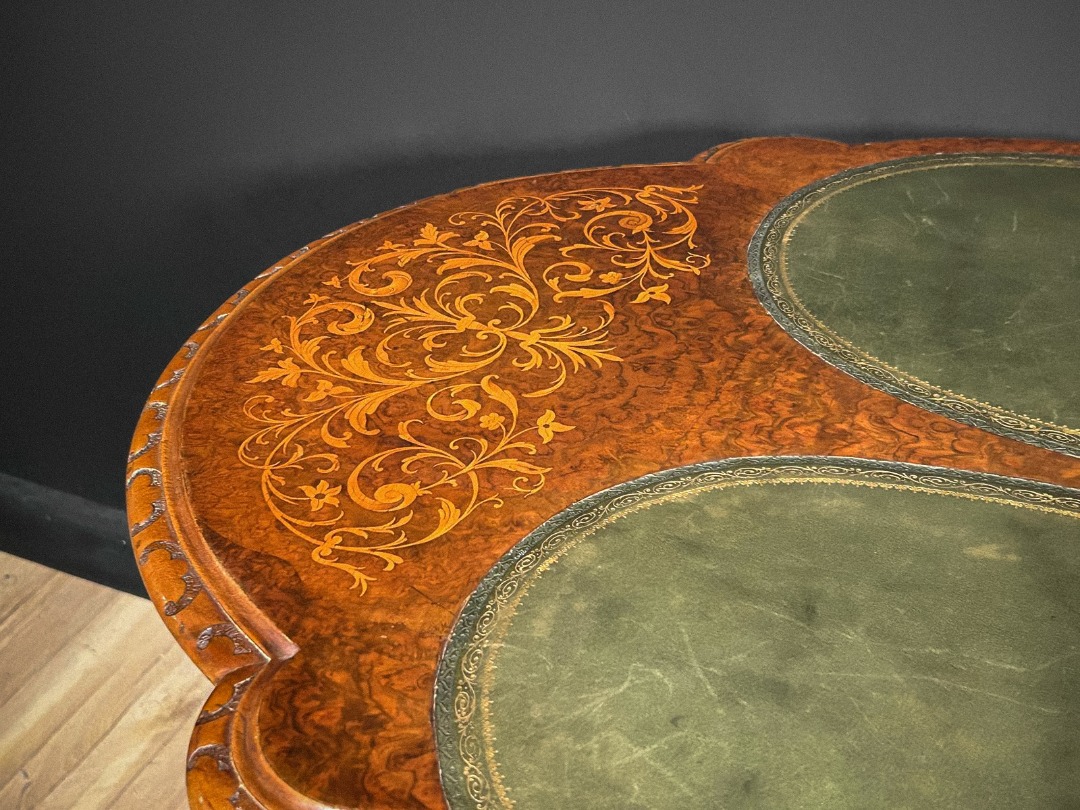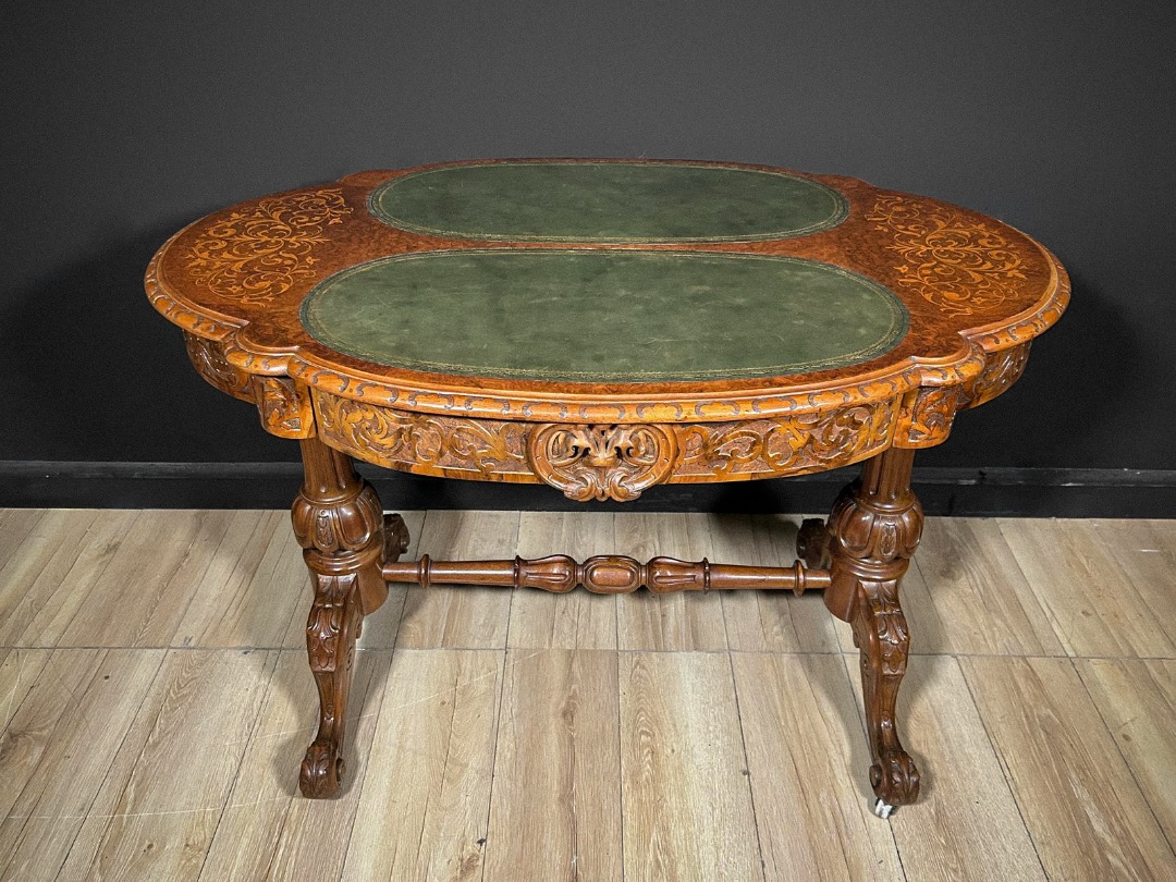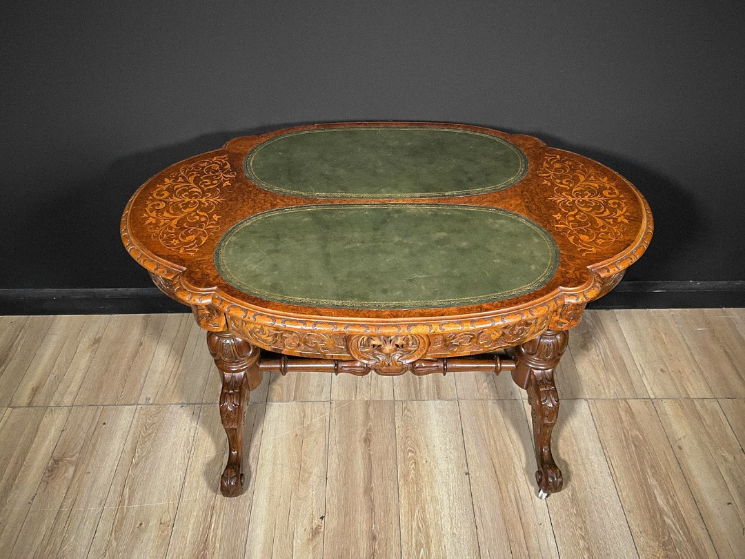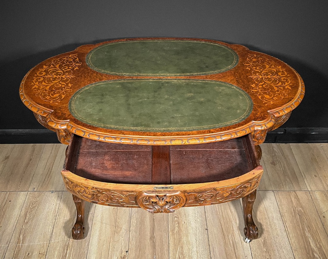 Elegante tavolino antico di grande pregio, caratterizzato da un piano sagomato arricchito da raffinati intarsi floreali che decorano l’intera superficie lignea con estrema finezza esecutiva. La zona centrale ospita due inserti ovali rivestiti in pelle verde, definiti da una ricca greca dorata che ne sottolinea l’eleganza. Lungo il bordo corre una fascia interamente scolpita a motivi fitomorfi, eseguita a mano con eccellente maestria artigianale.