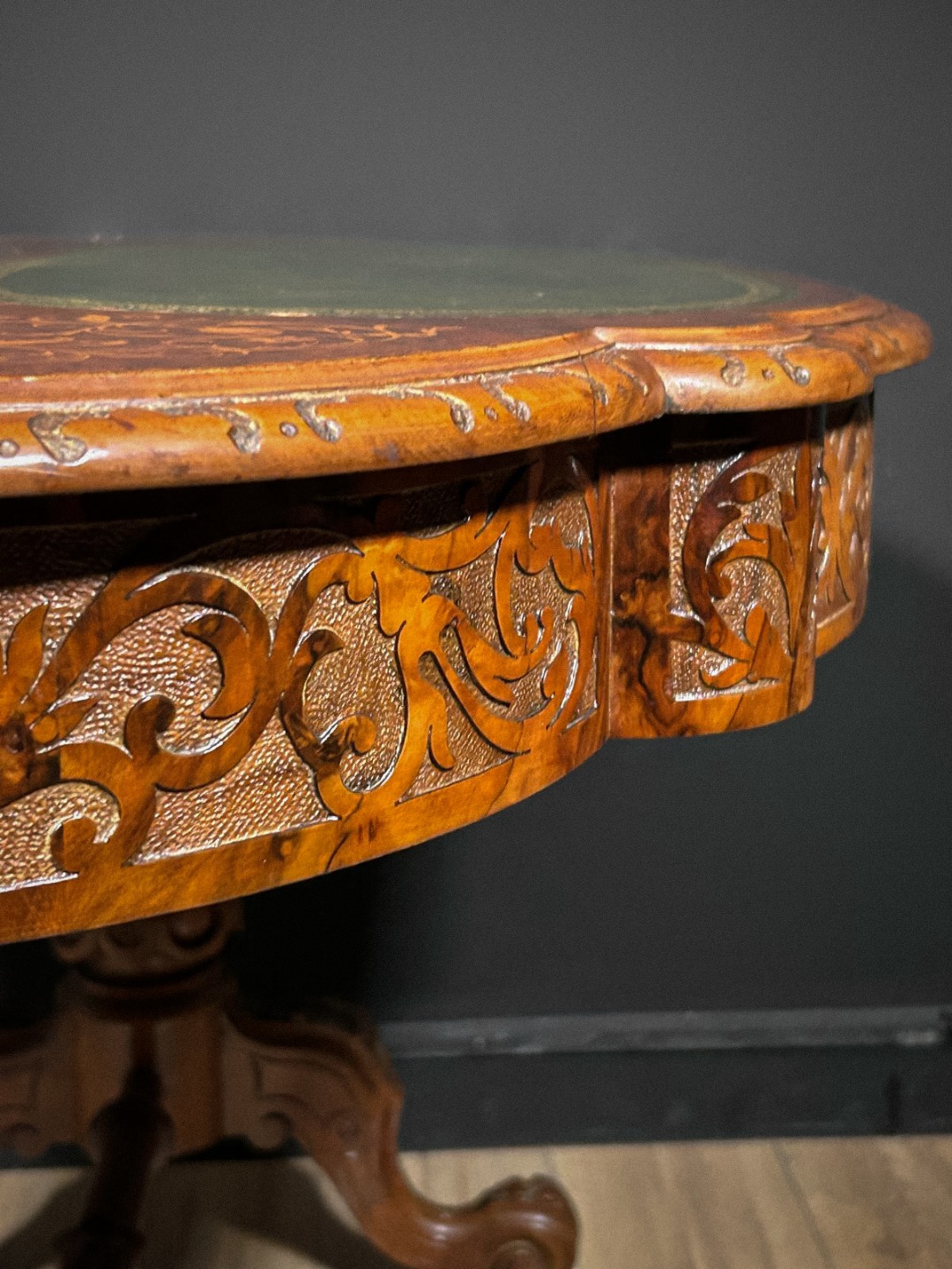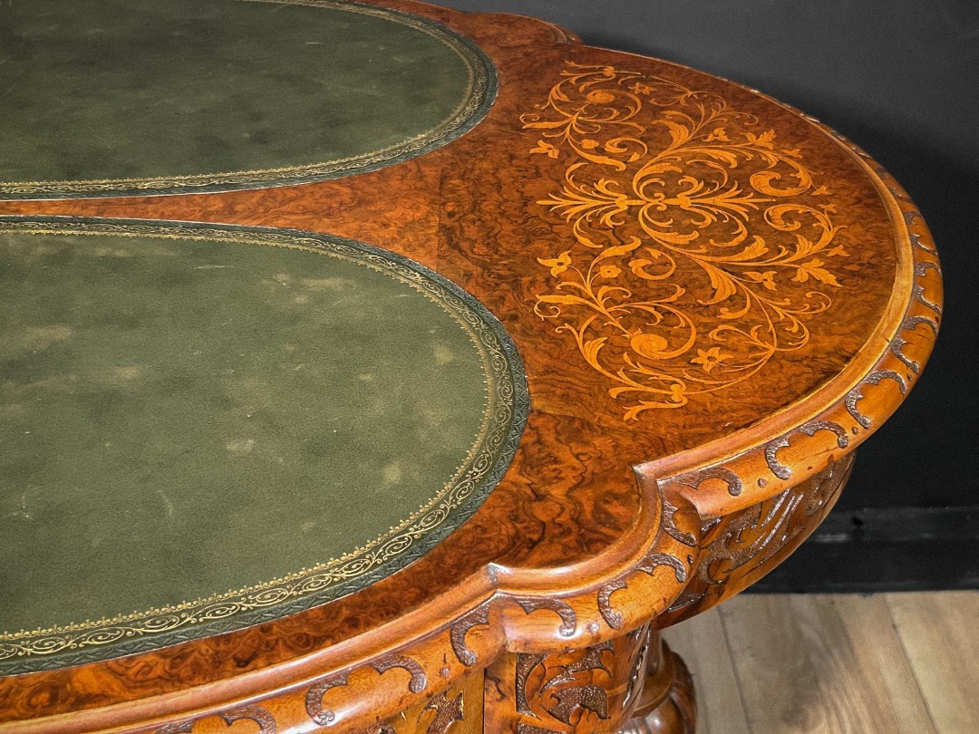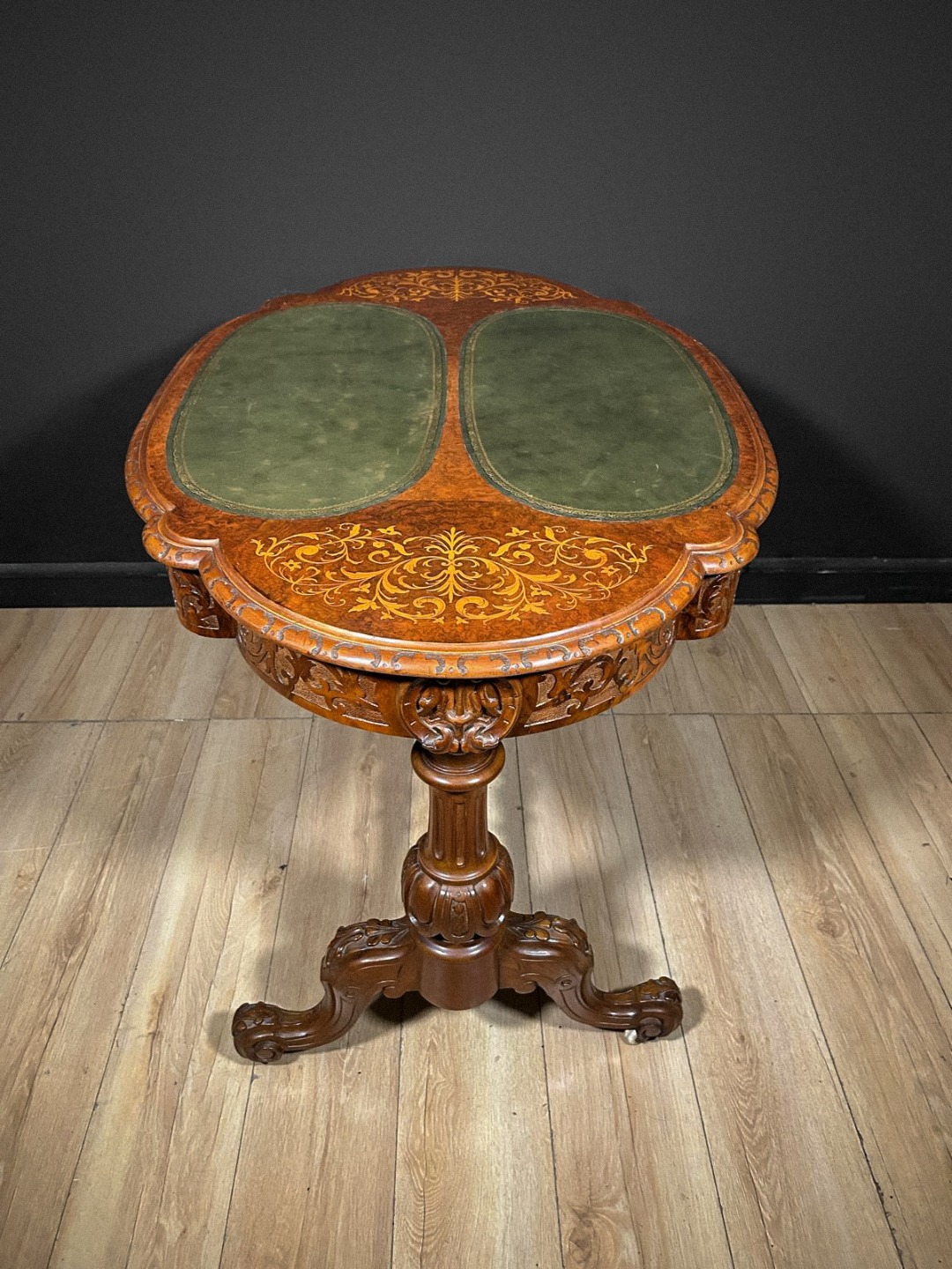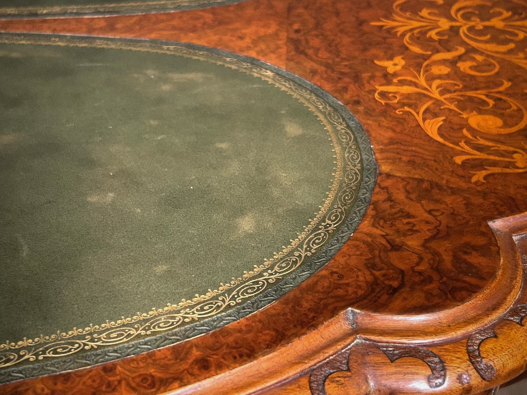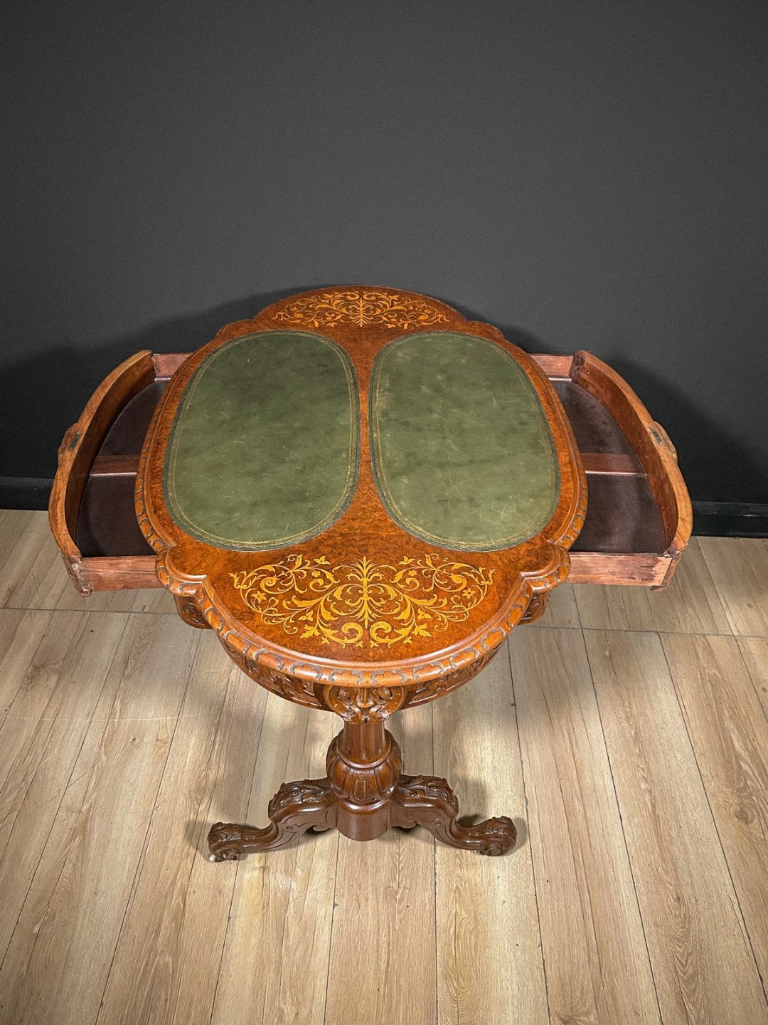 Elegante tavolino antico di grande pregio, caratterizzato da un piano sagomato arricchito da raffinati intarsi floreali che decorano l’intera superficie lignea con estrema finezza esecutiva. La zona centrale ospita due inserti ovali rivestiti in pelle verde, definiti da una ricca greca dorata che ne sottolinea l’eleganza. Lungo il bordo corre una fascia interamente scolpita a motivi fitomorfi, eseguita a mano con eccellente maestria artigianale.