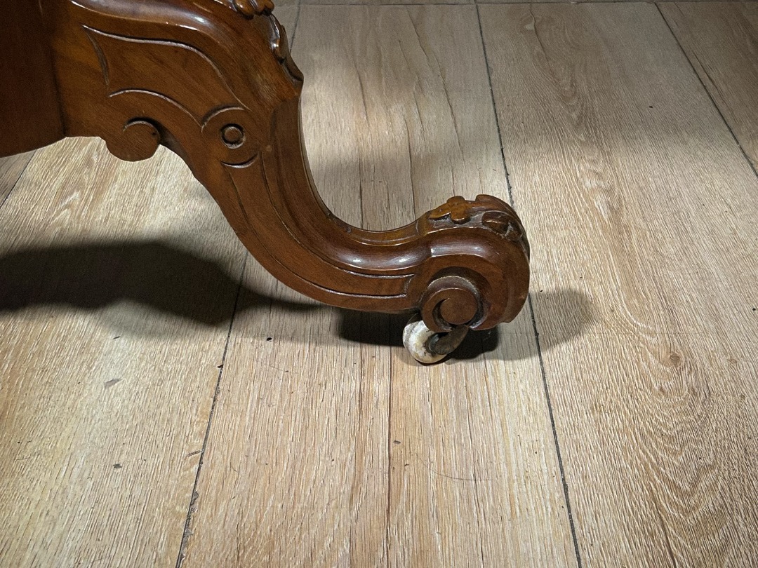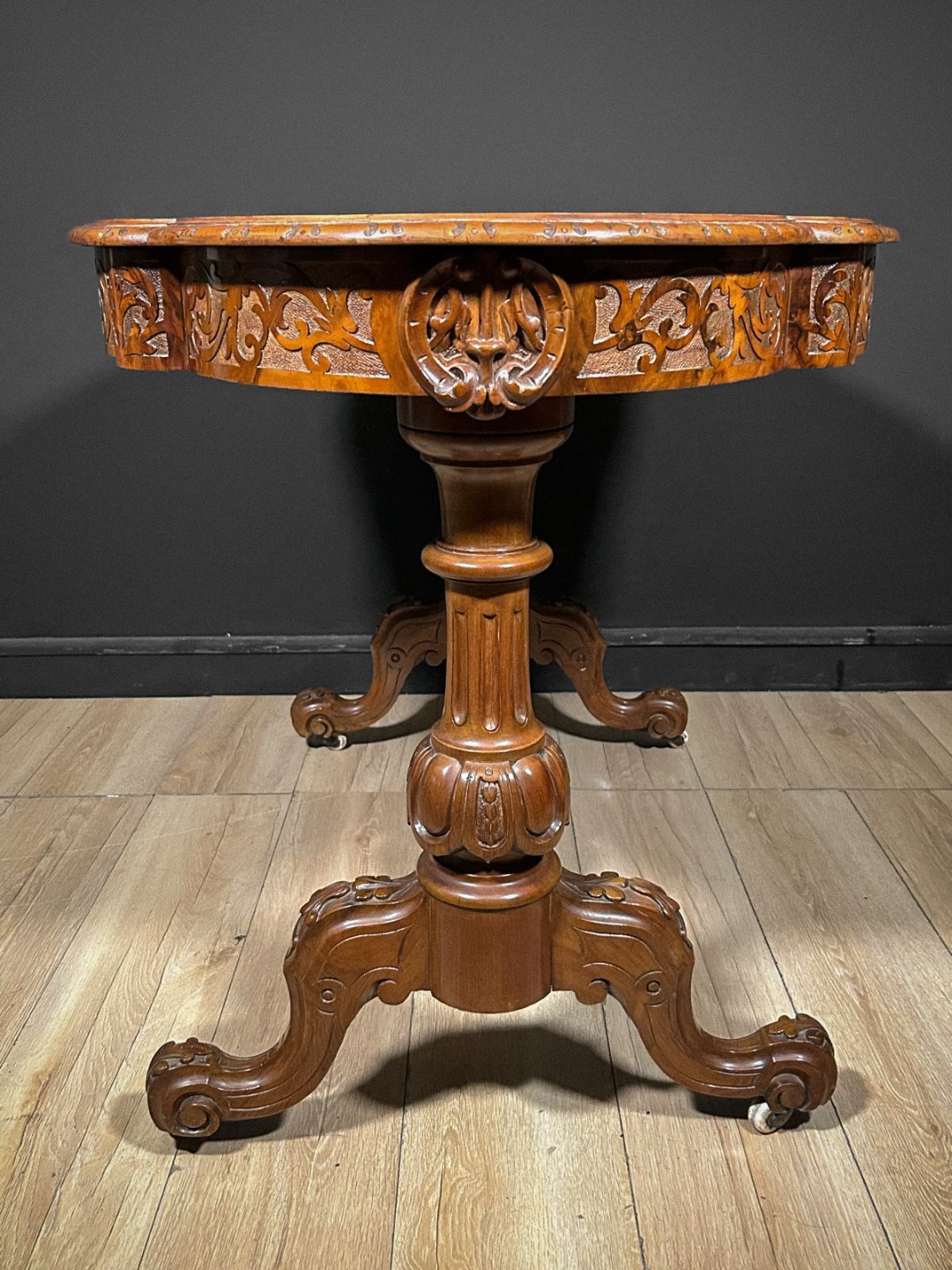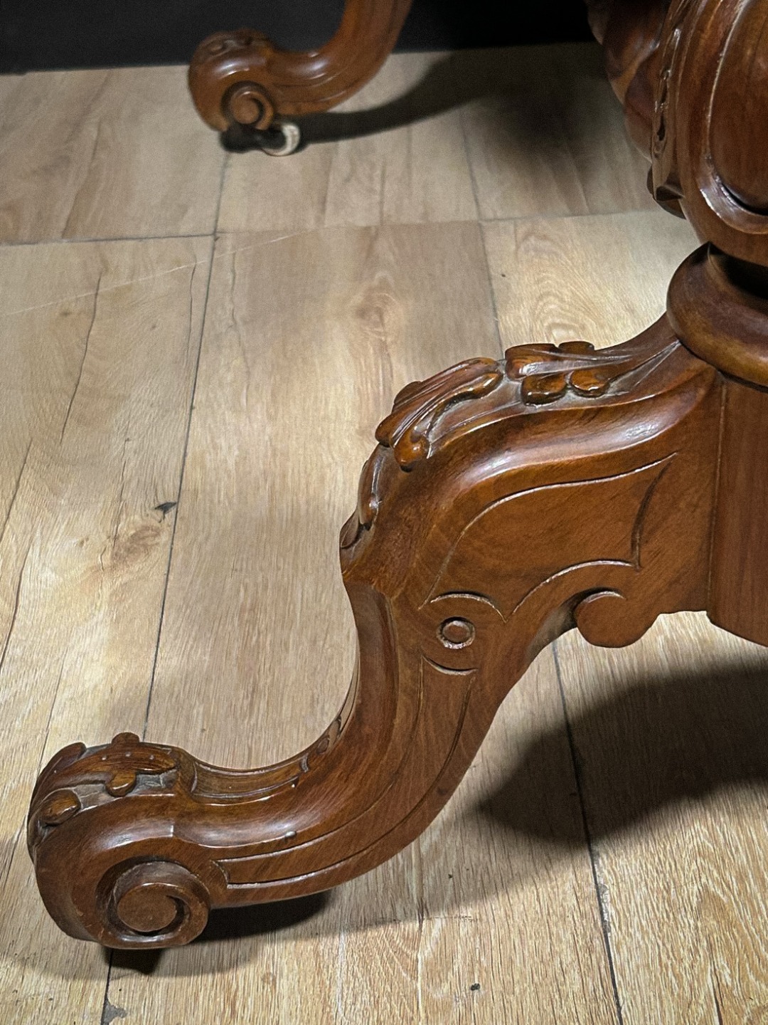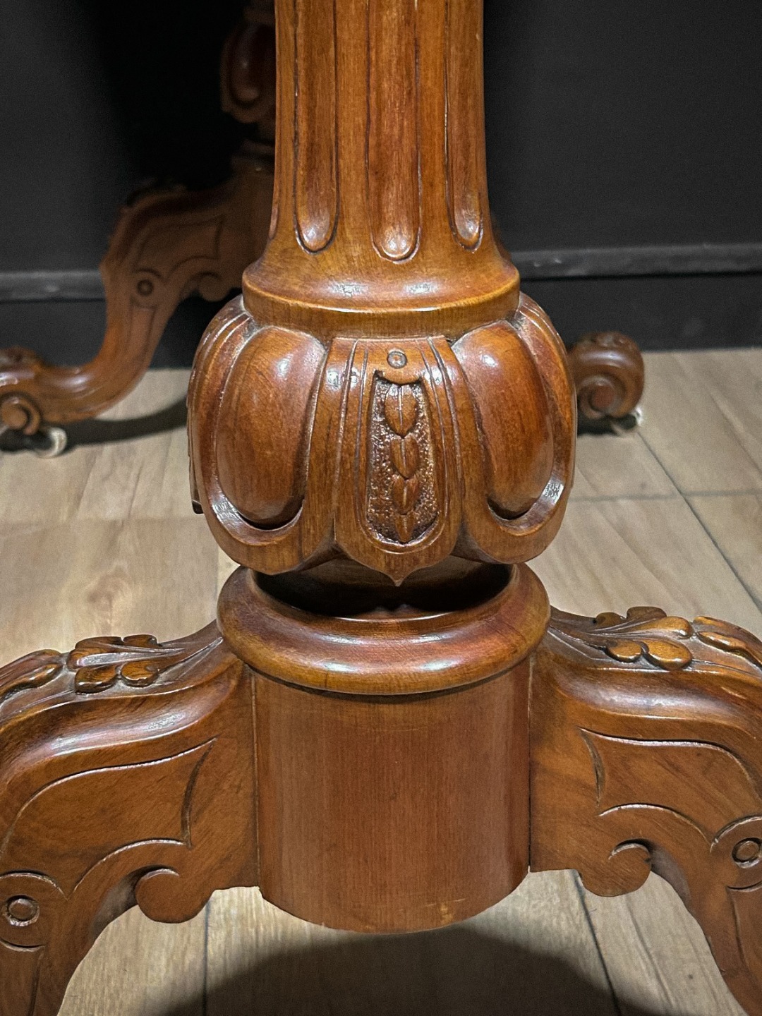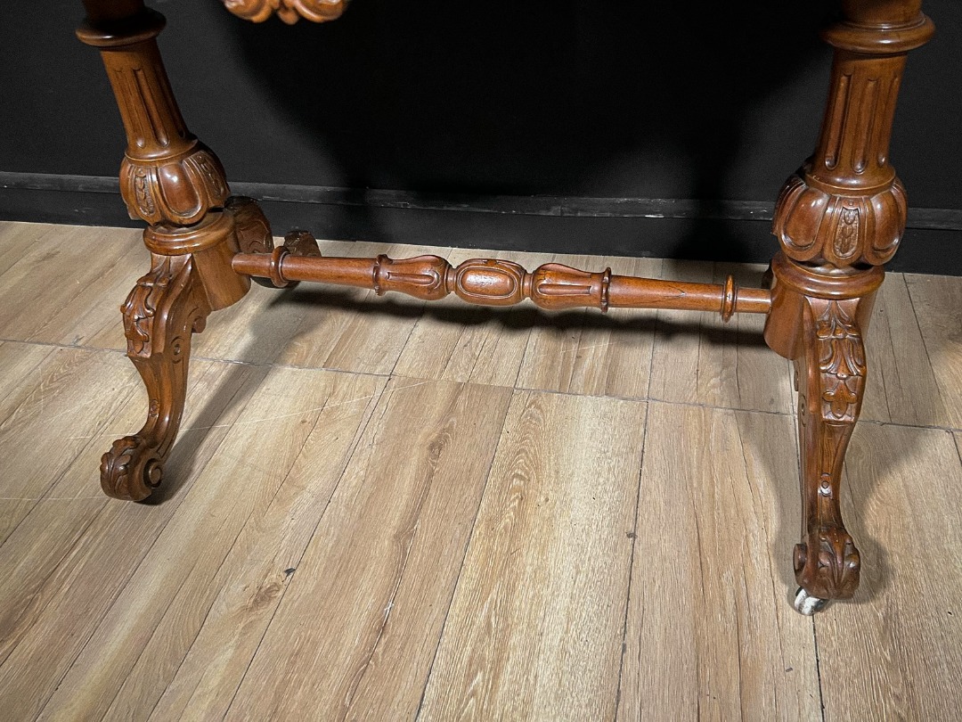 Il mobile presenta inoltre due cassetti laterali ad apertura contrapposta, perfettamente integrati nel profilo del piano, utili per riporre piccoli oggetti o strumenti da scrittoio. La base poggia su un robusto fusto tornito e scolpito, impreziosito da motivi a baccellatura e intagli ornamentali. Da esso si diramano tre gambe sinuose, anch’esse riccamente lavorate, terminate con rotelle originali che ne facilitano lo spostamento.