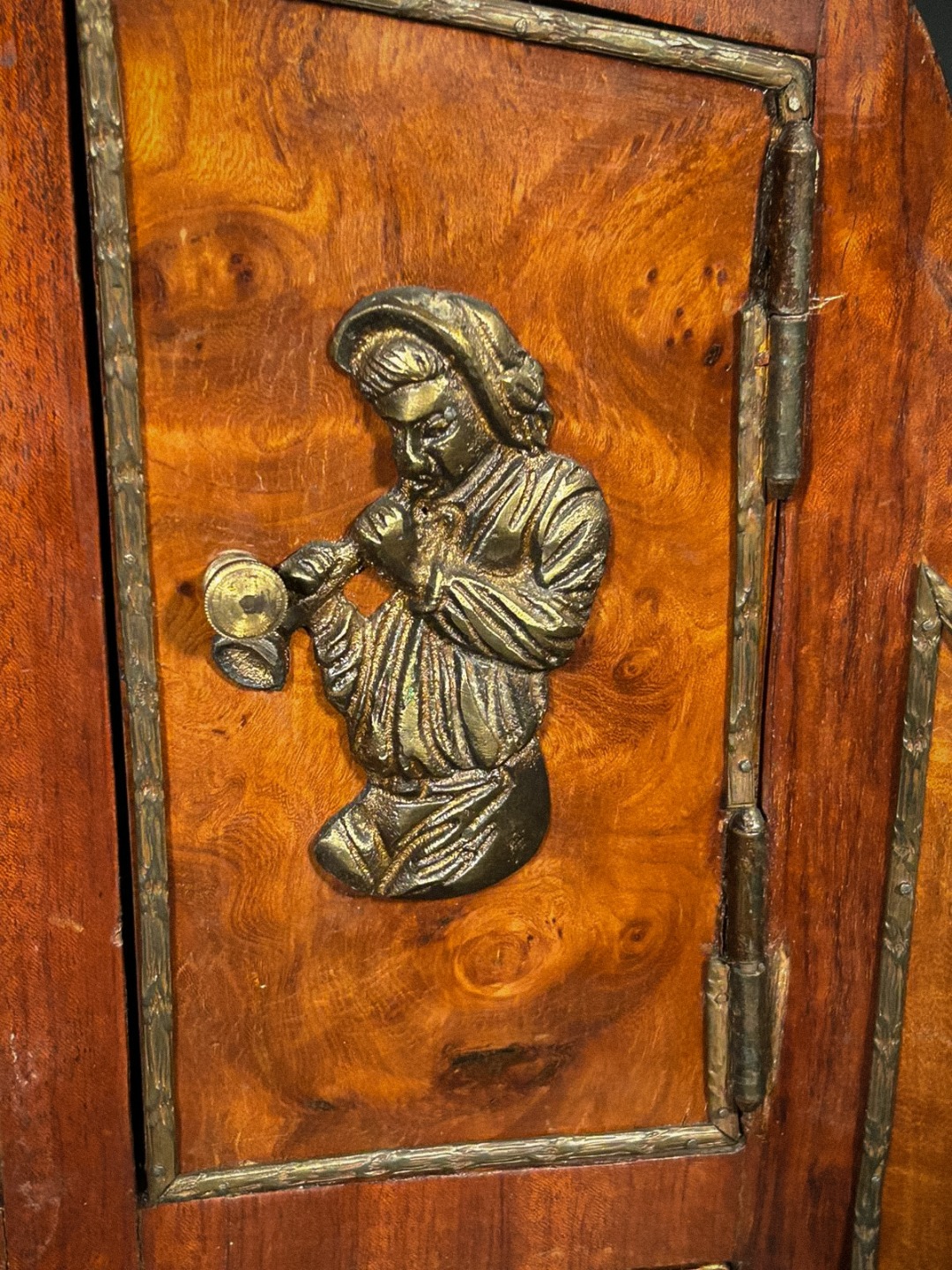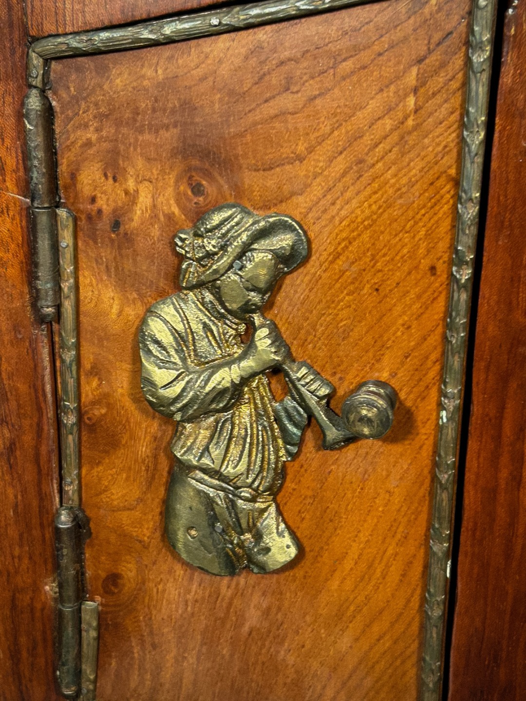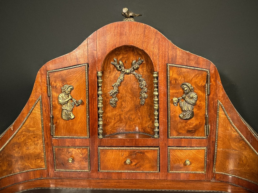 La parte superiore è arricchita da un alzata sagomata con piccolo cimiero scolpito e applicazione in bronzo raffigurante un uccello. All’interno si trovano sportellini laterali, cassetti di varie dimensioni e una nicchia centrale ornata da colonne tortili e ghirlande decorative, il tutto arricchito da figure in bronzo rappresentanti musicisti.