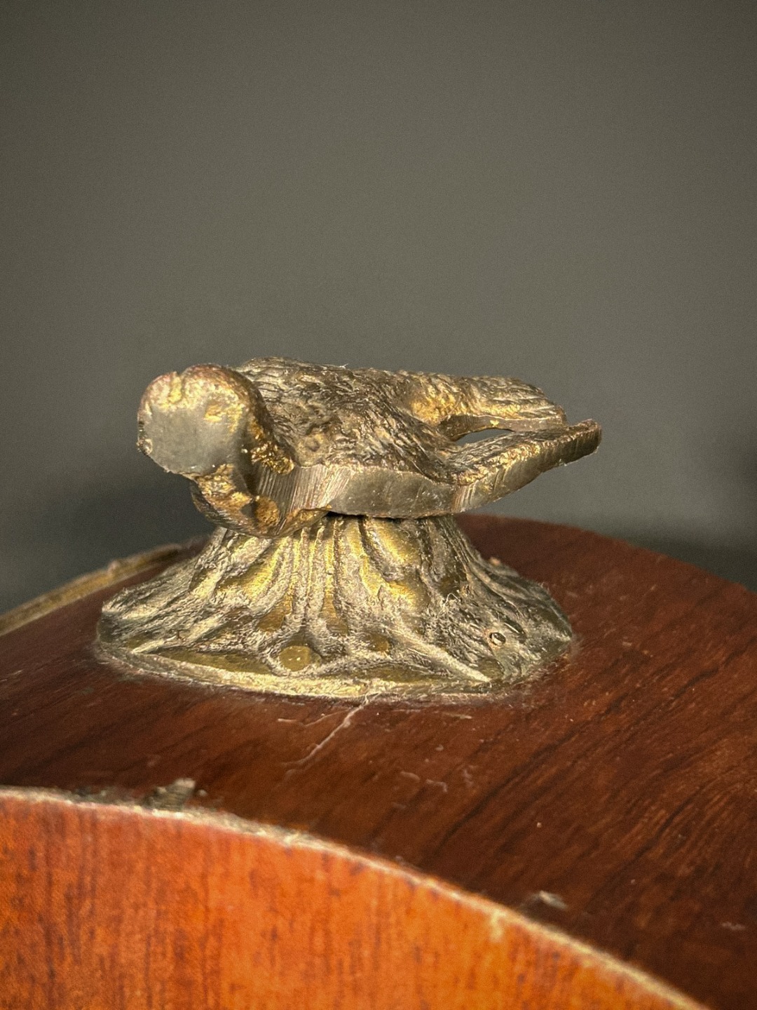 Il piano presenta un inserto in pelle con filetto dorato, incassato tra bordature in essenza pregiata. Le gambe, arcuate e slanciate, sono decorate da ulteriori applicazioni bronzee che completano l’estetica elegante e ricercata del mobile.