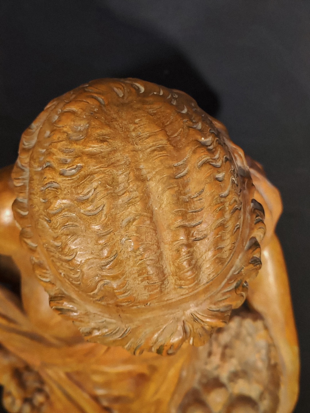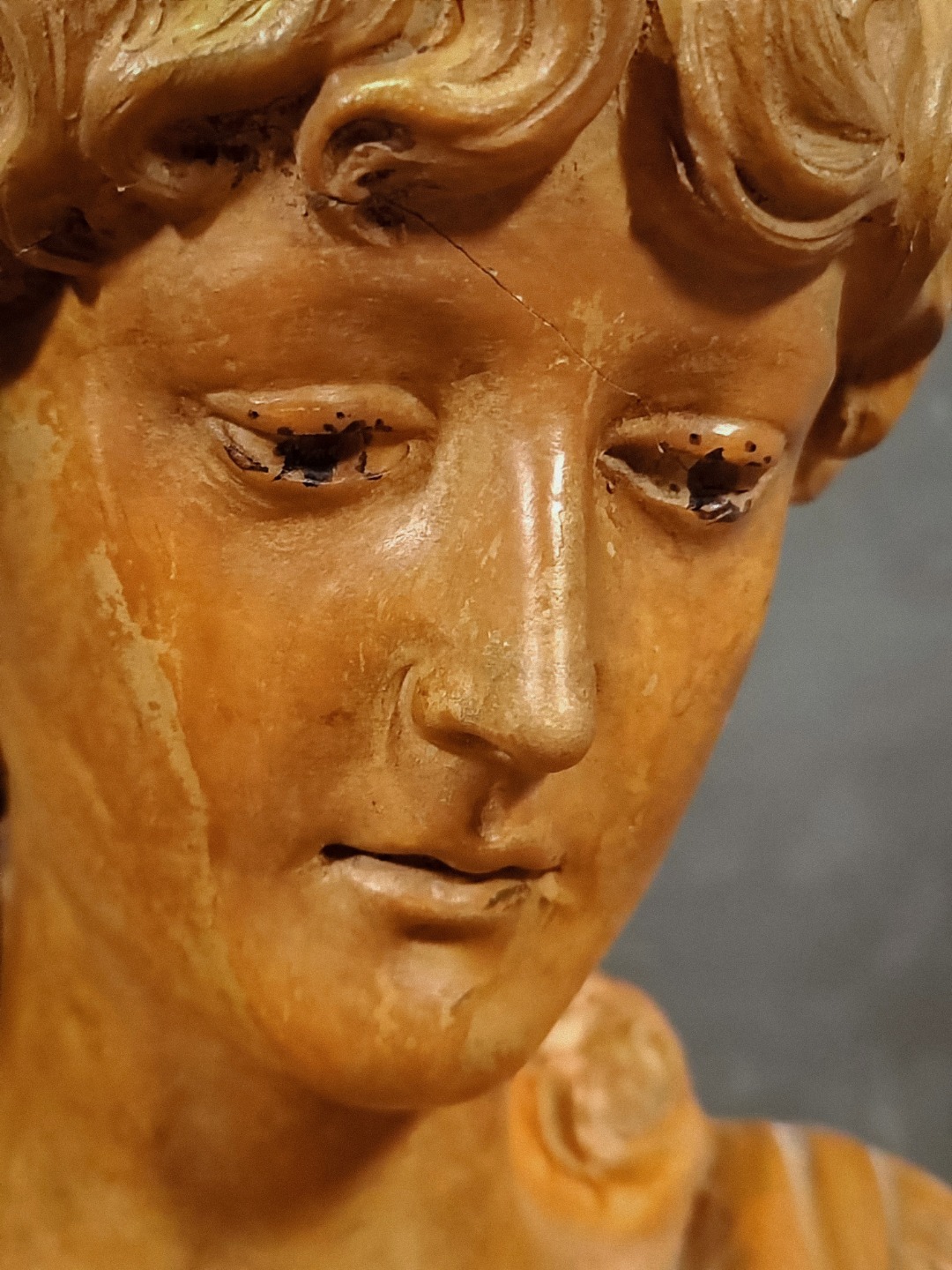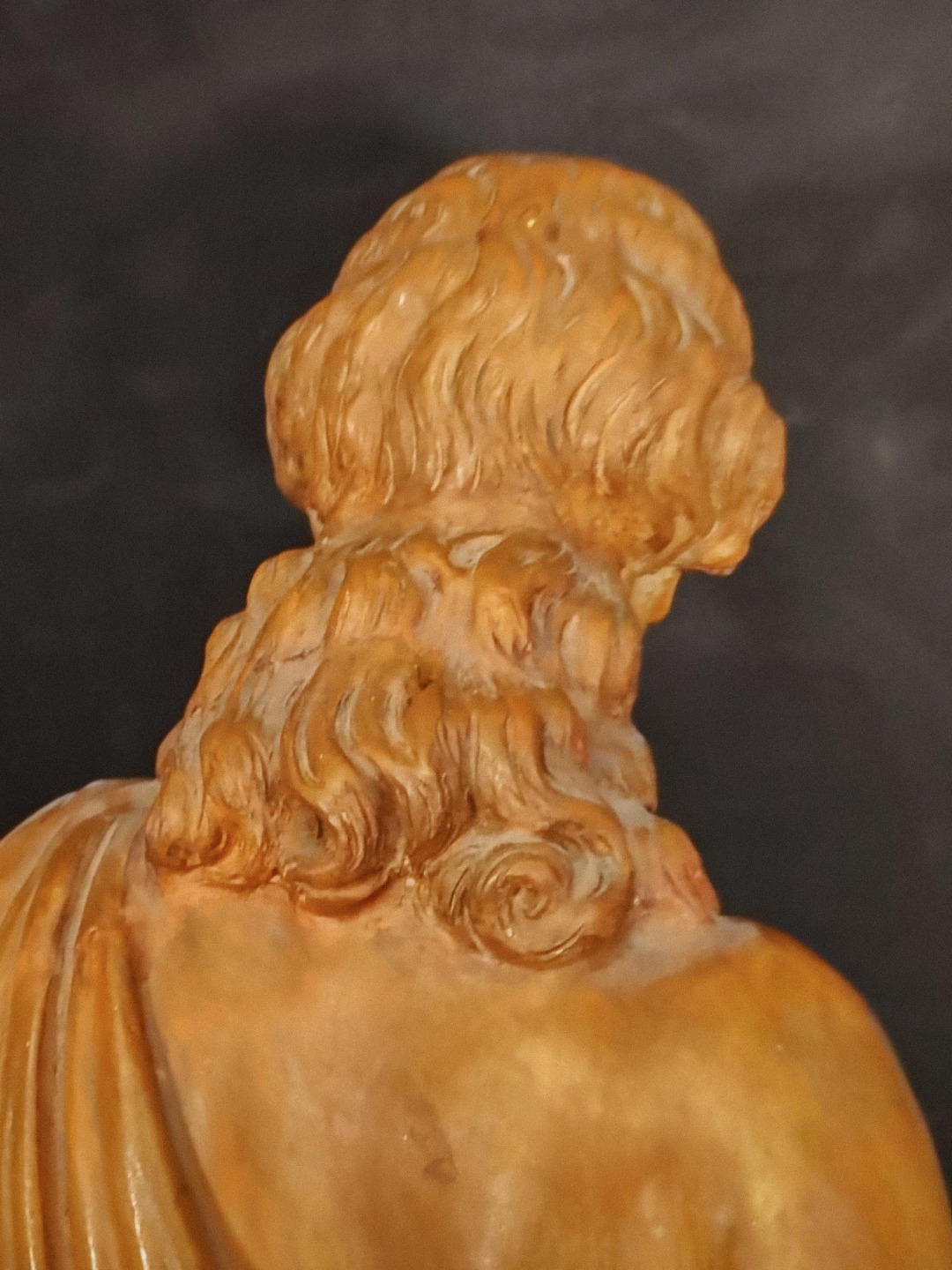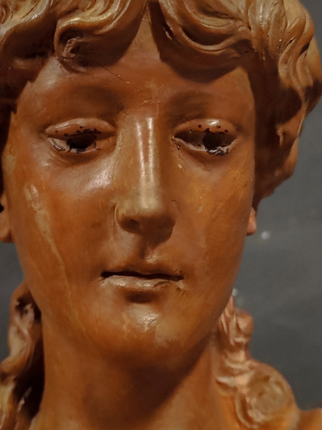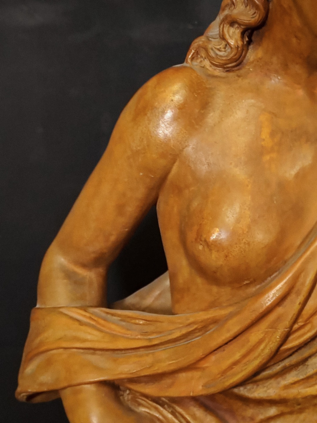 La terracotta patinata conferisce calore e matericità alla superficie, valorizzando il modellato e la presenza scultorea dell’opera. Ideale per ambienti classici, gallerie, ingressi eleganti o collezioni d’arte figurativa.