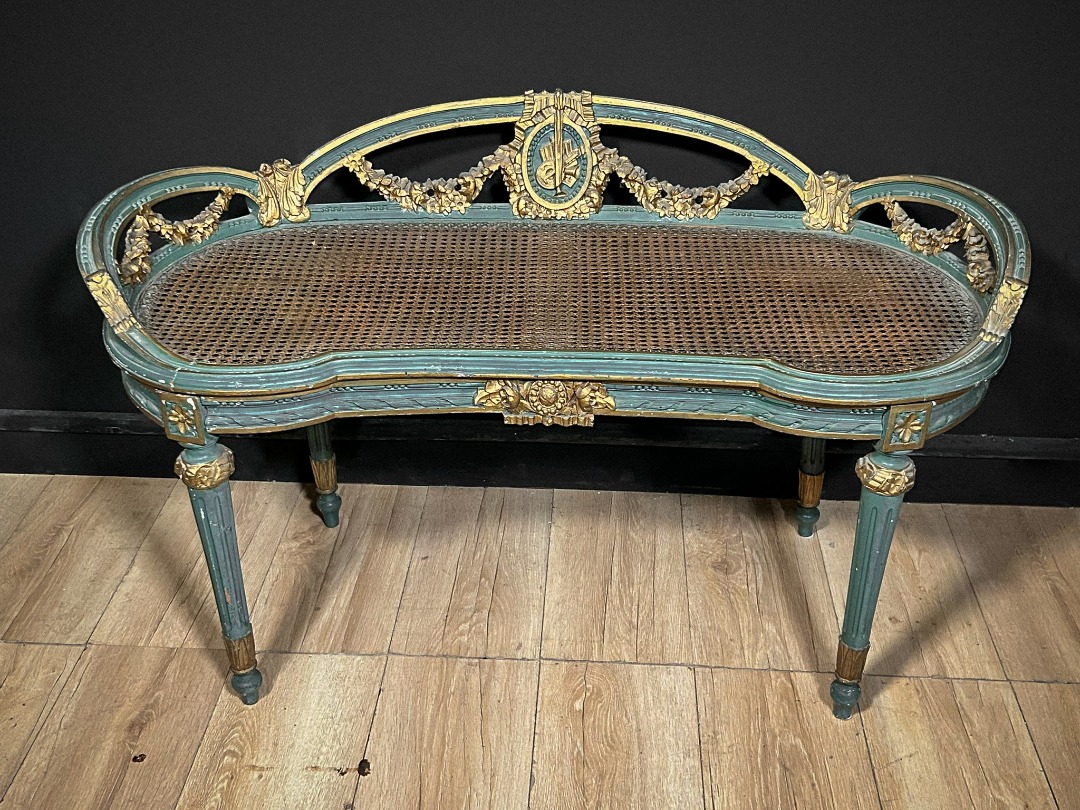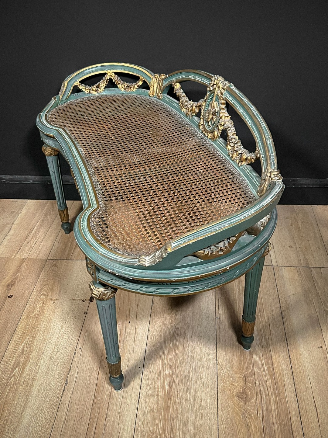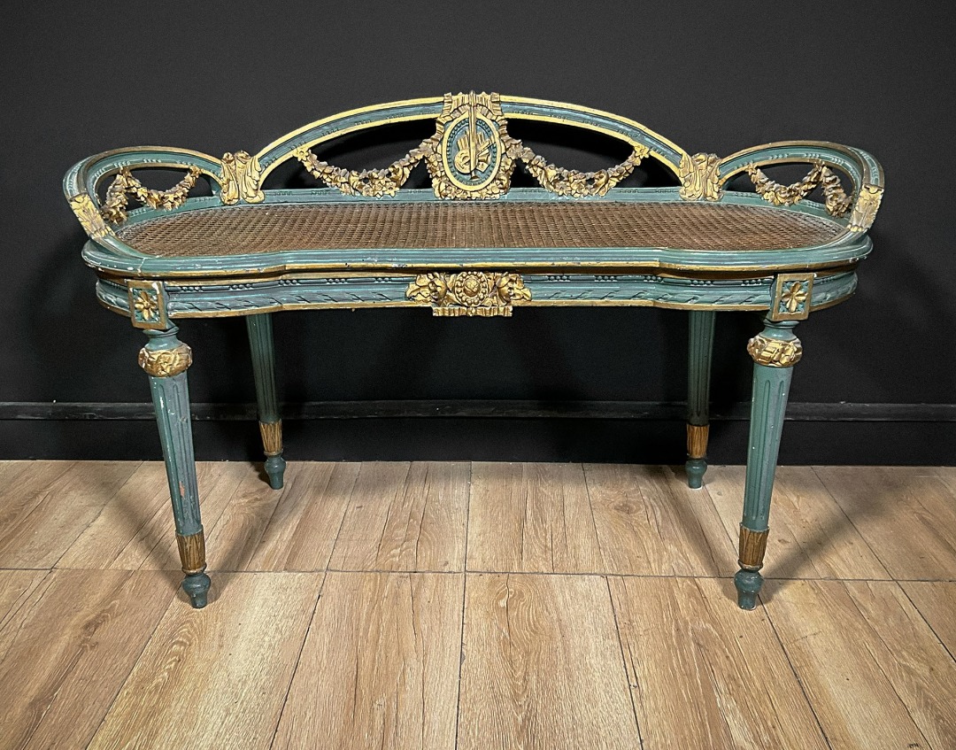 Elegante panchetta francese in stile Luigi XVI, risalente all’epoca Napoleone III, finemente laccata in verde acqua e arricchita da dettagli dorati applicati a foglia. La struttura, dal profilo mosso e armonioso, presenta una seduta in paglia di Vienna originale, perfettamente integrata nel disegno leggero e raffinato del mobile.
