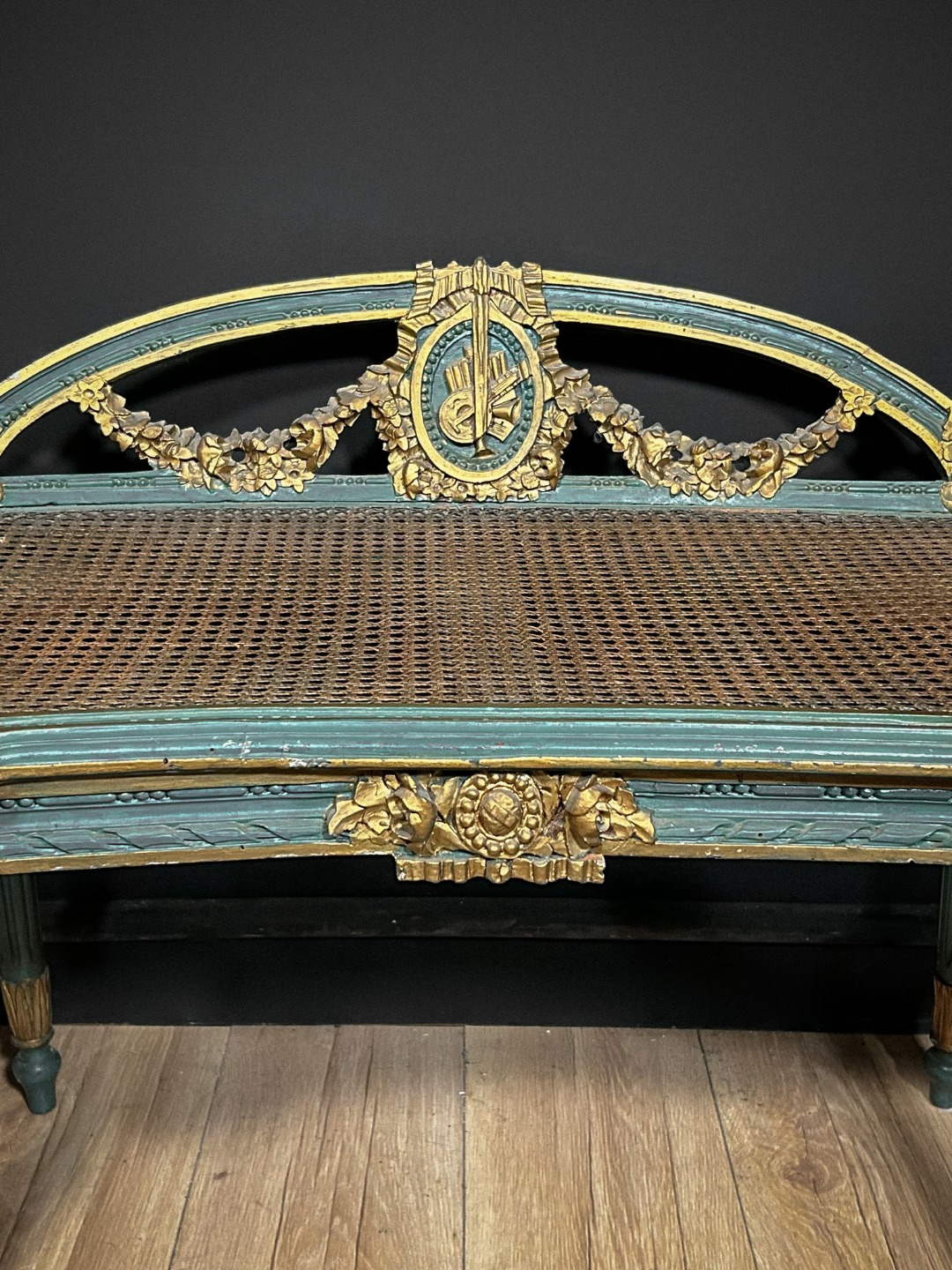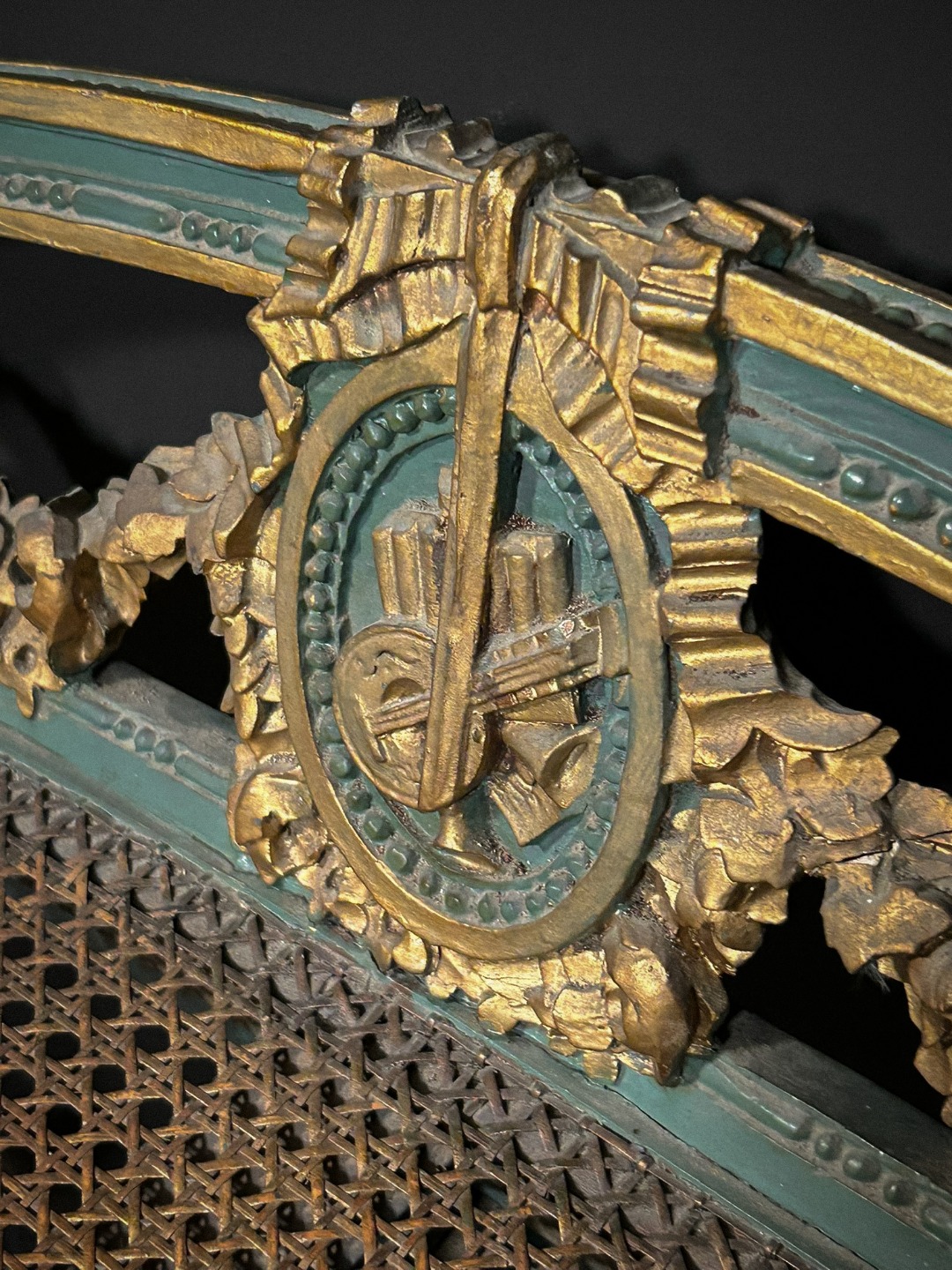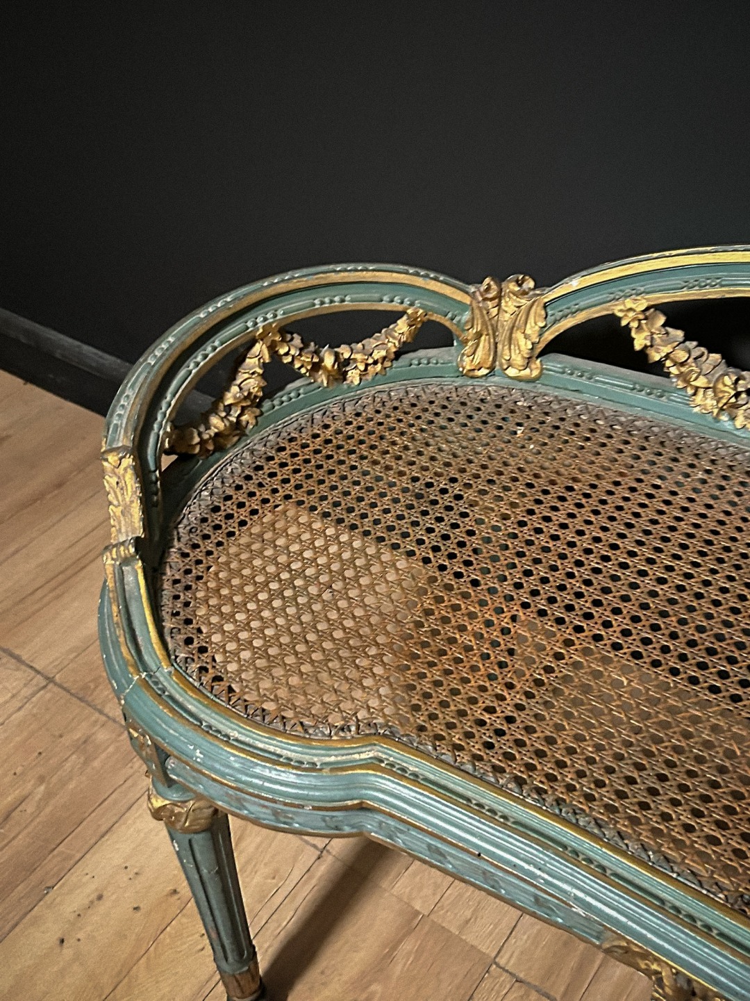 Elegante panchetta francese in stile Luigi XVI, risalente all’epoca Napoleone III, finemente laccata in verde acqua e arricchita da dettagli dorati applicati a foglia. La struttura, dal profilo mosso e armonioso, presenta una seduta in paglia di Vienna originale, perfettamente integrata nel disegno leggero e raffinato del mobile.