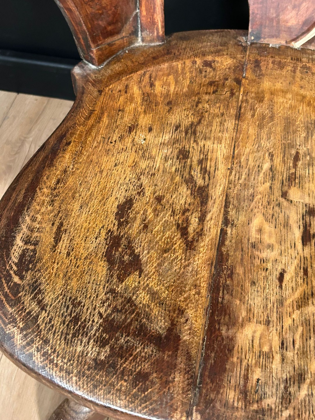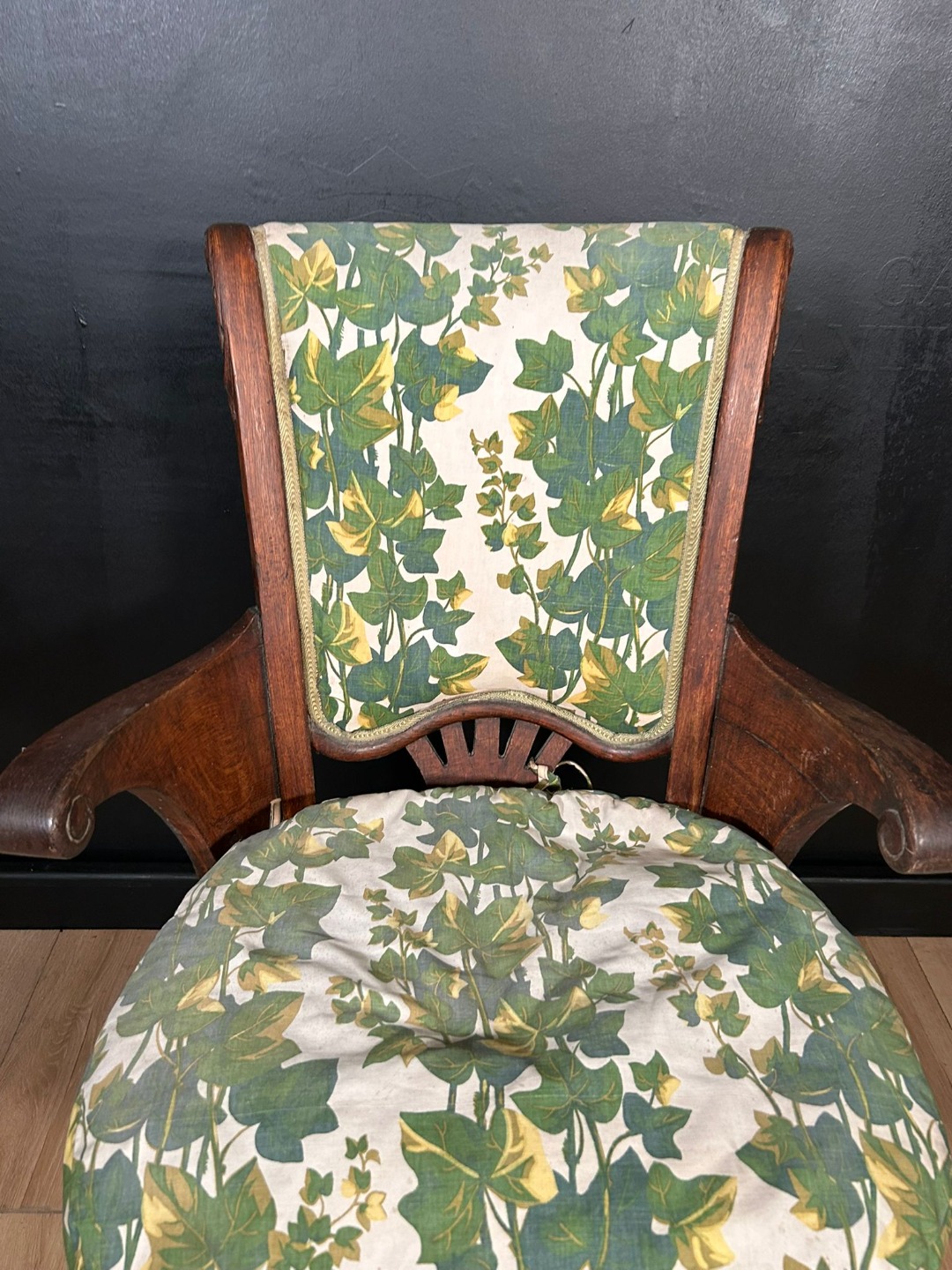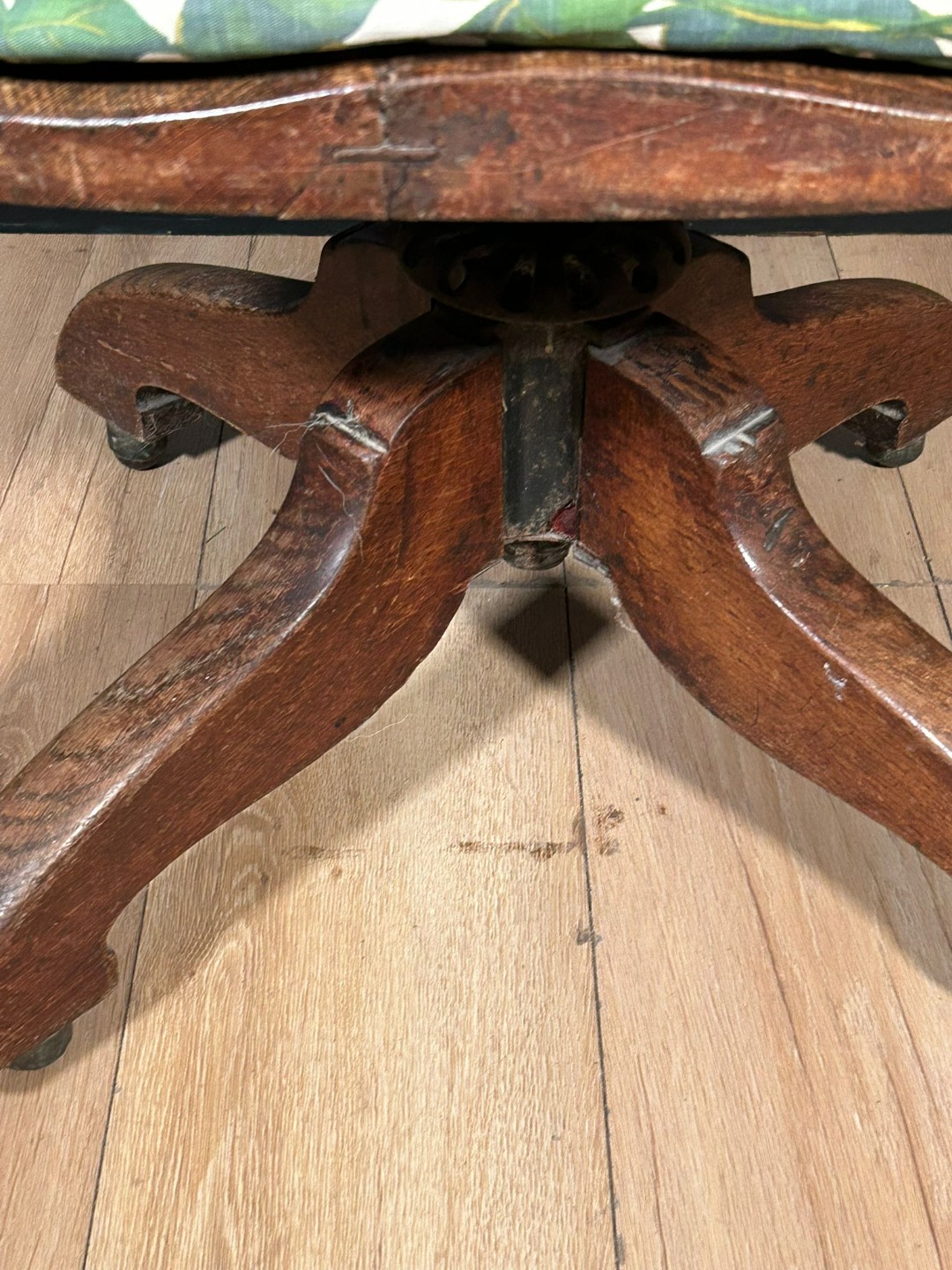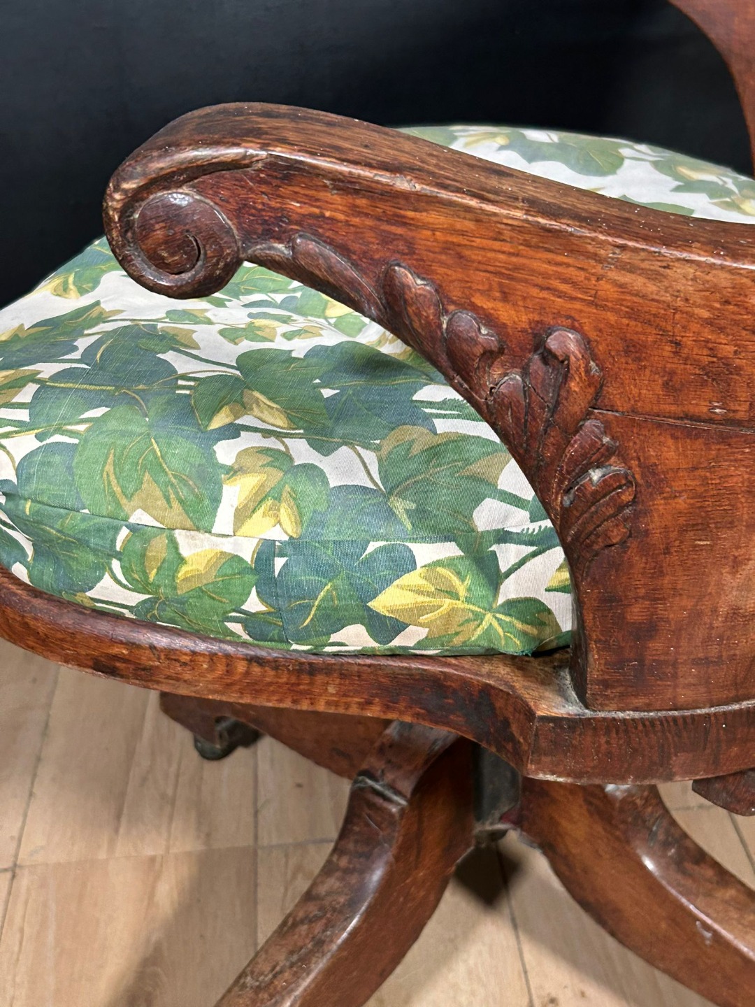 Antica sedia girevole realizzata in legni pregiati, caratterizzata da una solida struttura con base centrale a quattro piedi sagomati, tipica delle sedute di rappresentanza tra fine Ottocento e inizi Novecento. La seduta è ampia e confortevole, montata su meccanismo girevole originale, elemento funzionale che arricchisce il valore e l’interesse del pezzo. Lo schienale presenta una linea leggermente sagomata con sostegno centrale intagliato, mentre i braccioli sono dolcemente mossi e raccordati alla struttura con eleganti volute. L’imbottitura, rivestita in tessuto a motivi vegetali, valorizza il profilo della sedia e ne esalta l’aspetto decorativo, mantenendo un piacevole equilibrio tra funzionalità ed estetica. Una seduta di grande carattere, ideale per studi, scrivanie antiche o ambienti classici.