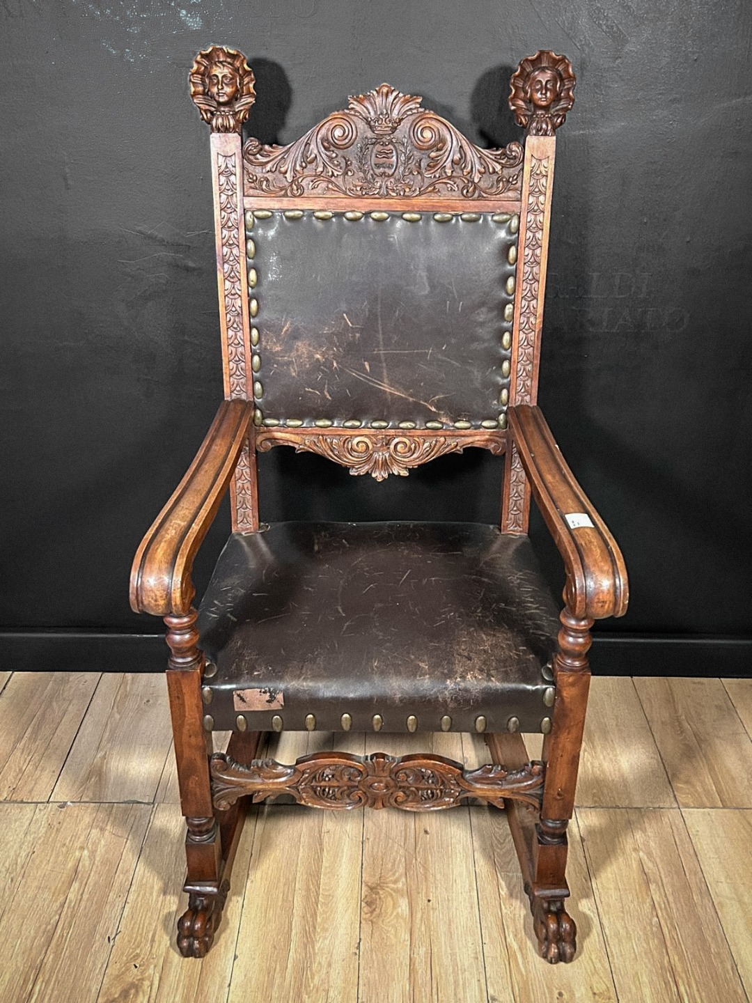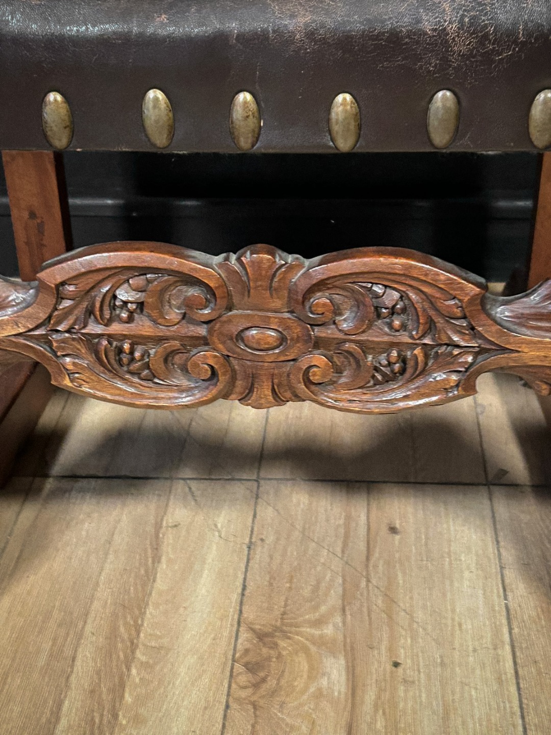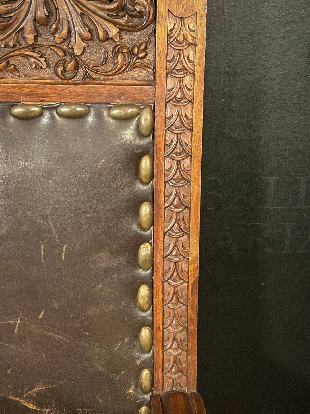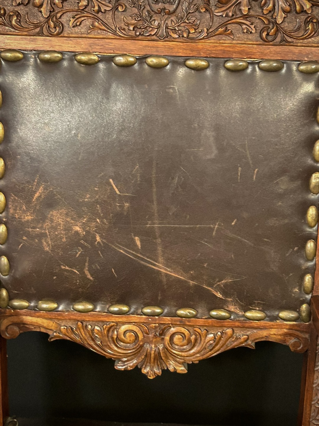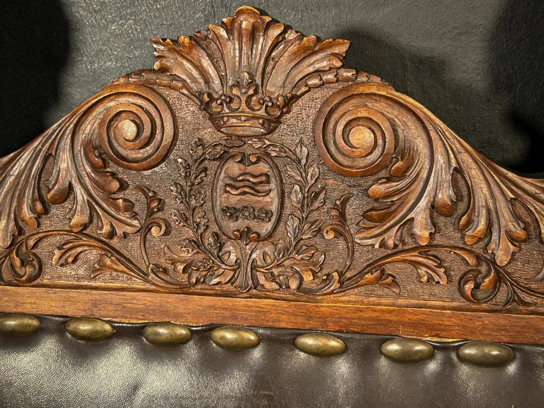 Lo schienale presenta una profusione di intagli con volute, fogliami e motivi decorativi di gusto rinascimentale, coronato da due teste scolpite poste alle sommità dei montanti, eseguite con notevole perizia artigianale. La seduta e lo schienale sono rivestiti in cuoio originale fissato con borchie in ottone, che conferiscono al pezzo un aspetto importante e autentico.