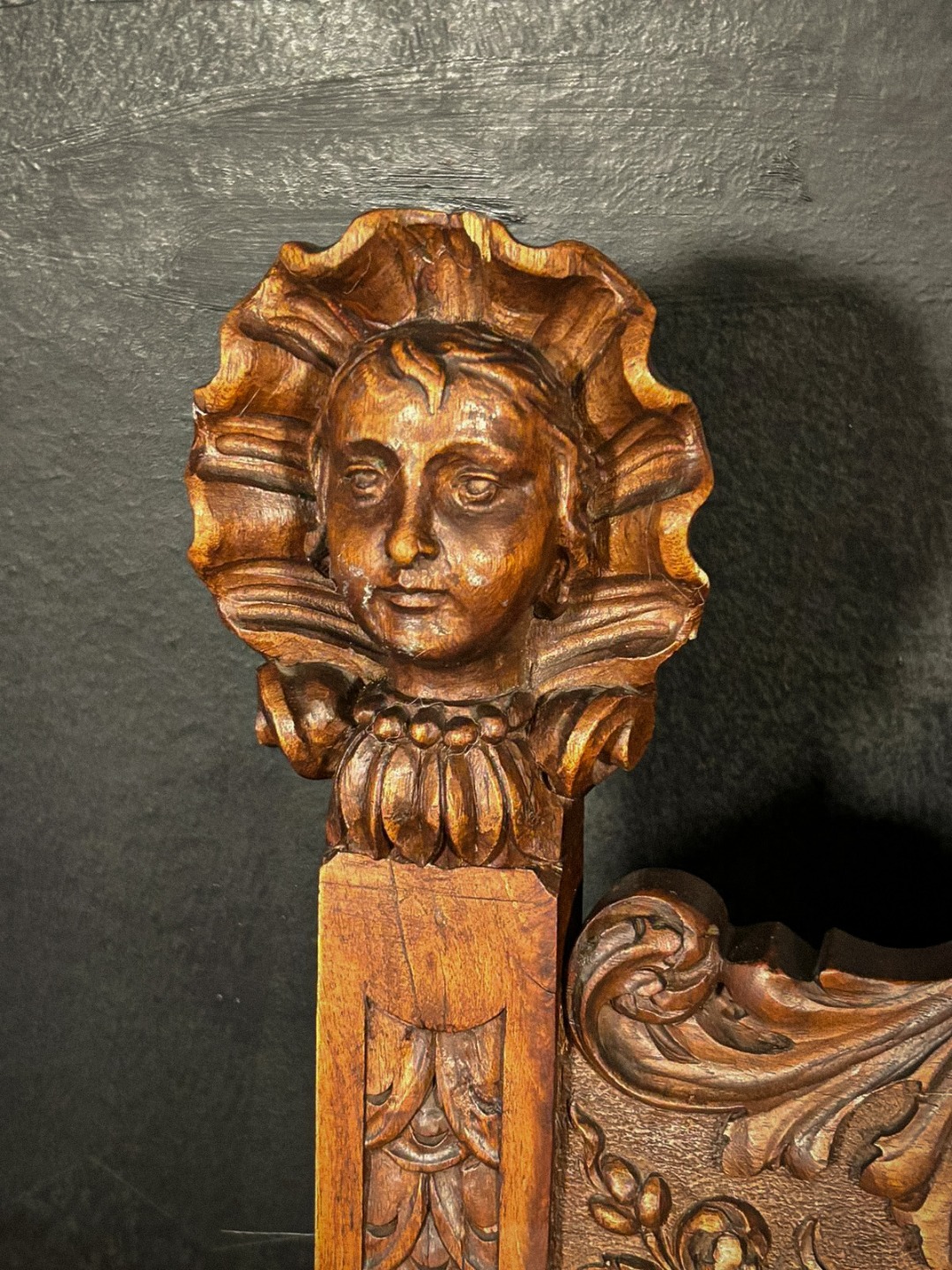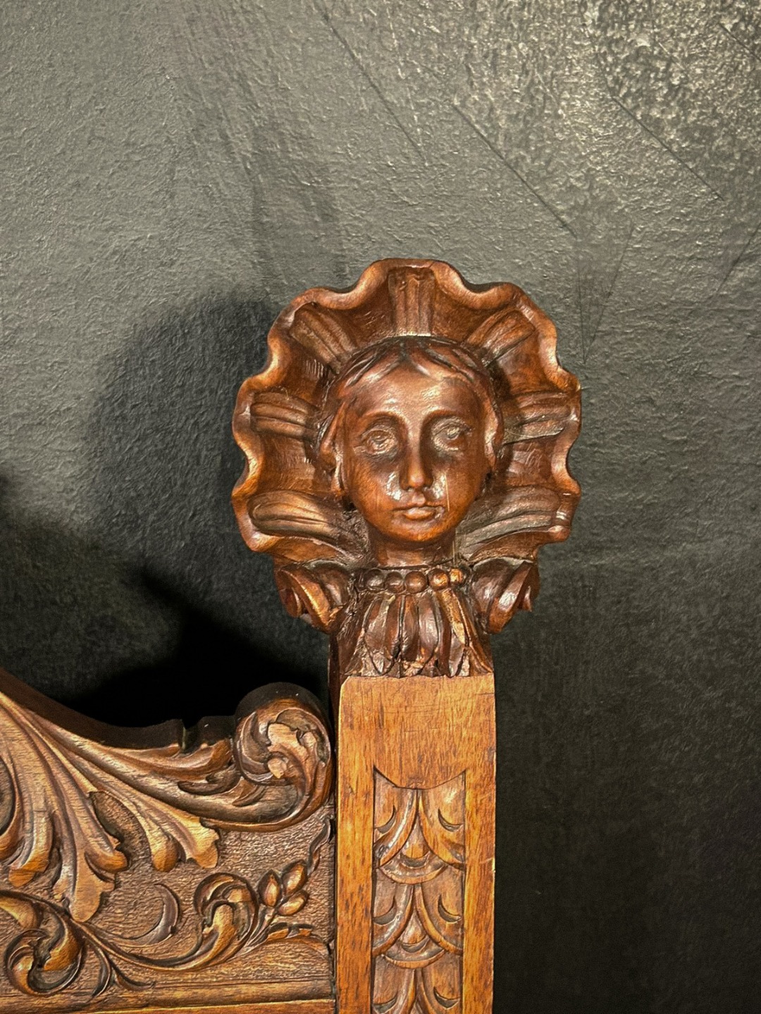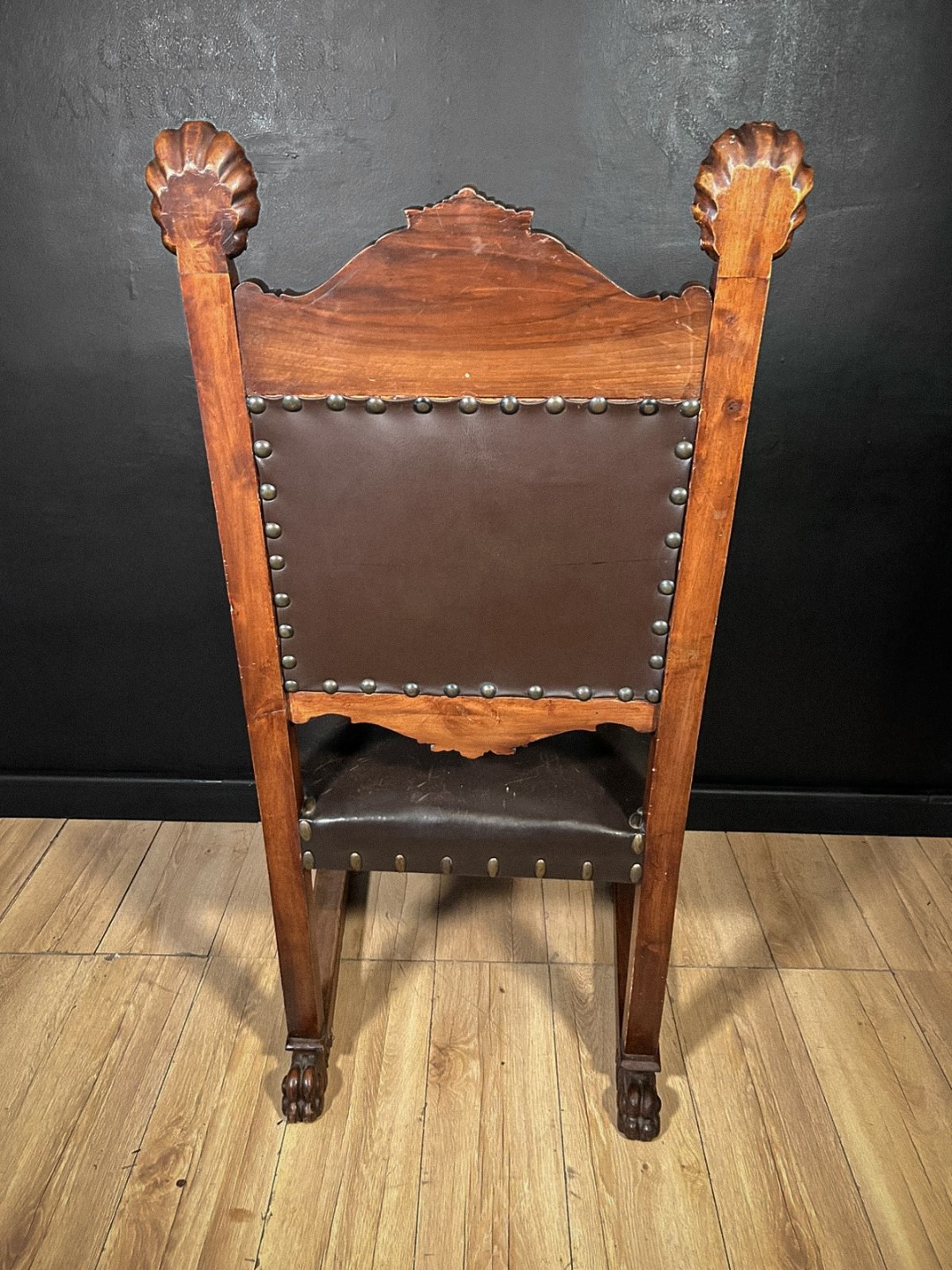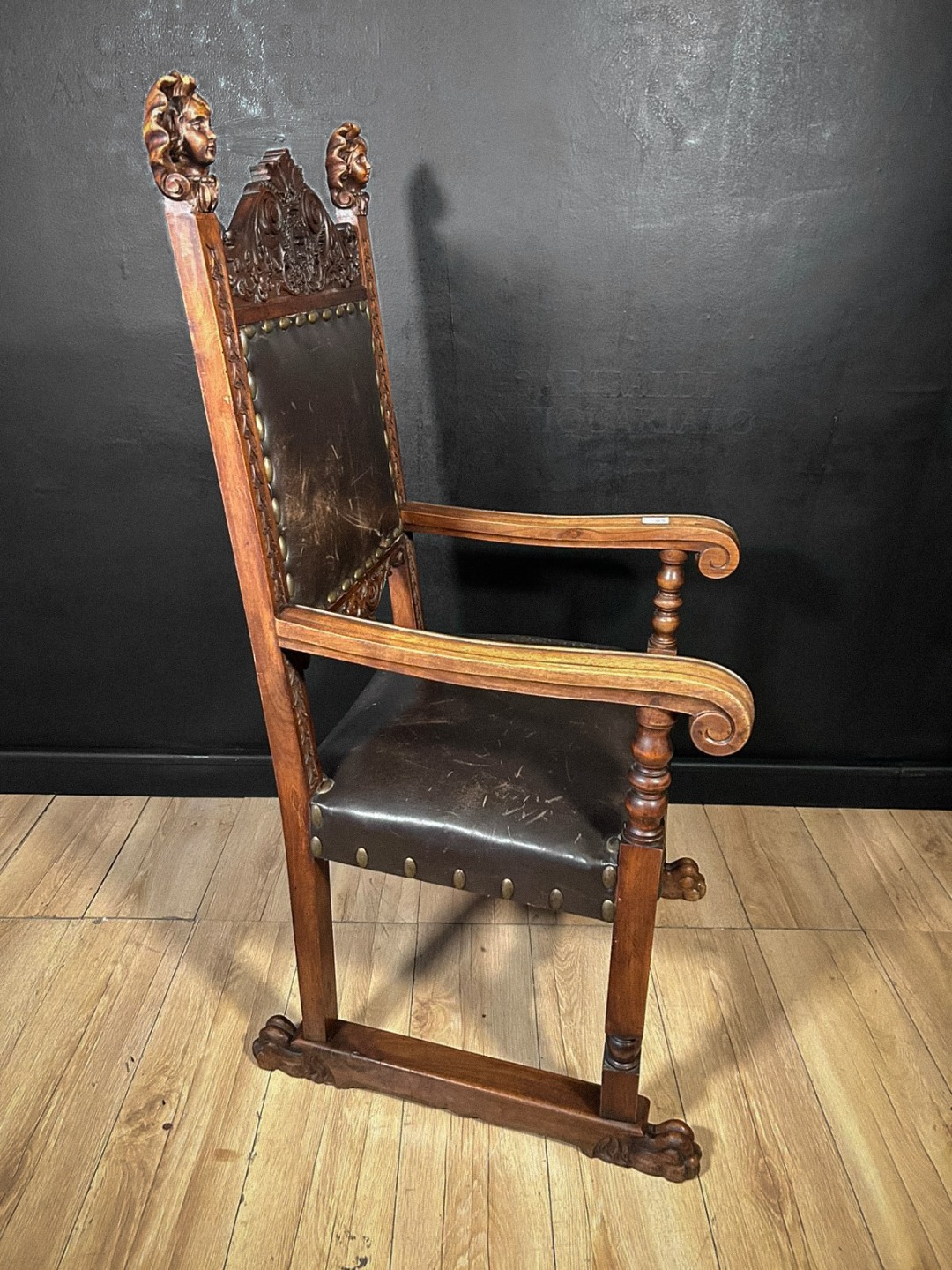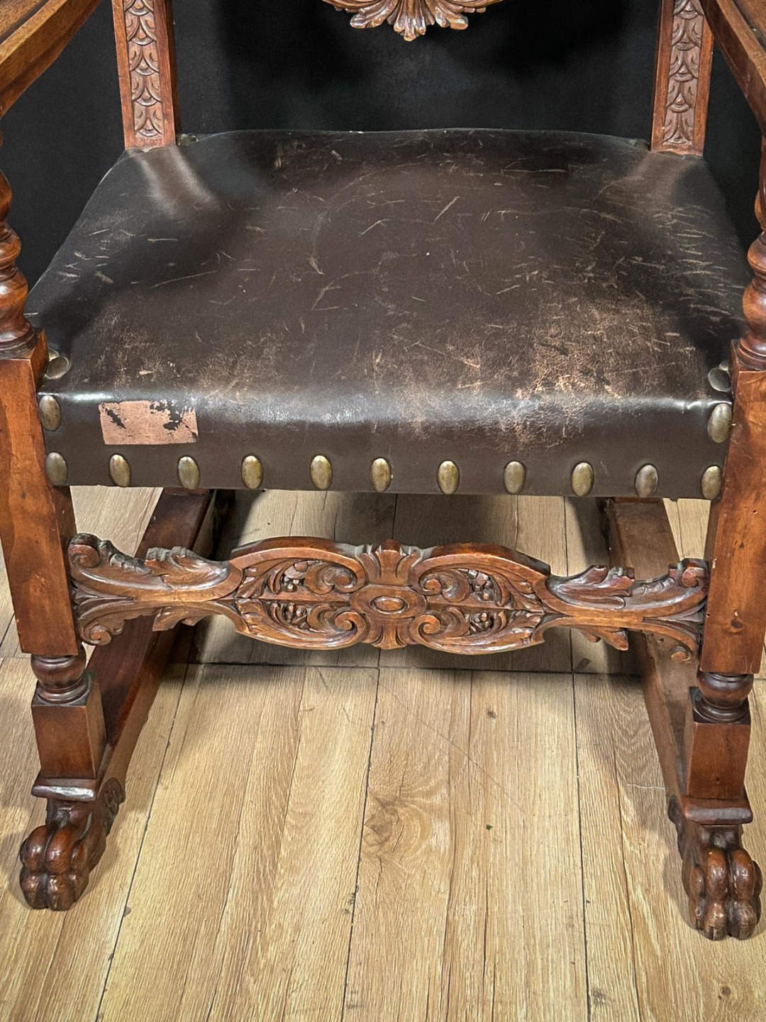 Lo schienale presenta una profusione di intagli con volute, fogliami e motivi decorativi di gusto rinascimentale, coronato da due teste scolpite poste alle sommità dei montanti, eseguite con notevole perizia artigianale. La seduta e lo schienale sono rivestiti in cuoio originale fissato con borchie in ottone, che conferiscono al pezzo un aspetto importante e autentico.