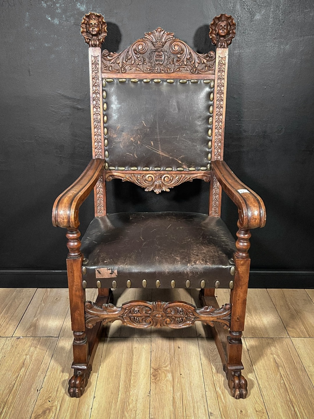 Importante poltrona italiana in noce massello, riccamente scolpita a mano, appartenente alla fine dell’Ottocento / inizi del Novecento.