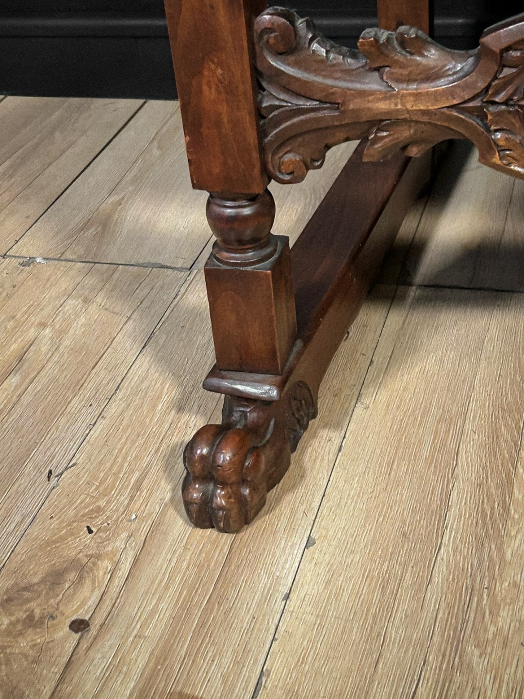 I braccioli, elegantemente scolpiti, poggiano su sostegni torniti, mentre la fascia anteriore presenta un ricco decoro traforato. I piedi ferini, finemente lavorati, completano l’estetica solida e scenografica della poltrona.