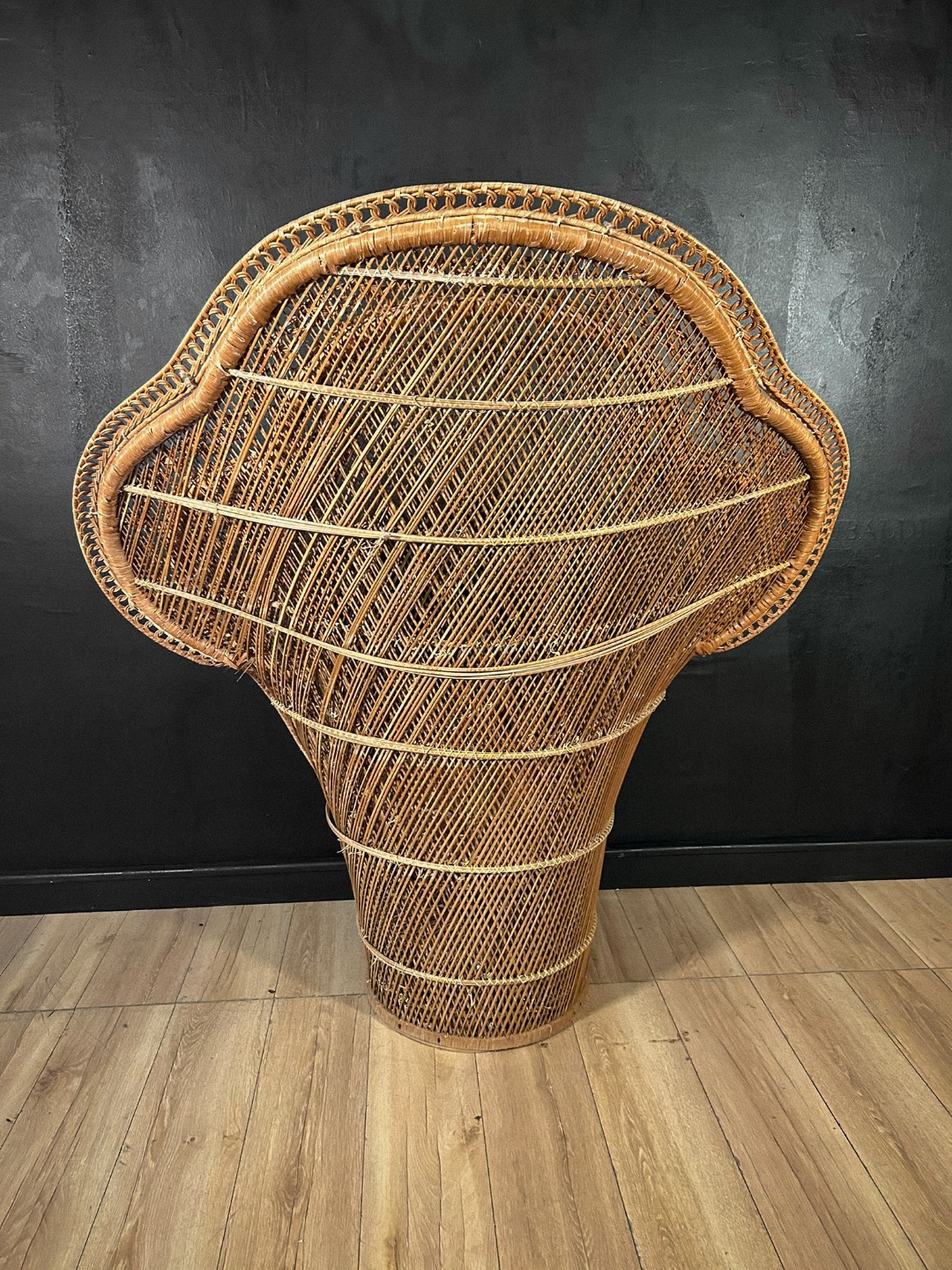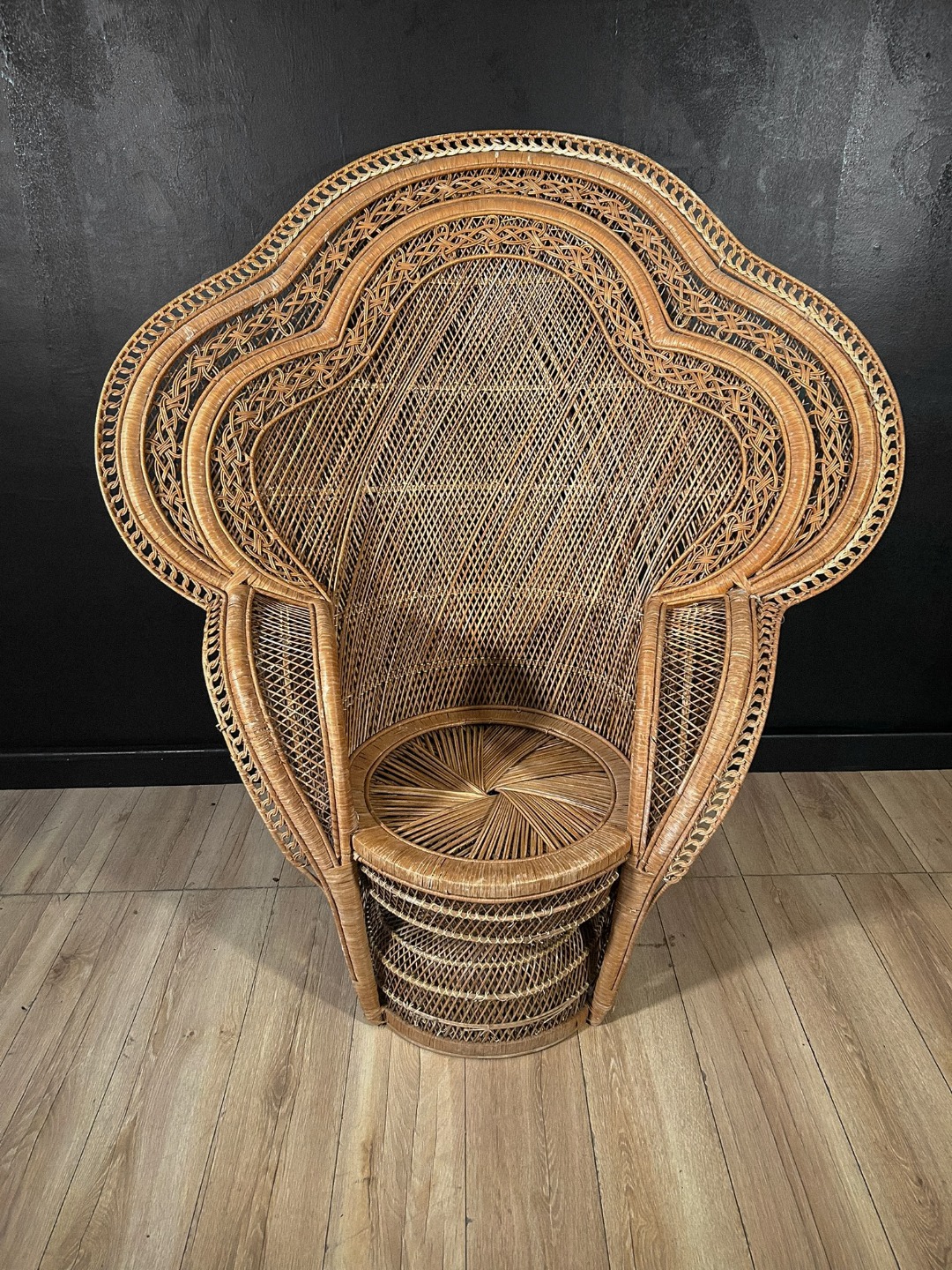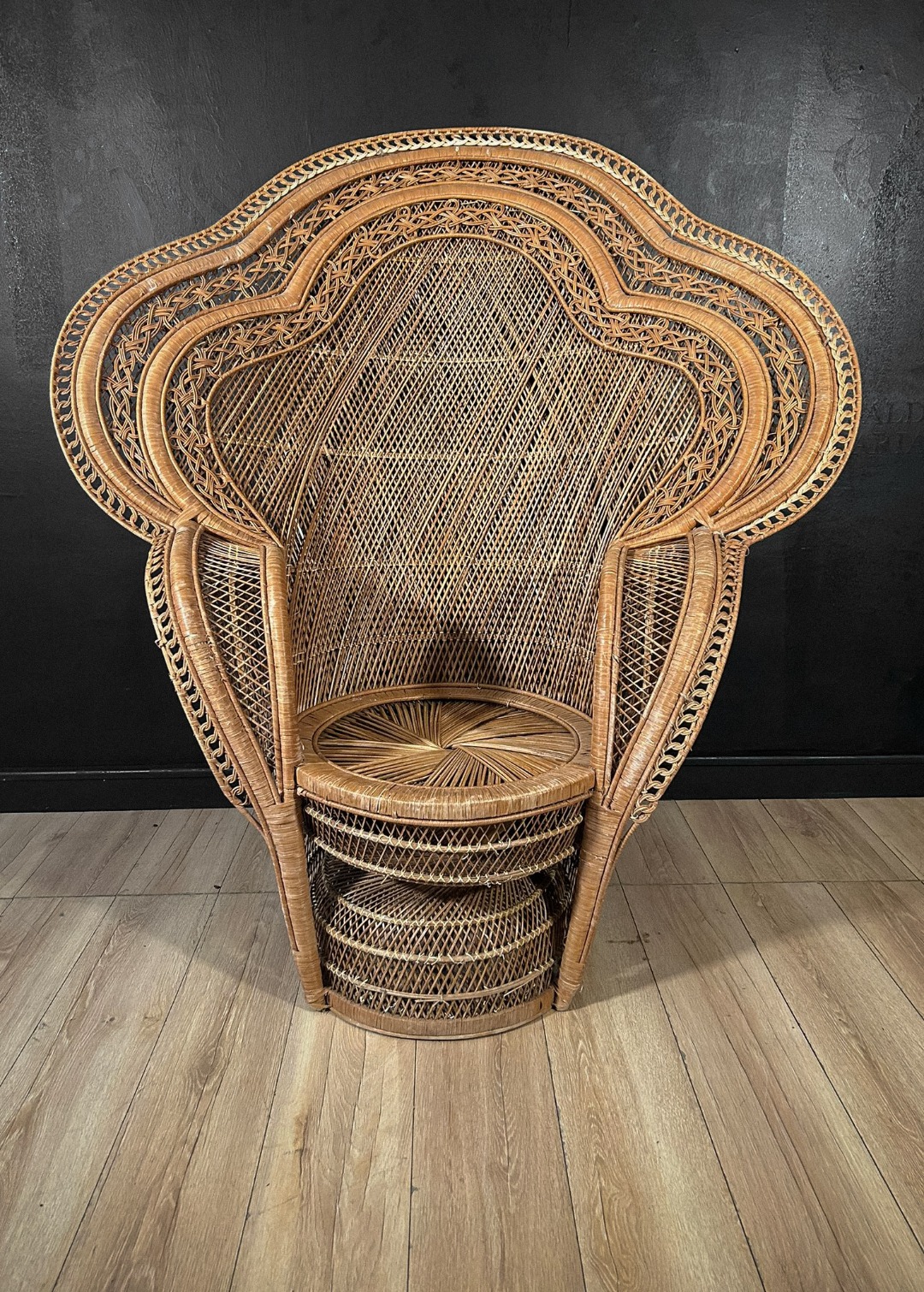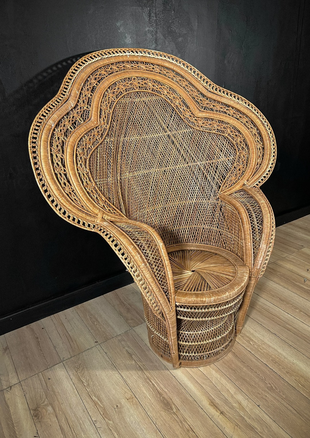 Importante poltrona scenografica realizzata interamente in vimini intrecciato, caratterizzata dal tipico schienale alto e avvolgente a ventaglio, noto come modello “Peacock”. La struttura presenta un elaborato lavoro artigianale a intreccio fitto, con cornici concentriche decorate da motivi geometrici e intrecci curvilinei, che conferiscono grande eleganza e forte impatto visivo.
