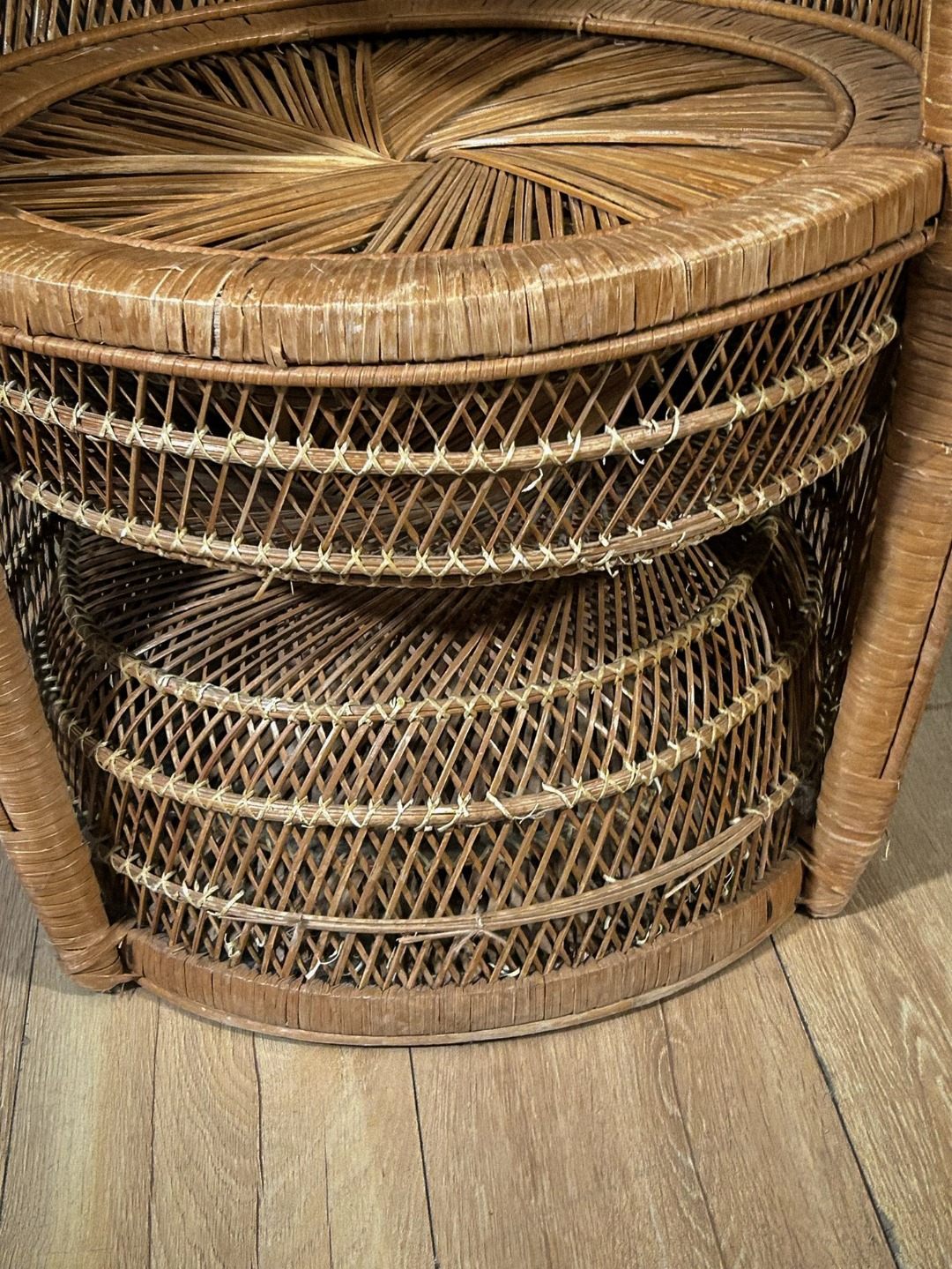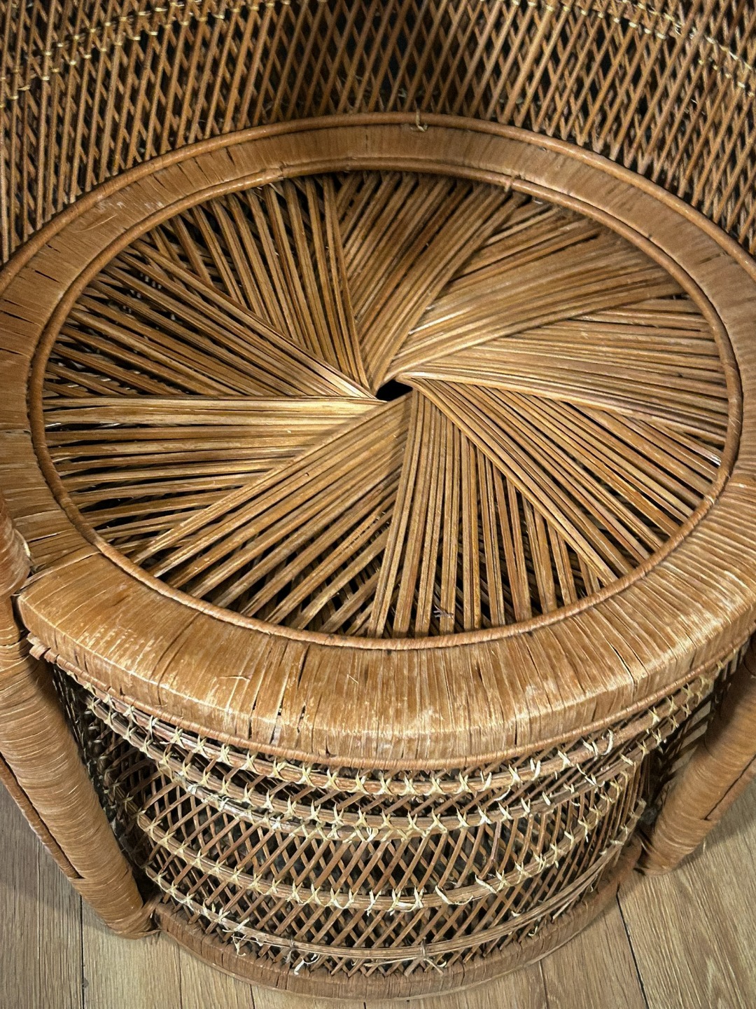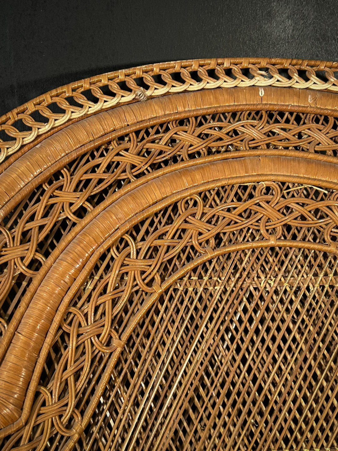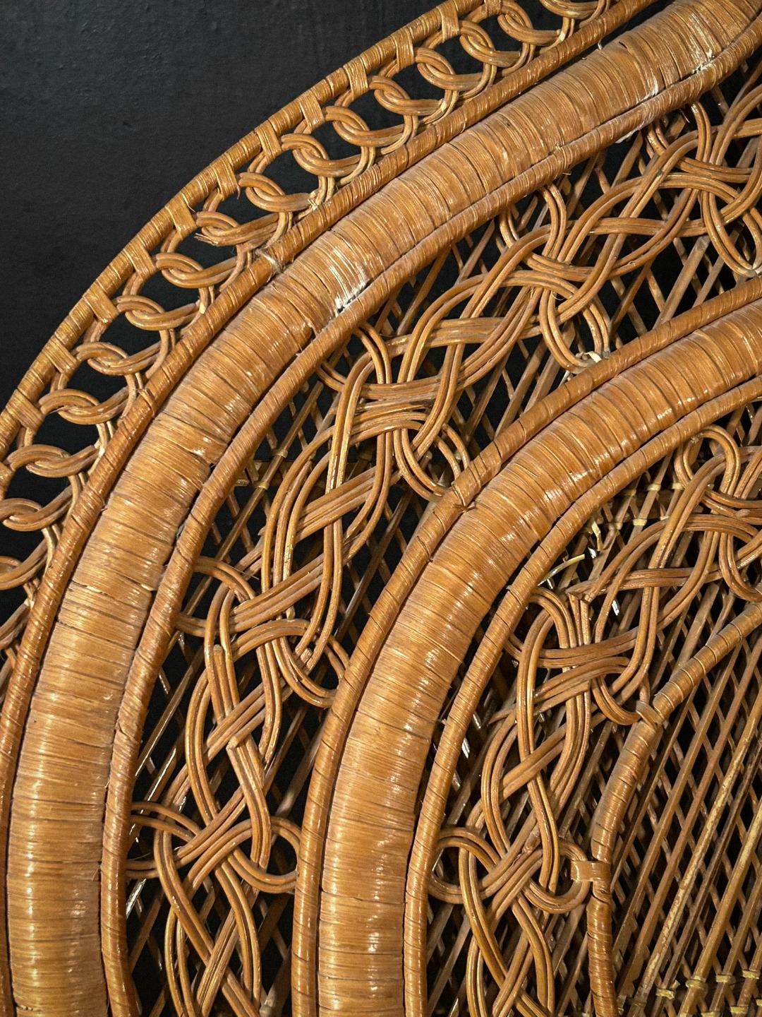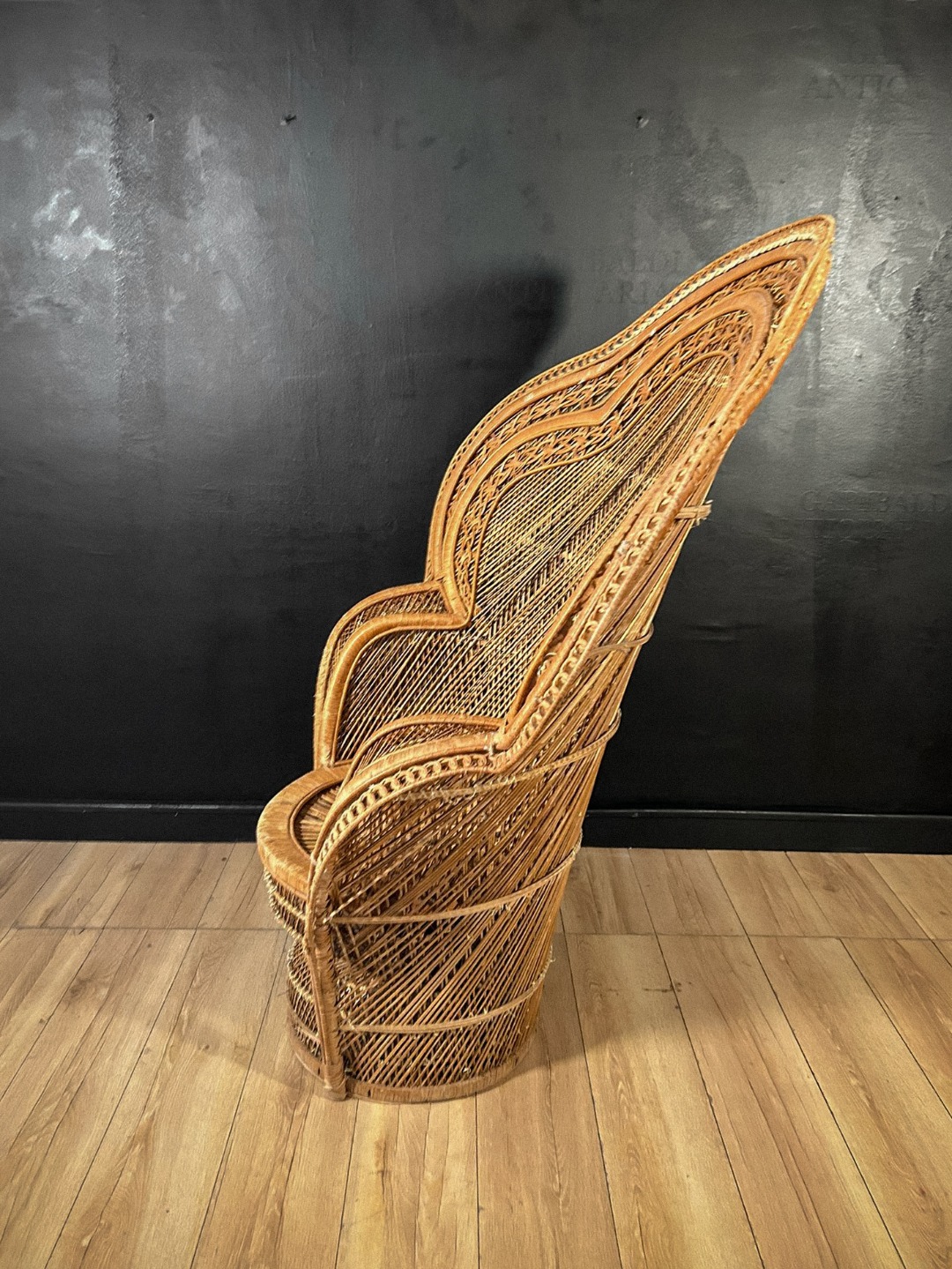 Importante poltrona scenografica realizzata interamente in vimini intrecciato, caratterizzata dal tipico schienale alto e avvolgente a ventaglio, noto come modello “Peacock”. La struttura presenta un elaborato lavoro artigianale a intreccio fitto, con cornici concentriche decorate da motivi geometrici e intrecci curvilinei, che conferiscono grande eleganza e forte impatto visivo.