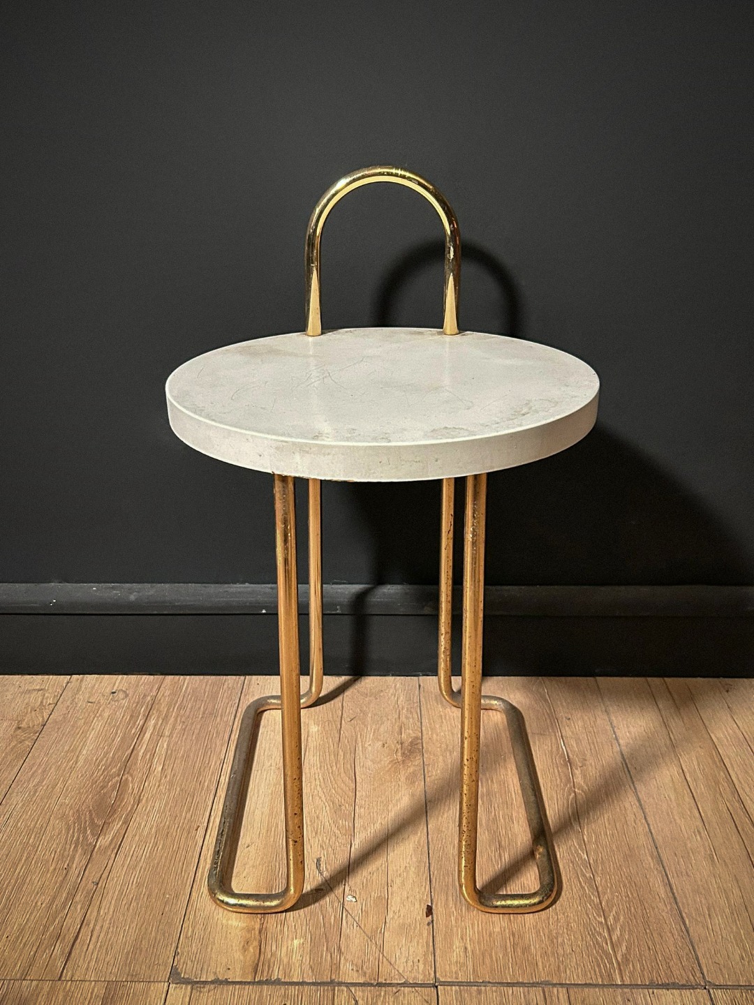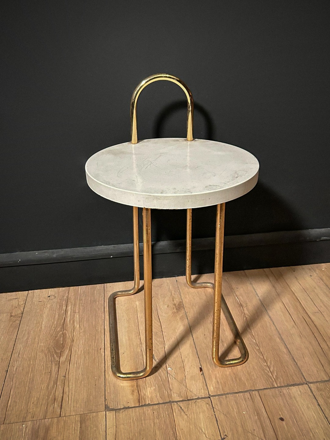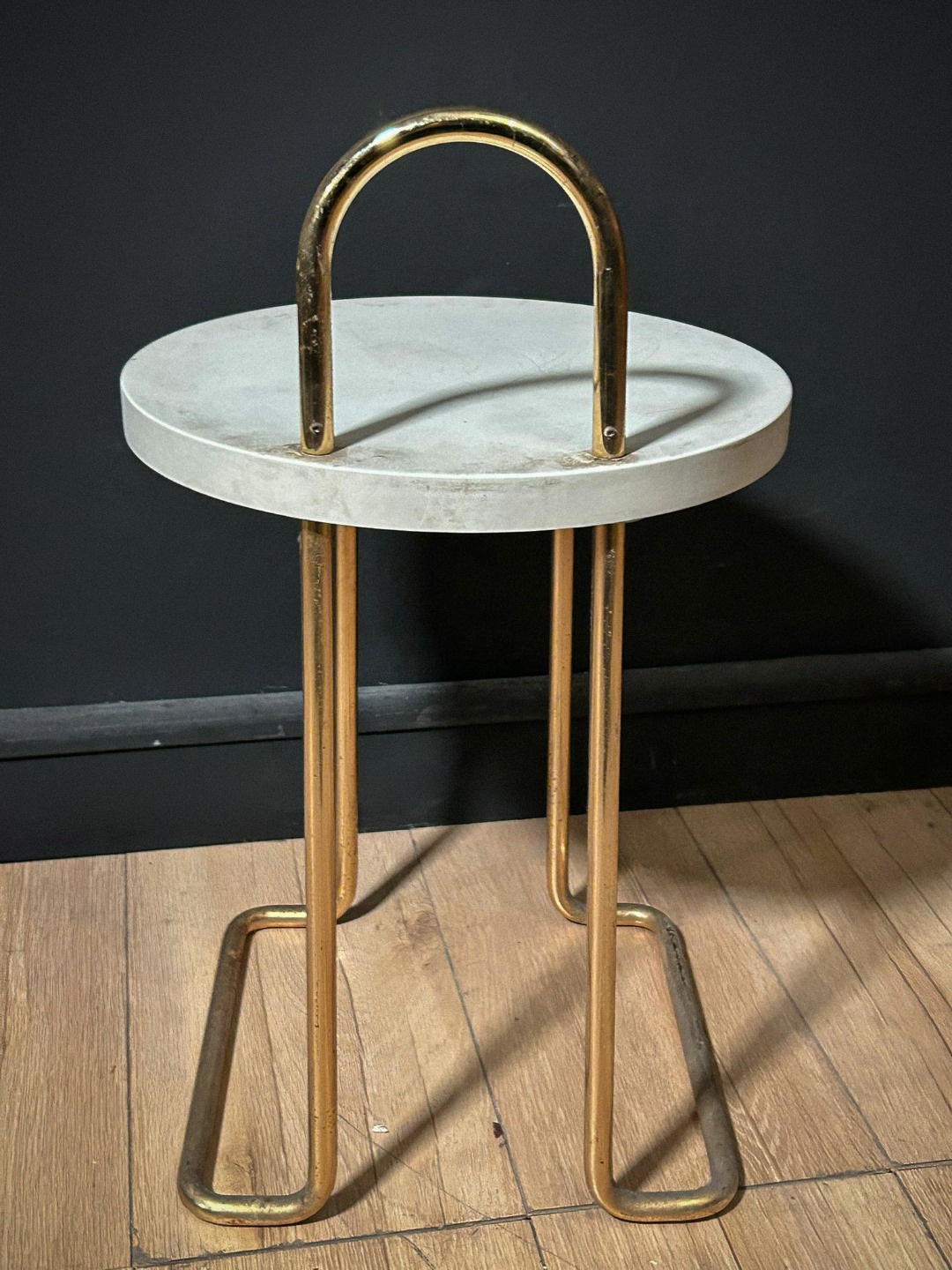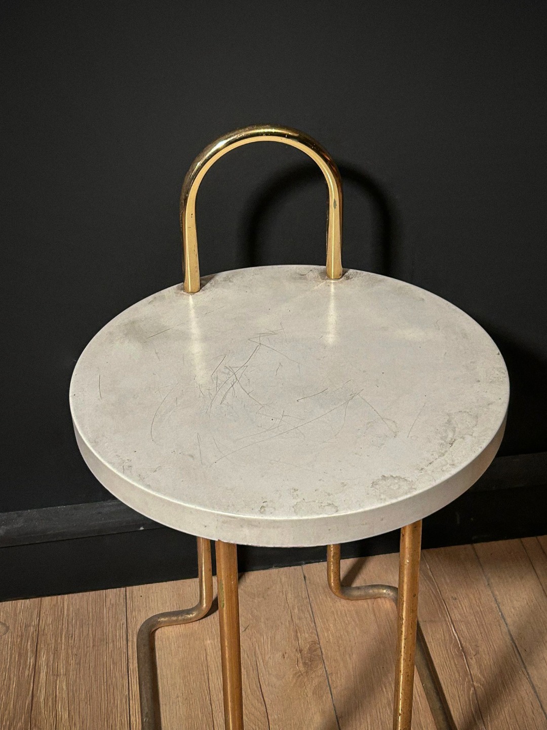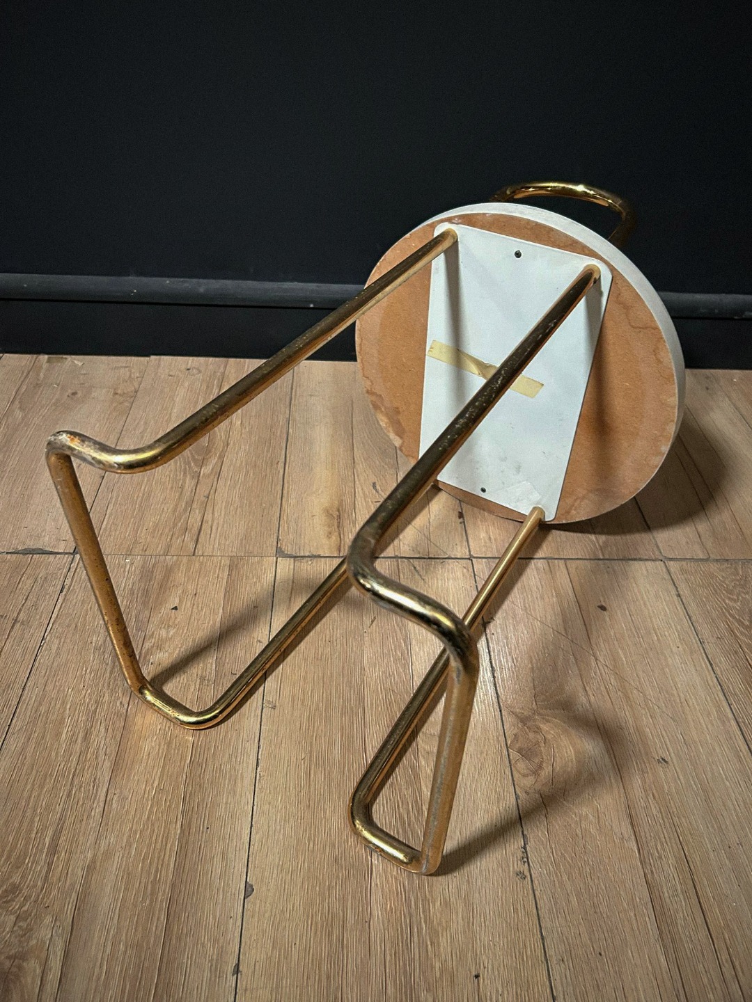 sgabello vintage con piano in marmo e struttura in ottone, caratterizzato da un design essenziale ma ricercato.