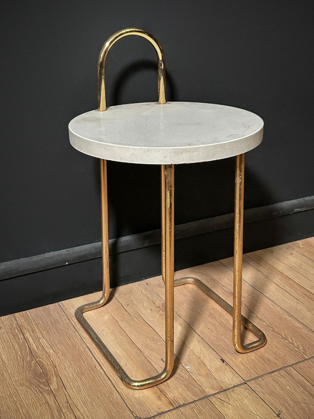 Il piano rotondo in marmo chiaro, dalla superficie liscia e naturale, si combina con la base in tubolare di ottone sagomato, leggermente vissuto, che dona un fascino elegante e moderno.