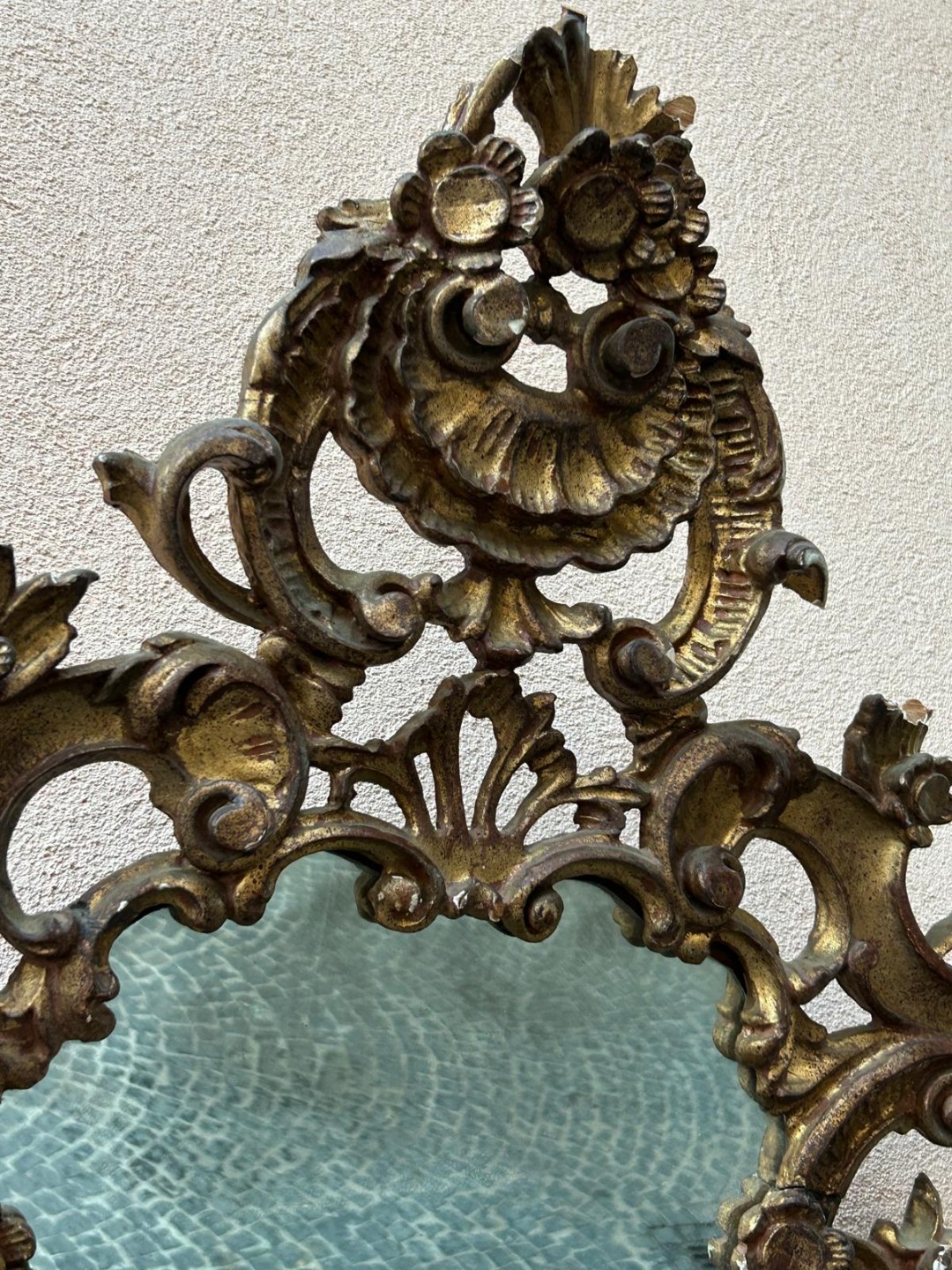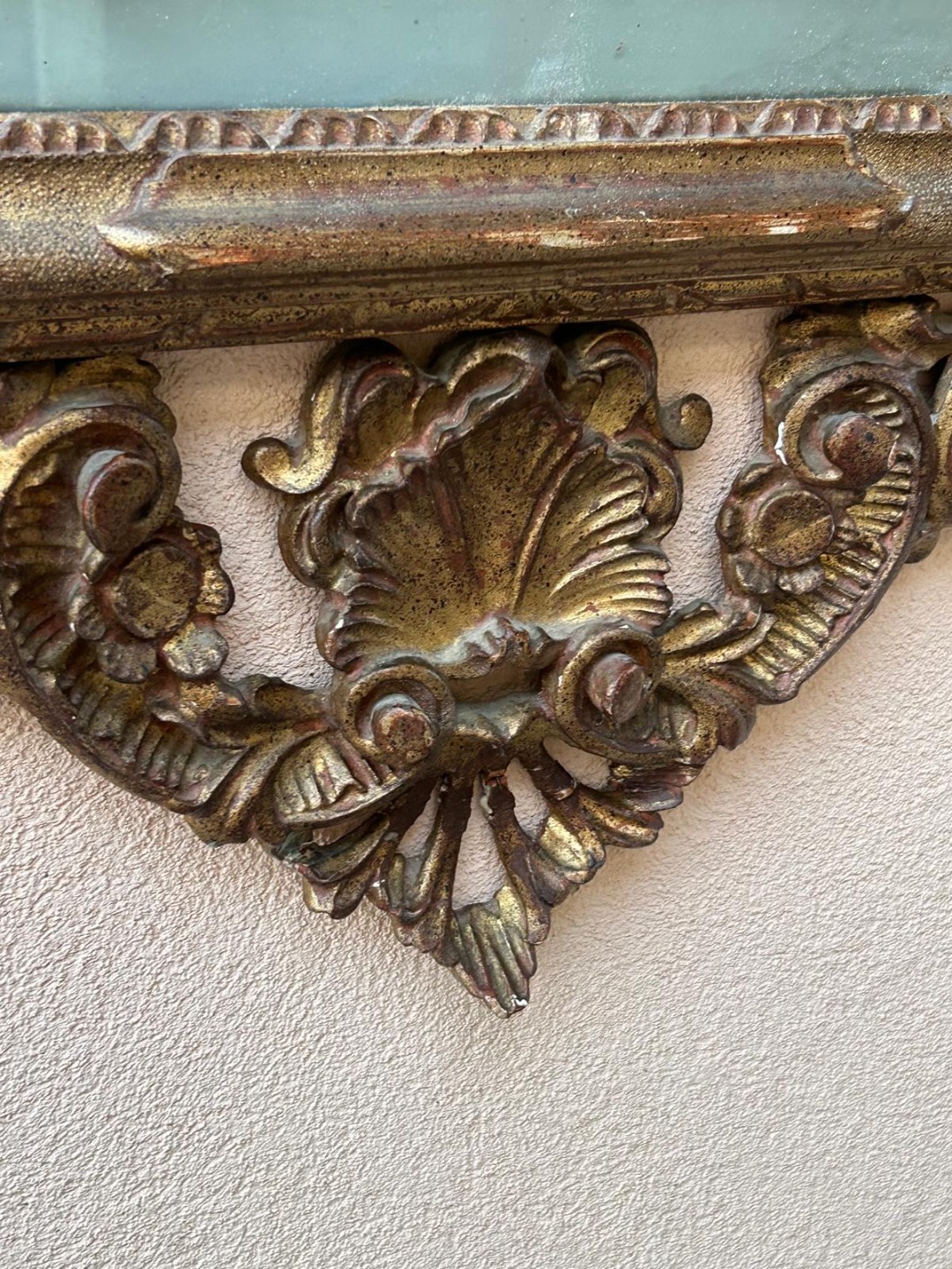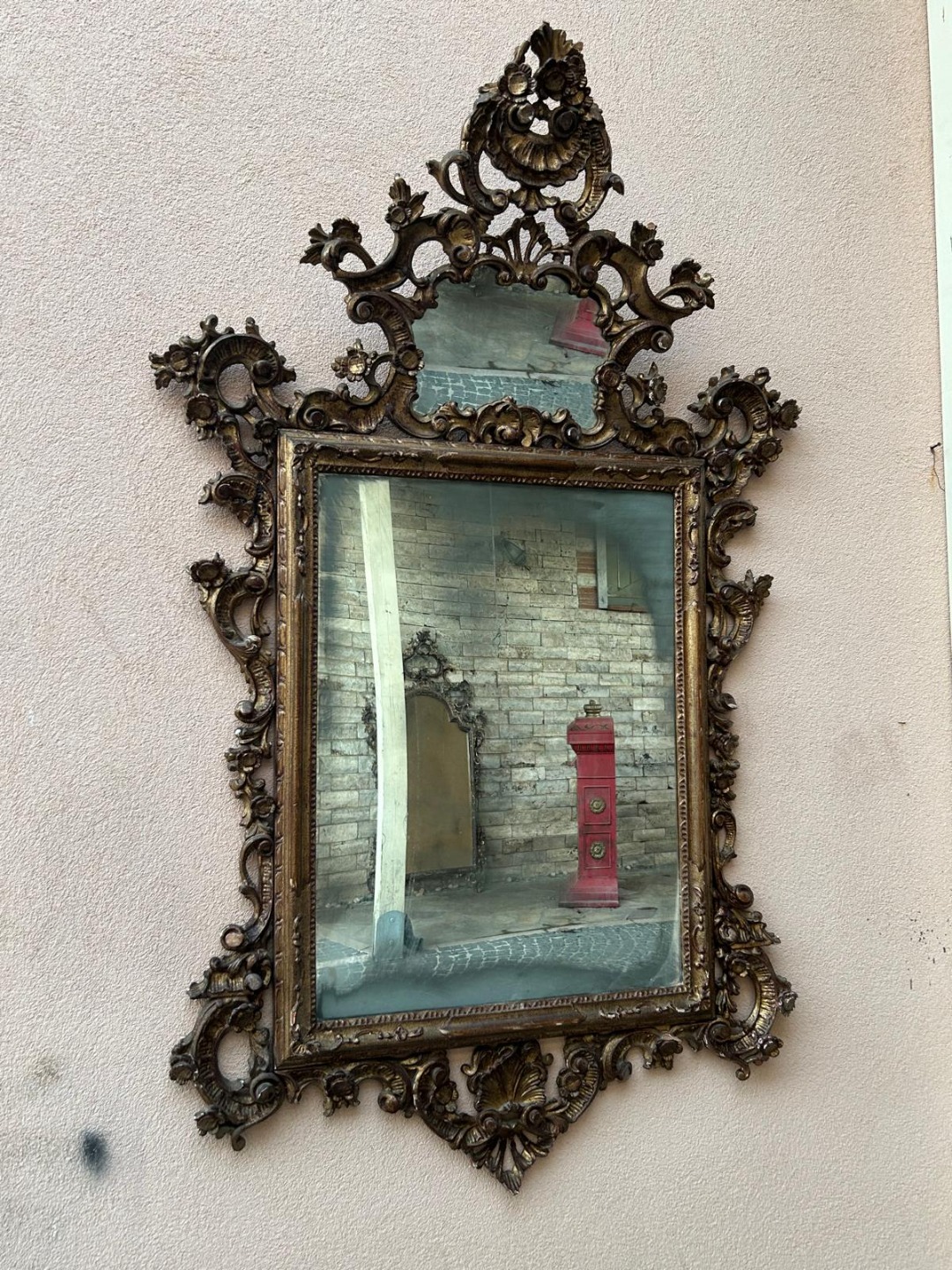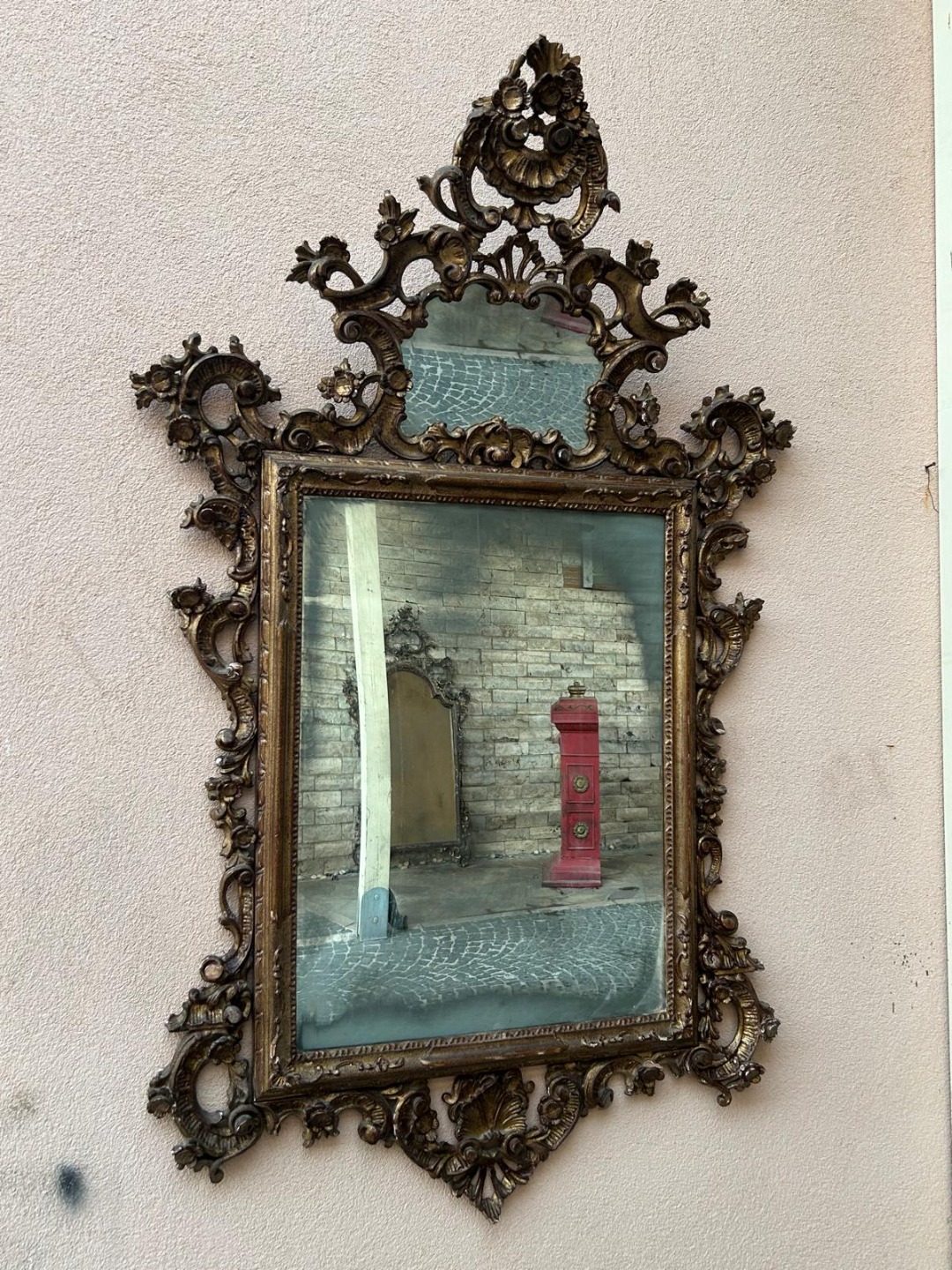 Magnifica specchiera veneziana di fine ’800, realizzata in legno finemente intagliato e dorato a foglia oro. La cornice presenta una ricca decorazione a volute, conchiglie e motivi floreali, culminante in un cimiero traforato di grande eleganza. Lo specchio originale conserva una leggera patina del tempo che ne valorizza l’autenticità.
