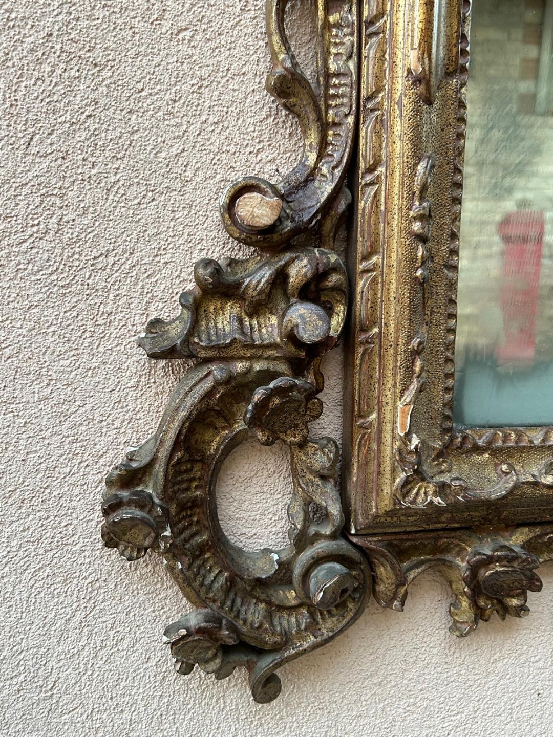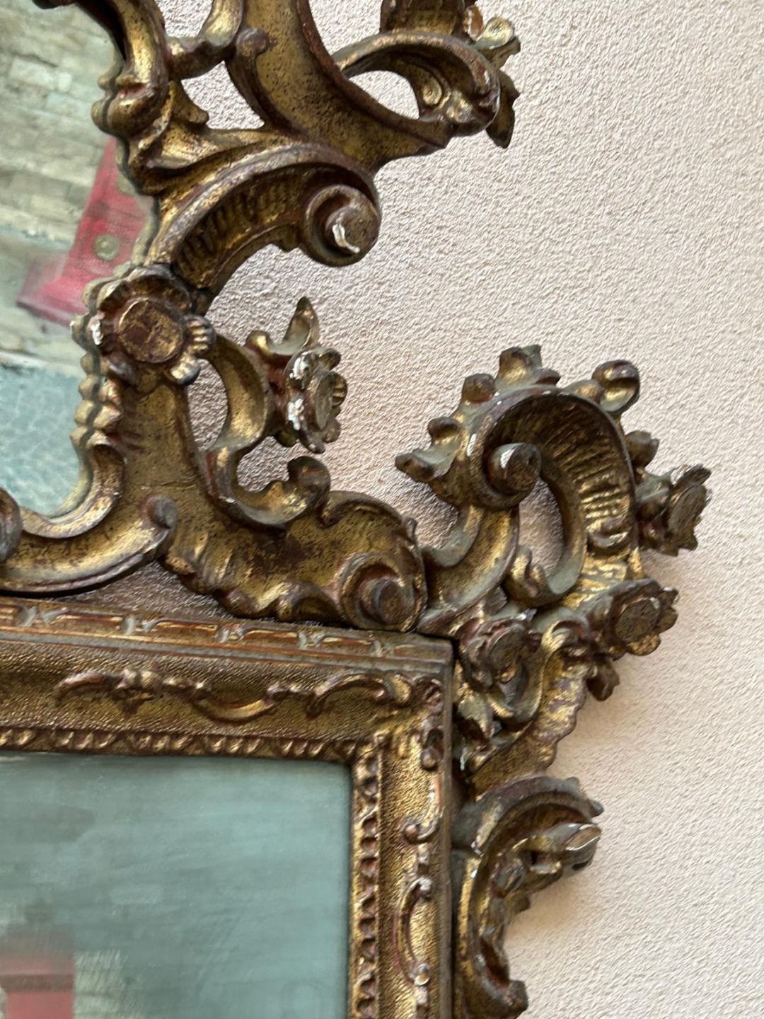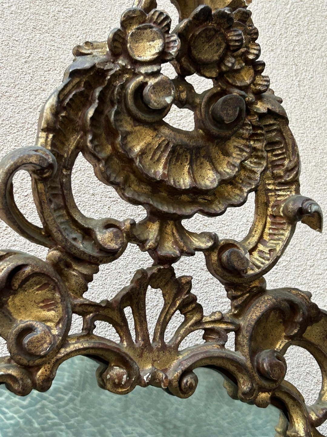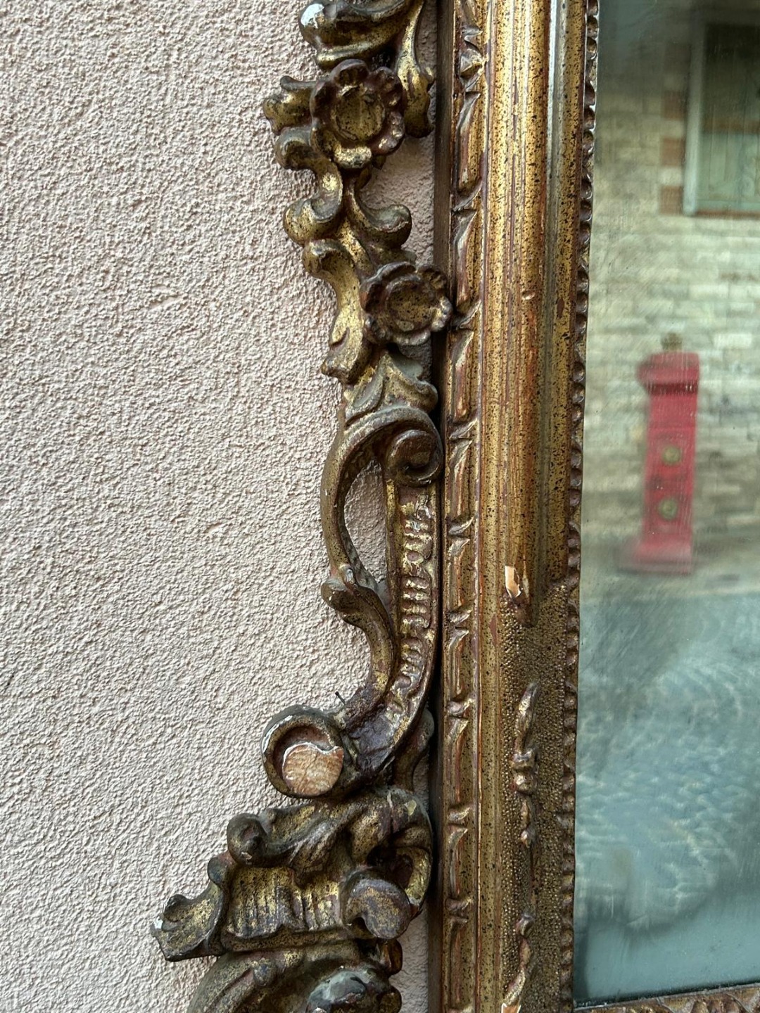 Magnifica specchiera veneziana di fine ’800, realizzata in legno finemente intagliato e dorato a foglia oro. La cornice presenta una ricca decorazione a volute, conchiglie e motivi floreali, culminante in un cimiero traforato di grande eleganza. Lo specchio originale conserva una leggera patina del tempo che ne valorizza l’autenticità.