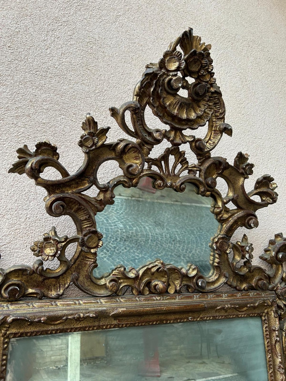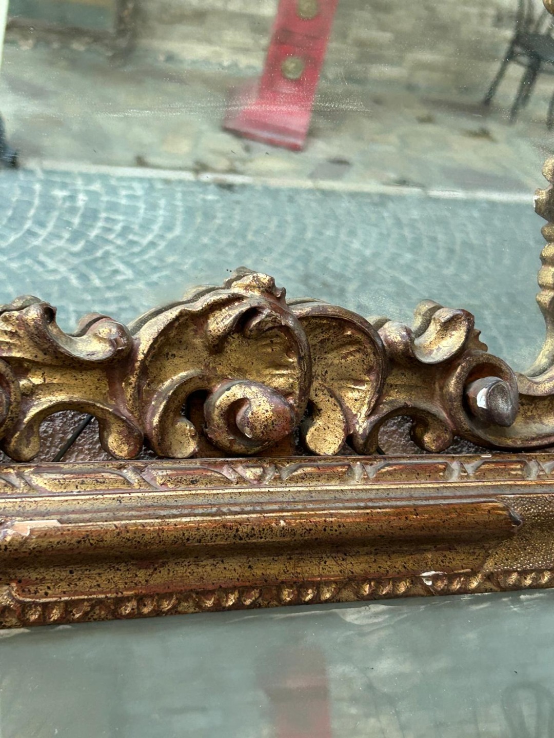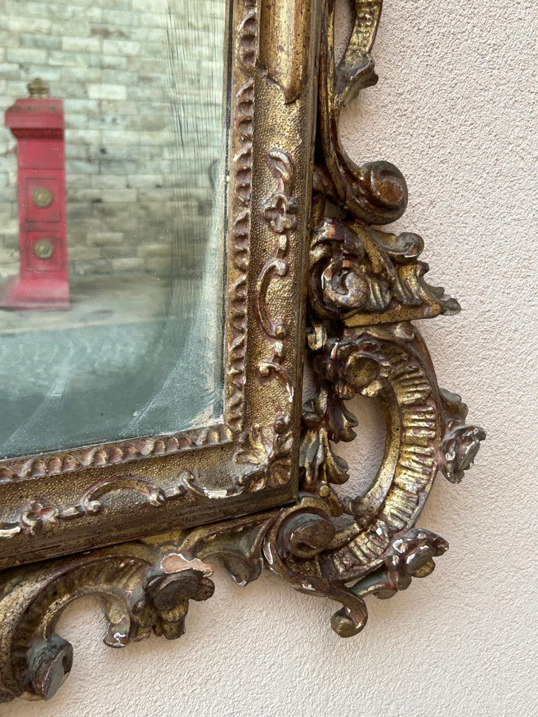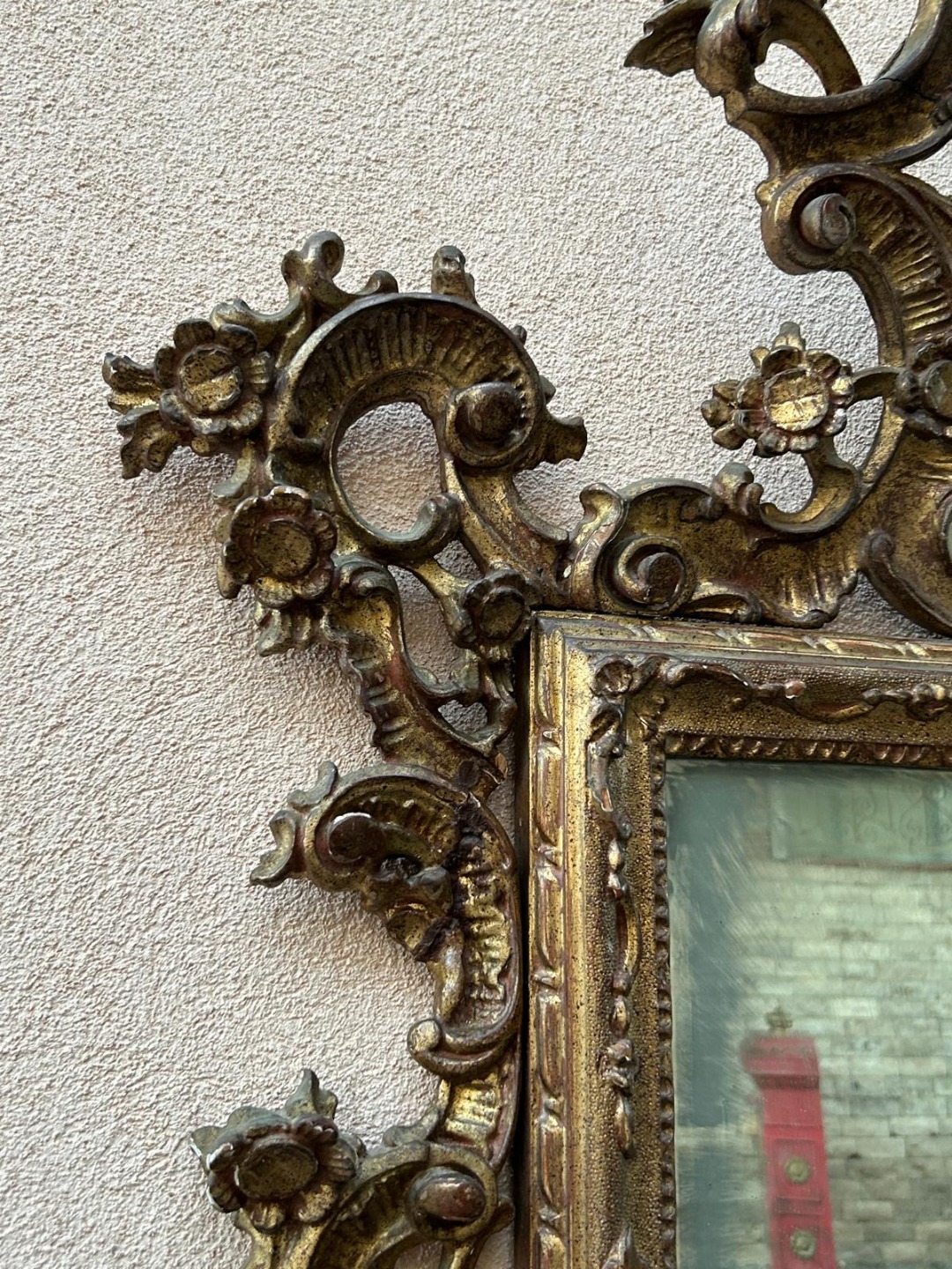 Magnifica specchiera veneziana di fine ’800, realizzata in legno finemente intagliato e dorato a foglia oro. La cornice presenta una ricca decorazione a volute, conchiglie e motivi floreali, culminante in un cimiero traforato di grande eleganza. Lo specchio originale conserva una leggera patina del tempo che ne valorizza l’autenticità.