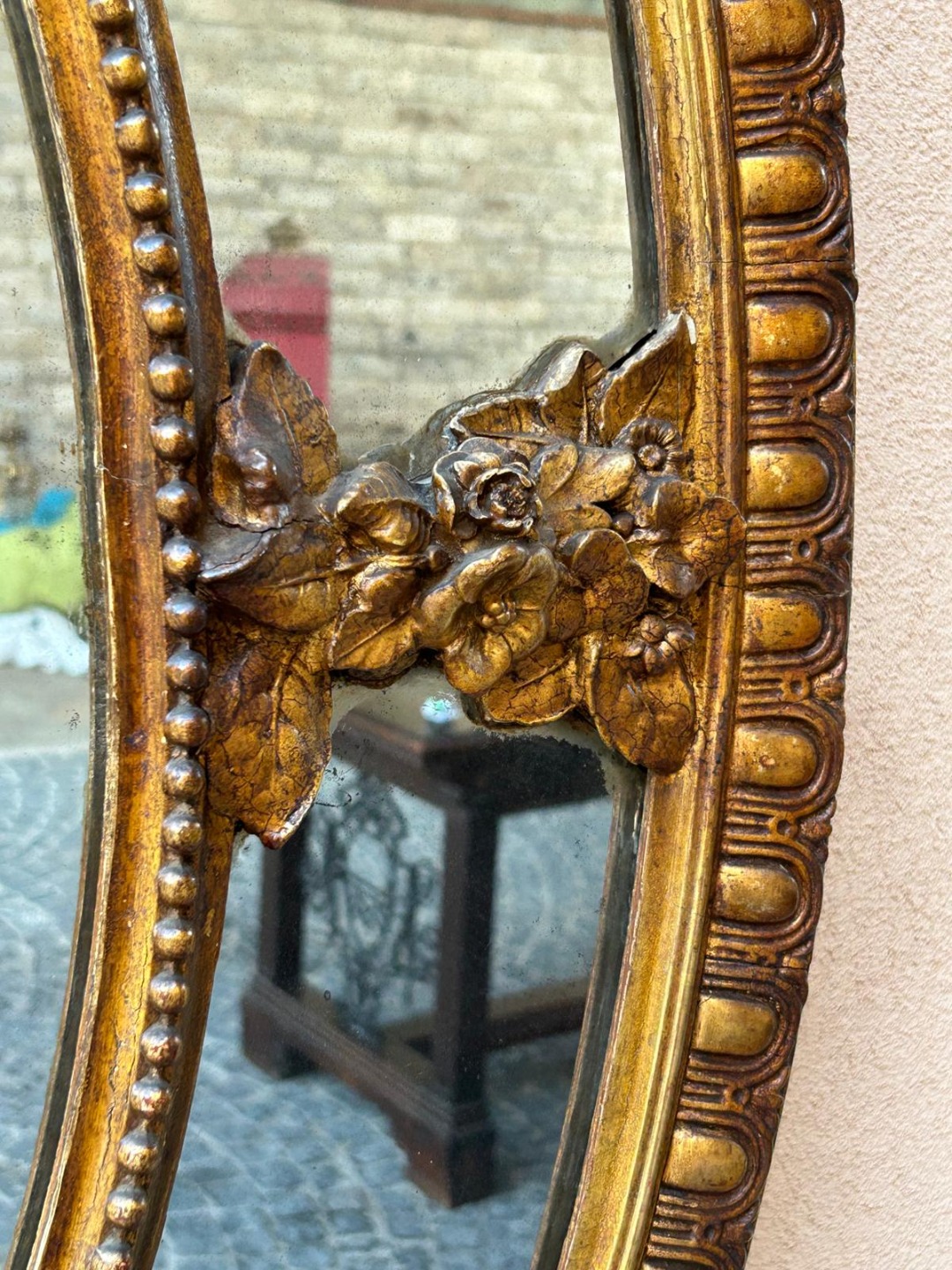 Lo specchio, coevo, mostra una leggera ossidazione che ne testimonia l’antichità e ne arricchisce il carattere.