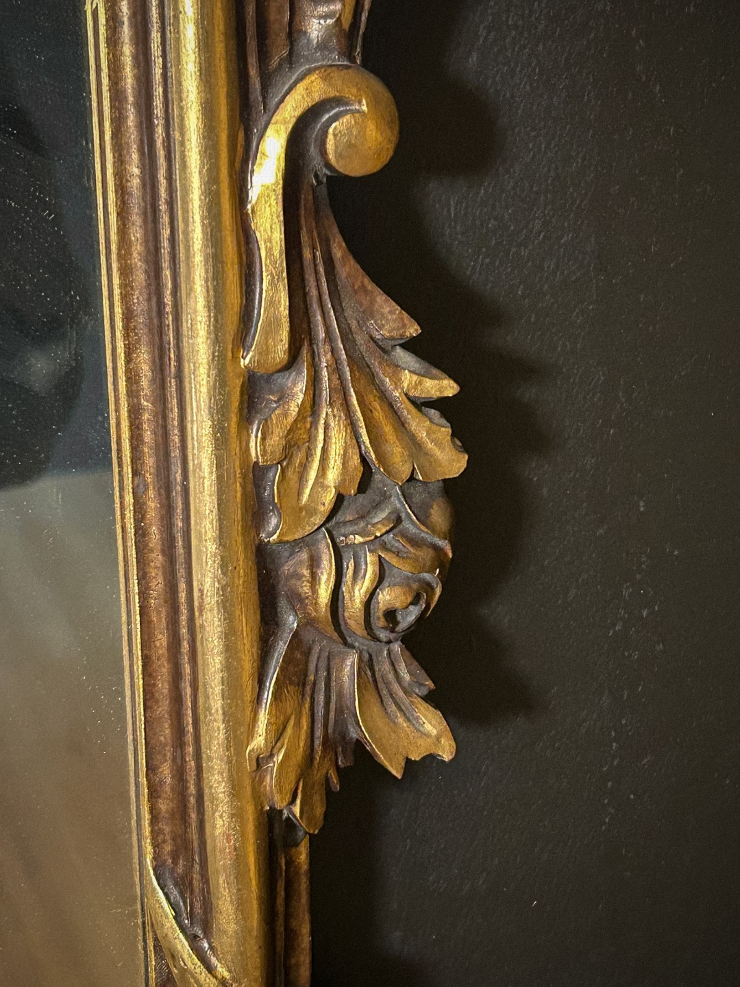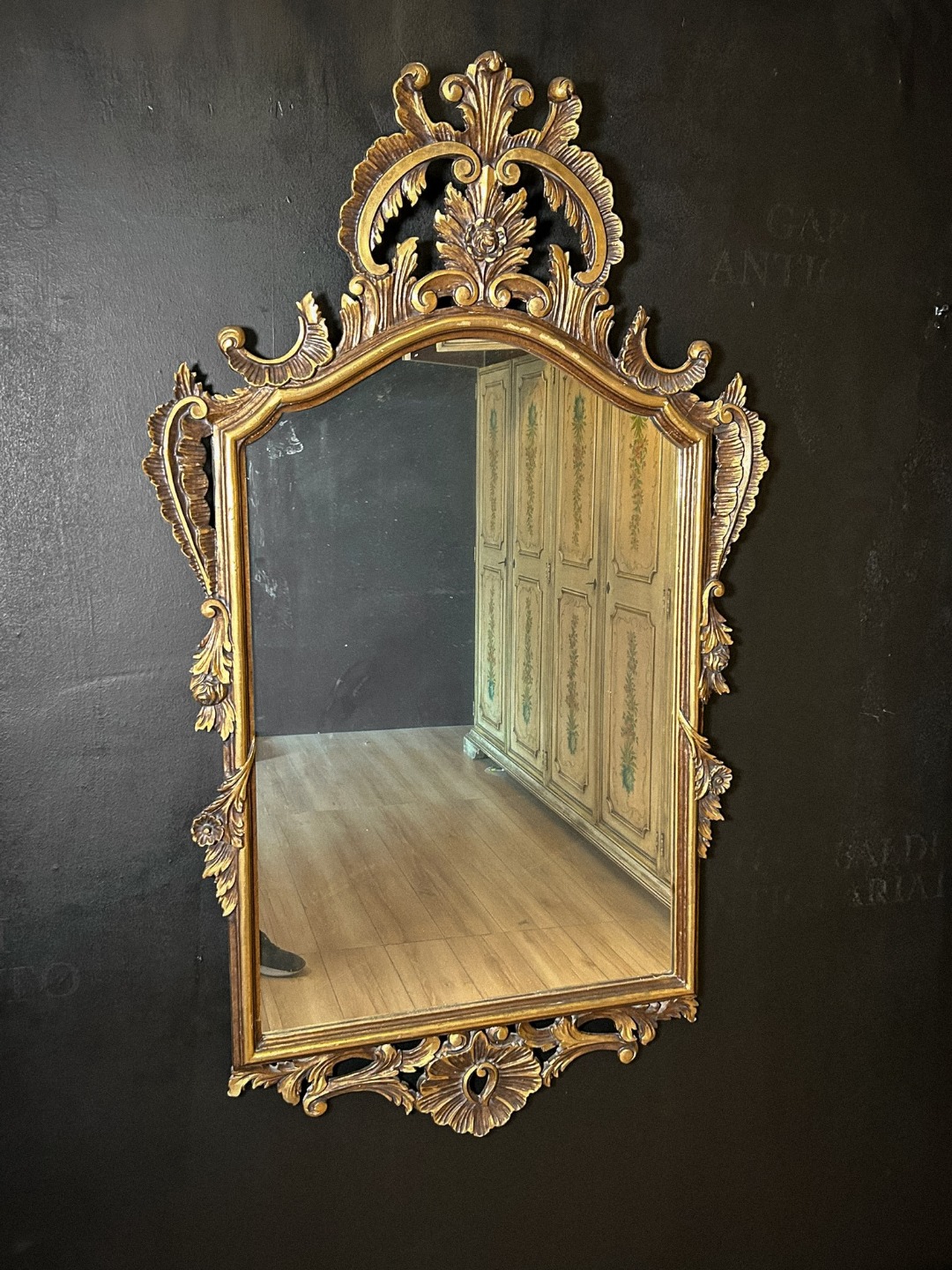 Lo specchio originale mostra la naturale patina del tempo, coerente con l’epoca di realizzazione. Il retro evidenzia la struttura lignea e le lavorazioni manuali, confermando l’autenticità del manufatto.