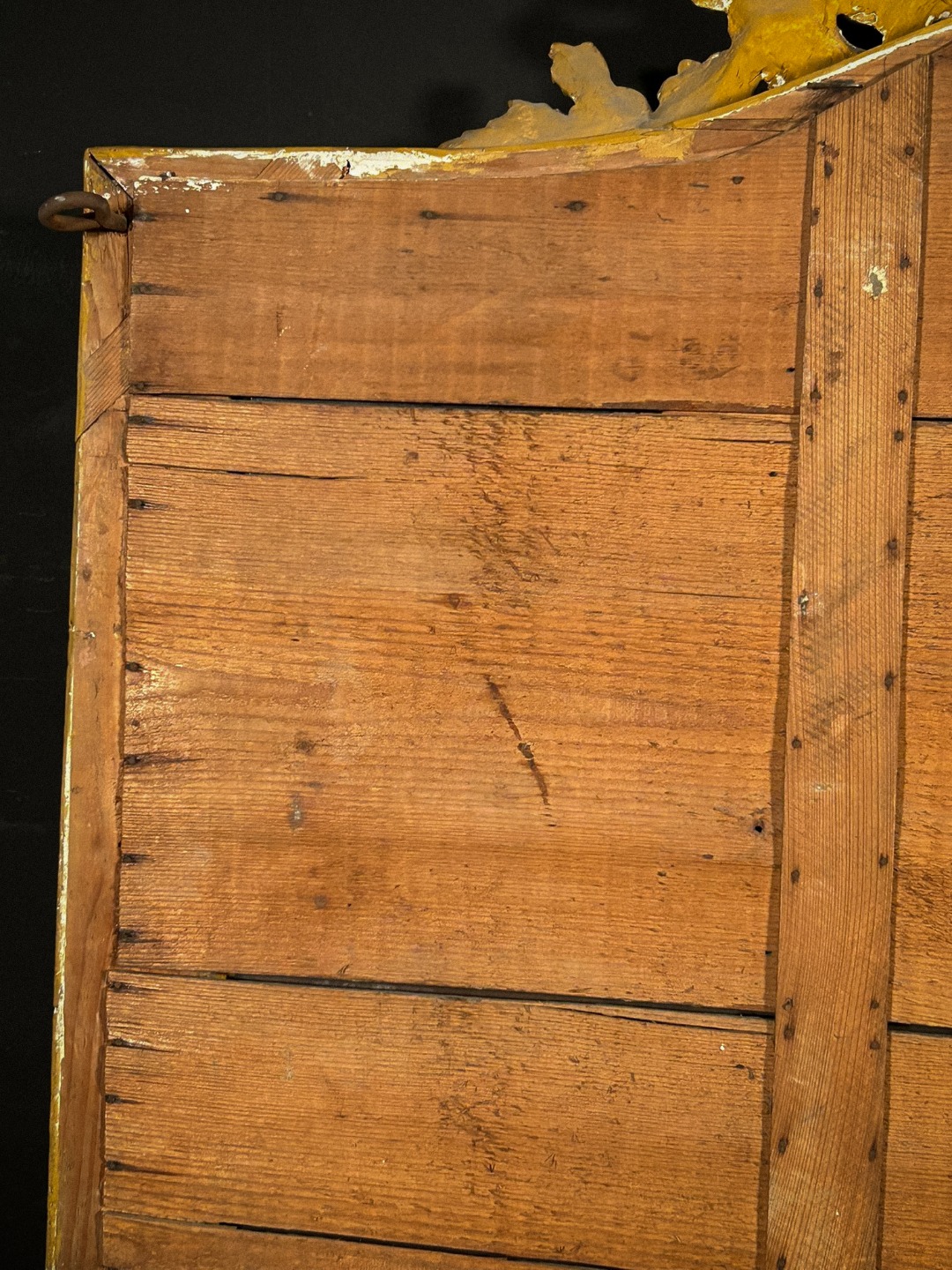 Il retro mantiene la patina originale del tempo, con pannellatura lignea coeva. Un oggetto raffinato e decorativo, perfetto per arredamenti classici e ambienti di prestigio.