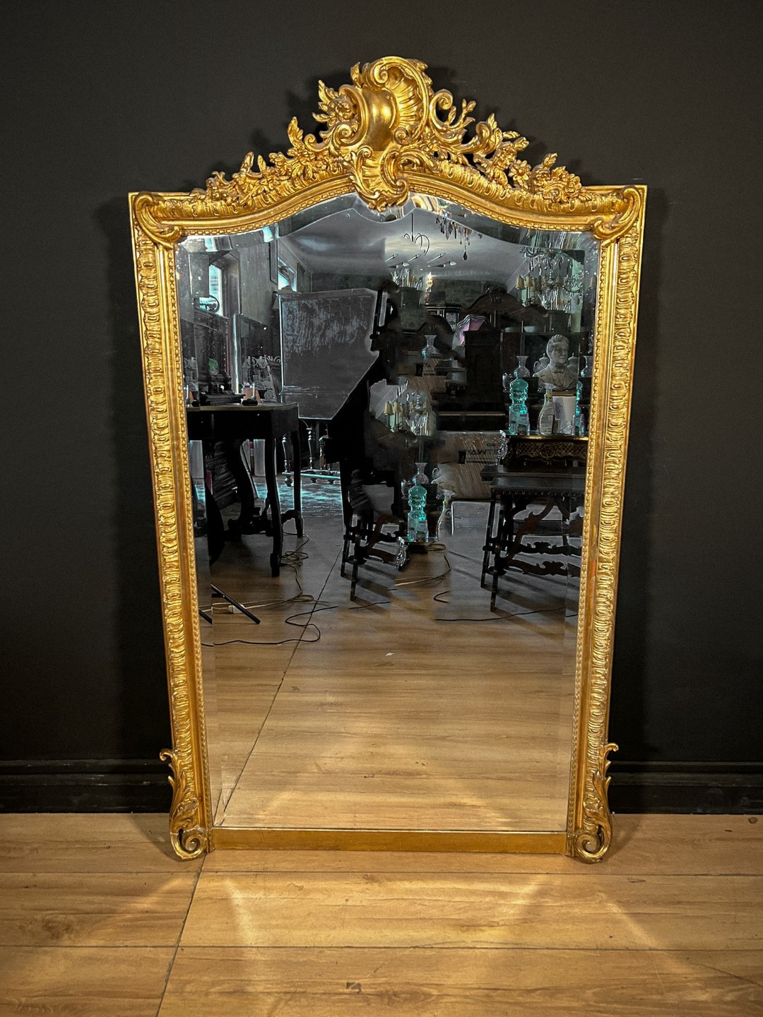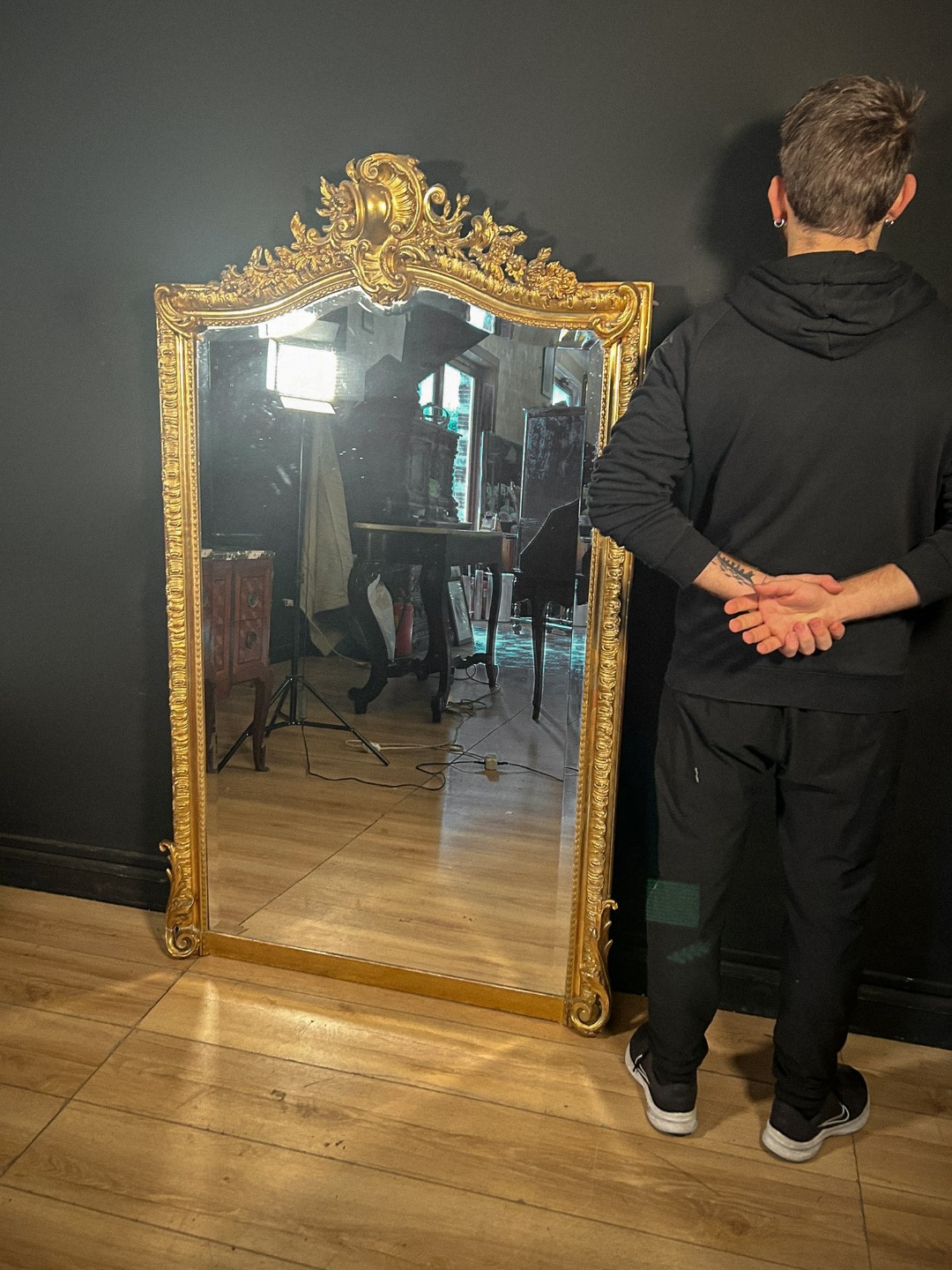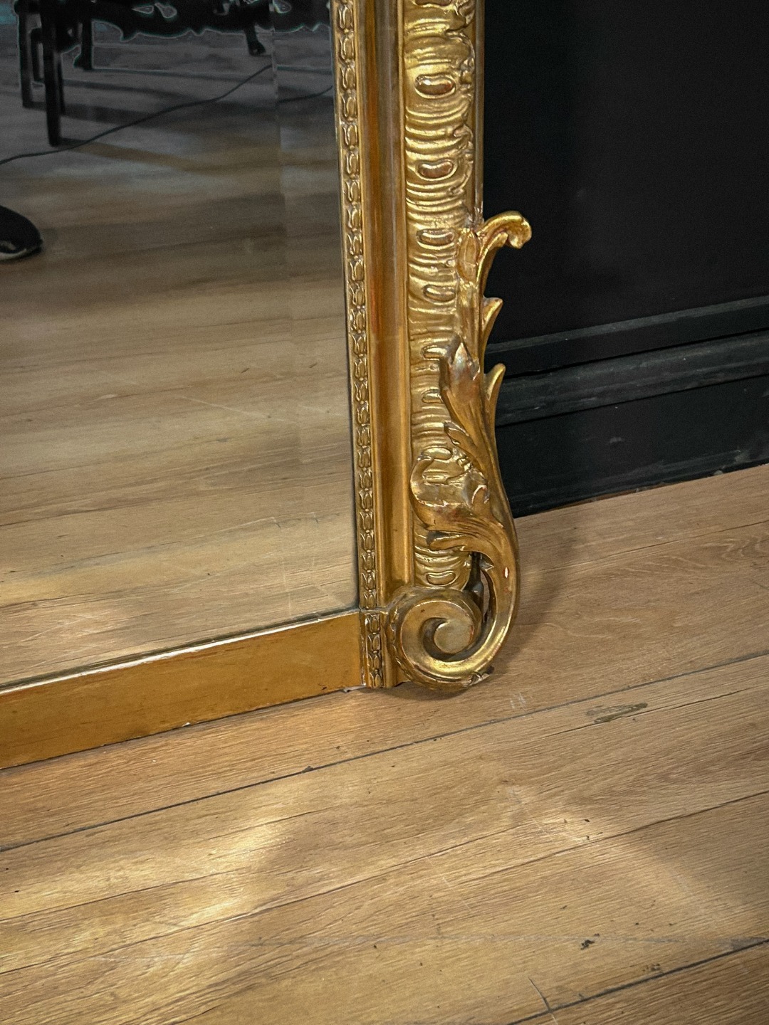 Importante specchiera francese Napoleone III, realizzata in stile Luigi XVI, caratterizzata da una ricca cornice in legno scolpito e dorato a foglia. La parte superiore presenta un’elaborata cimasa con volute, fiori e motivi vegetali finemente intagliati, dal forte impatto scenografico.