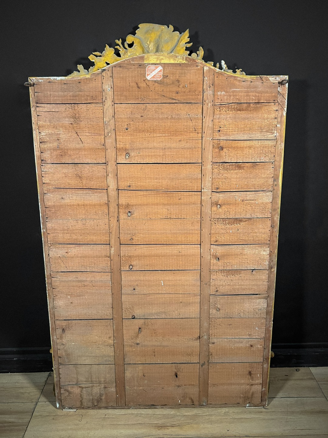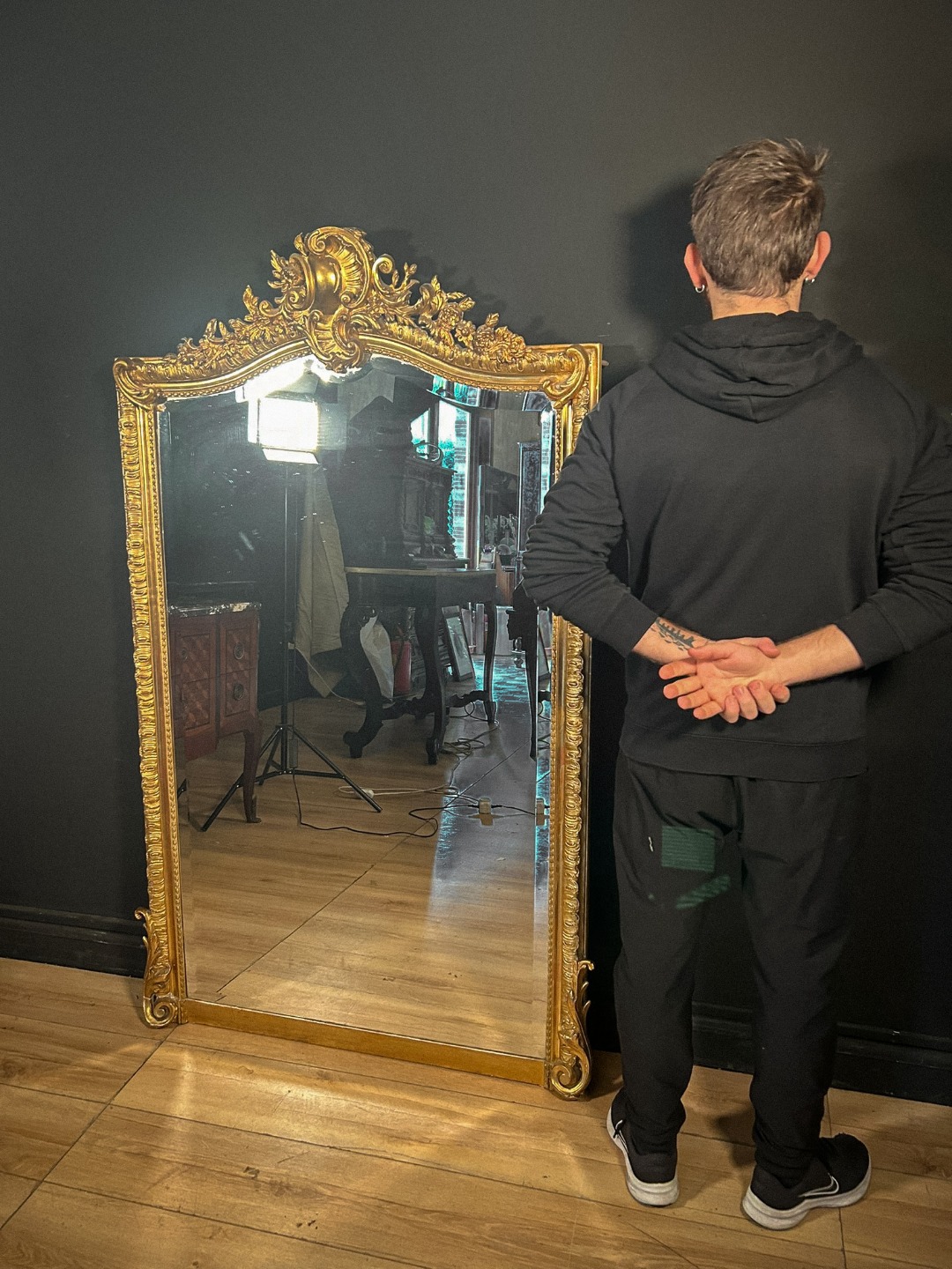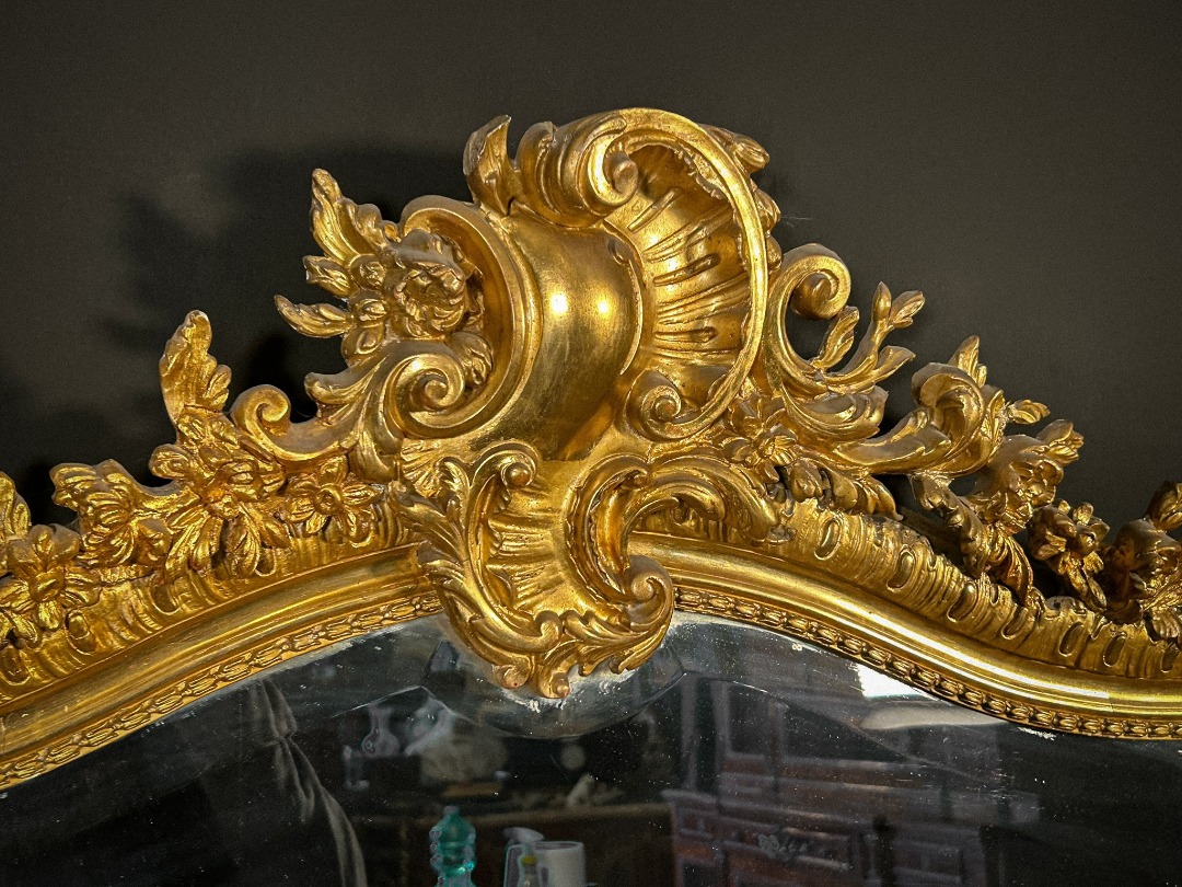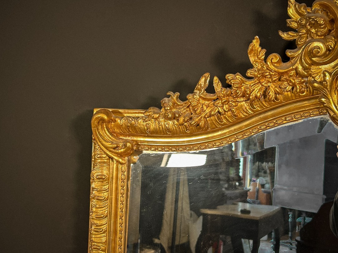 Importante specchiera francese Napoleone III, realizzata in stile Luigi XVI, caratterizzata da una ricca cornice in legno scolpito e dorato a foglia. La parte superiore presenta un’elaborata cimasa con volute, fiori e motivi vegetali finemente intagliati, dal forte impatto scenografico.