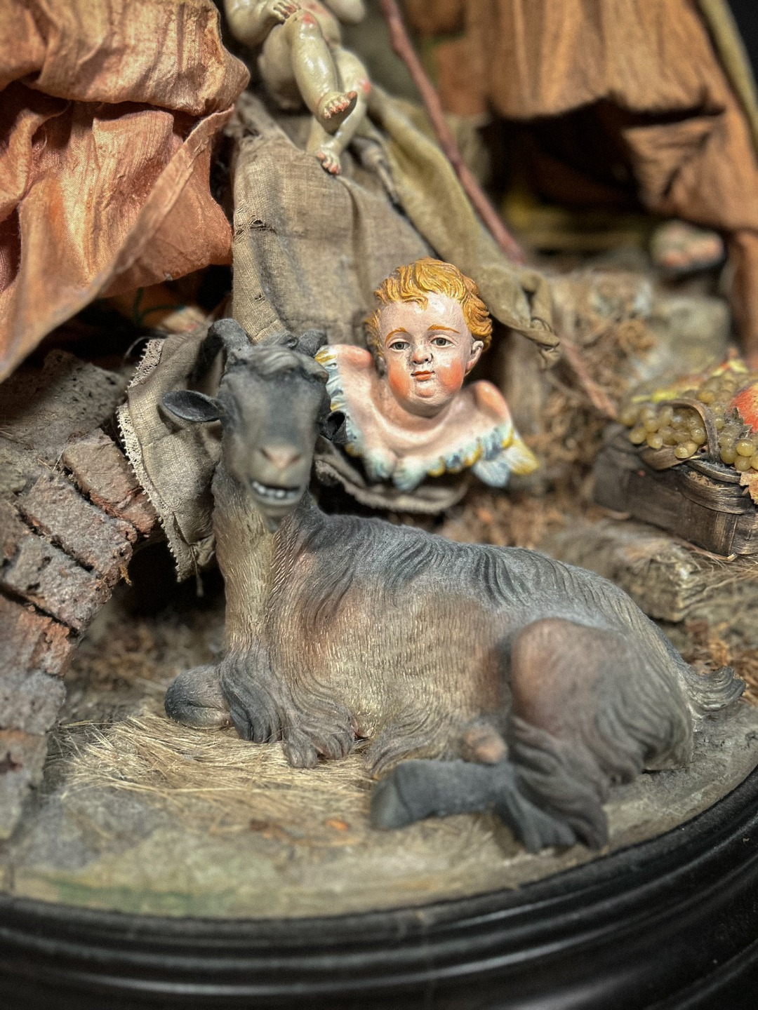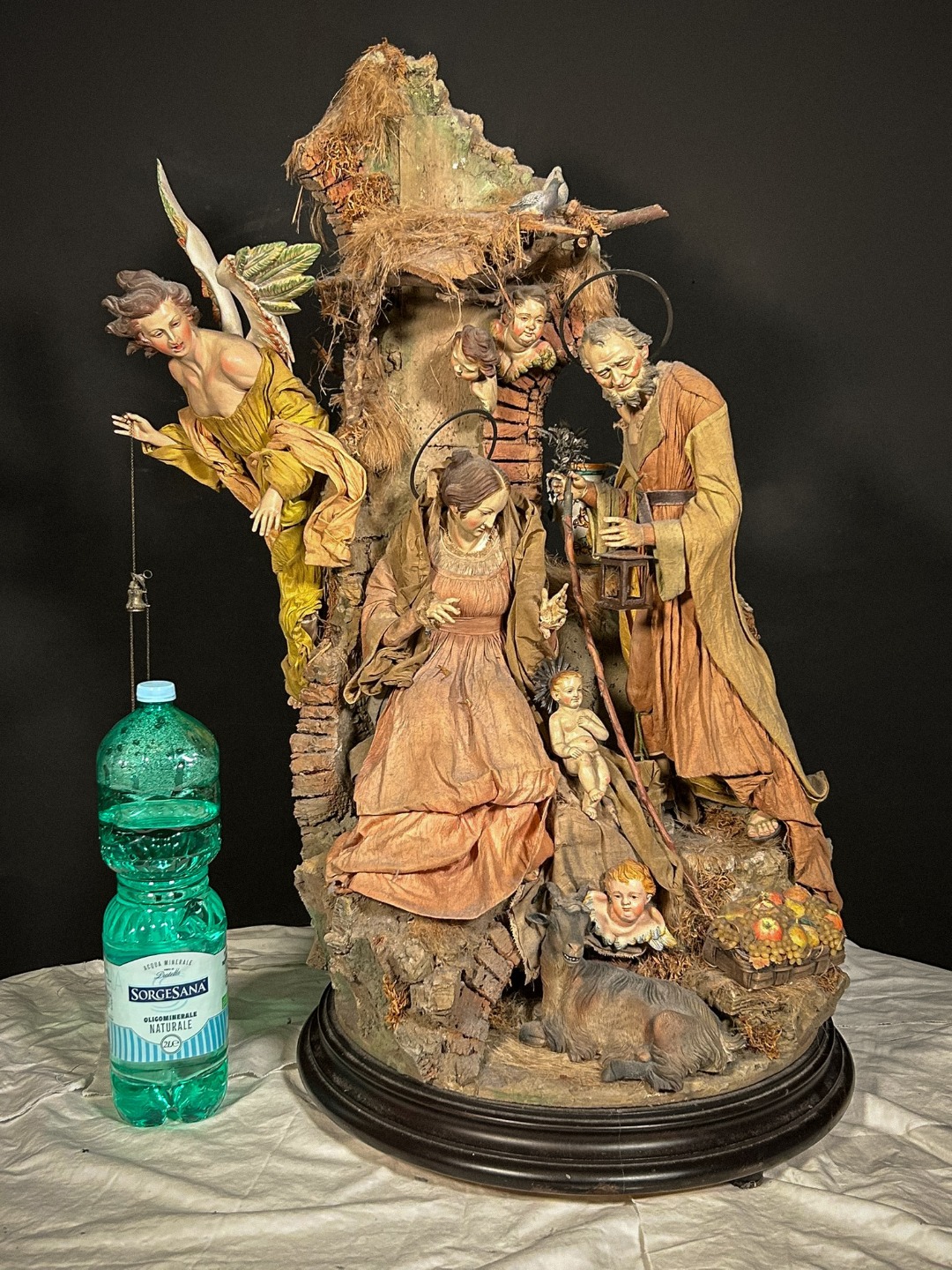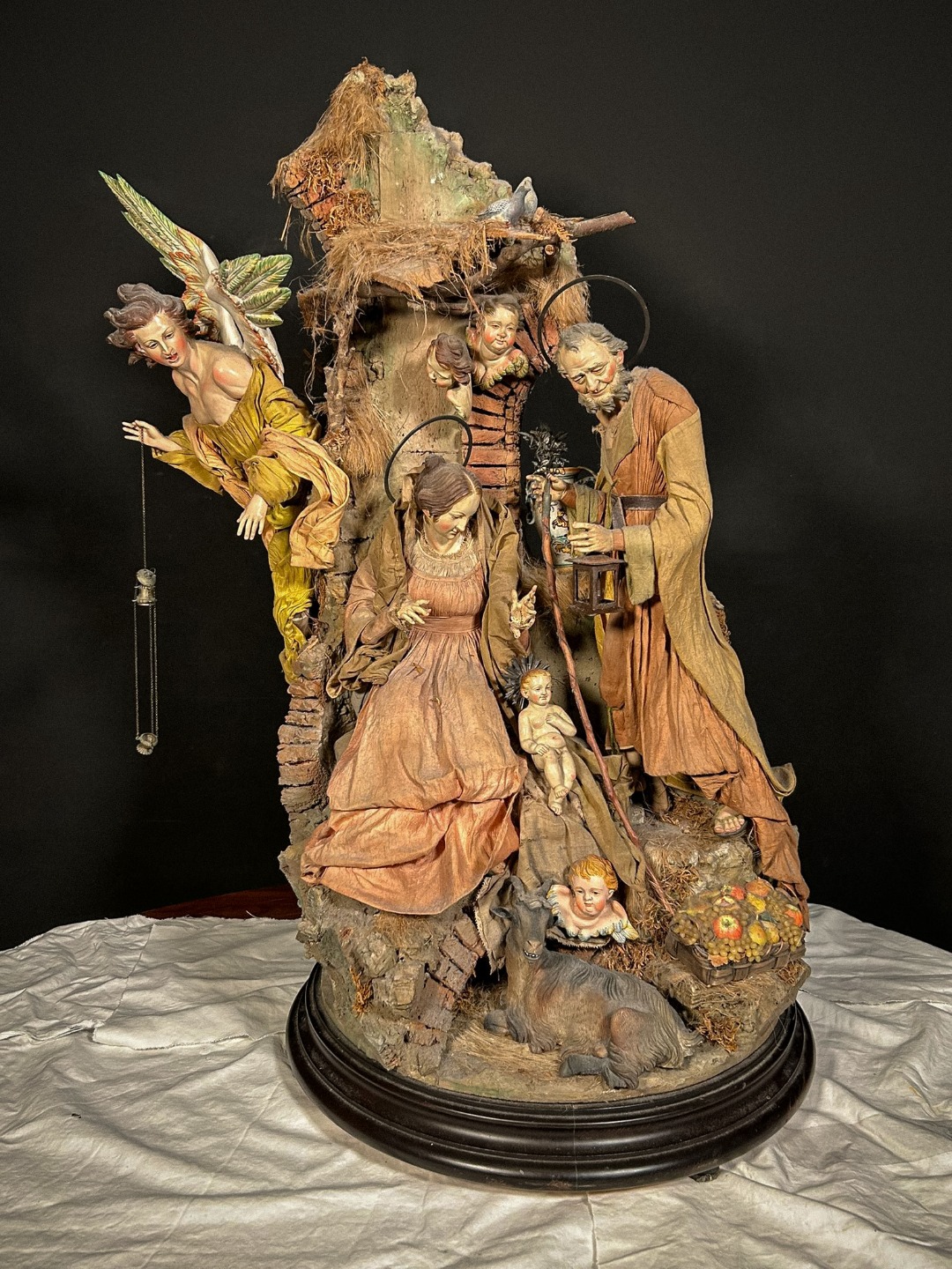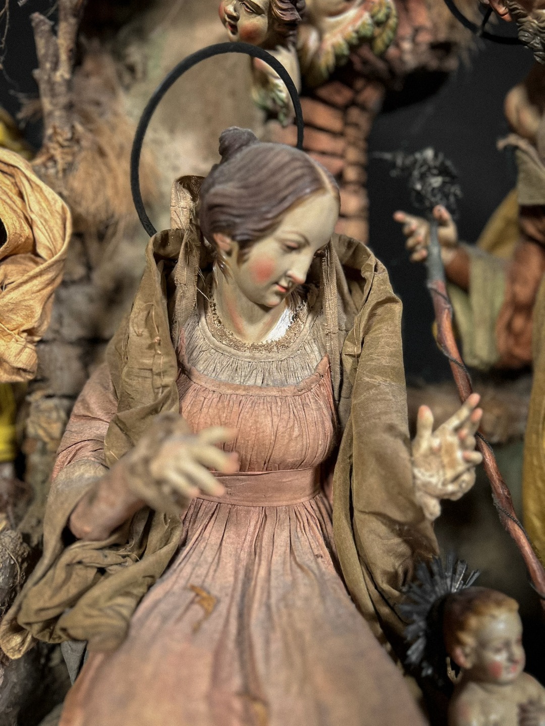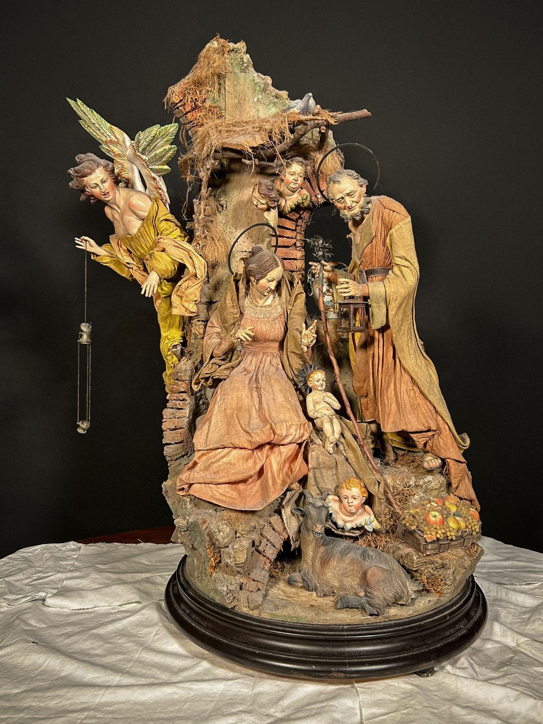 Suggestiva rappresentazione della Natività, realizzata ad inizio Novecento con figure in terracotta finemente dipinta a mano, caratterizzate da espressività e dettagli di grande pregio. Le figure presentano occhi in vetro, che donano realismo e profondità agli sguardi, e sono arricchite da abiti confezionati a mano in tessuti pregiati dell’epoca (seta, cotone, velluto e fibre naturali), modellati con pieghe e movimenti che conferiscono naturalezza e solennità alla scena.