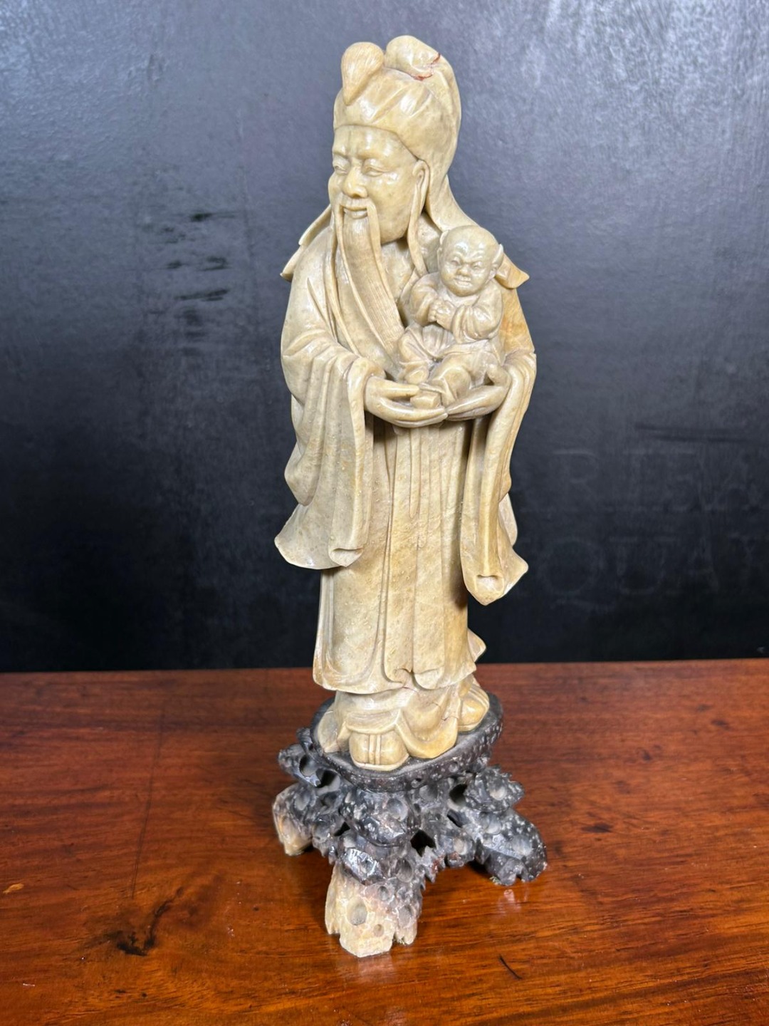 Importante statua cinese in pietra saponaria raffigurante Shou Lao, il dio cinese della longevità e della saggezza, riconoscibile dalla lunga barba fluente e dal bambino che tiene in braccio, simbolo di prosperità e continuità familiare.