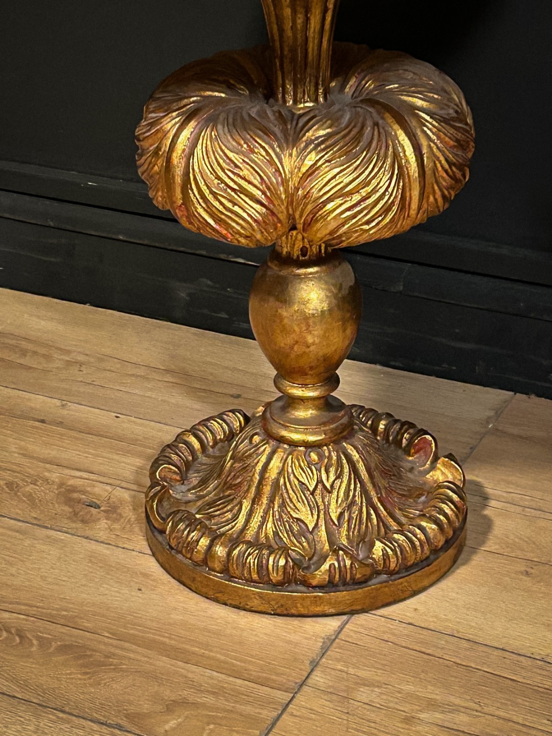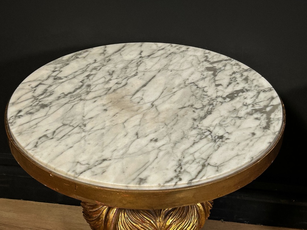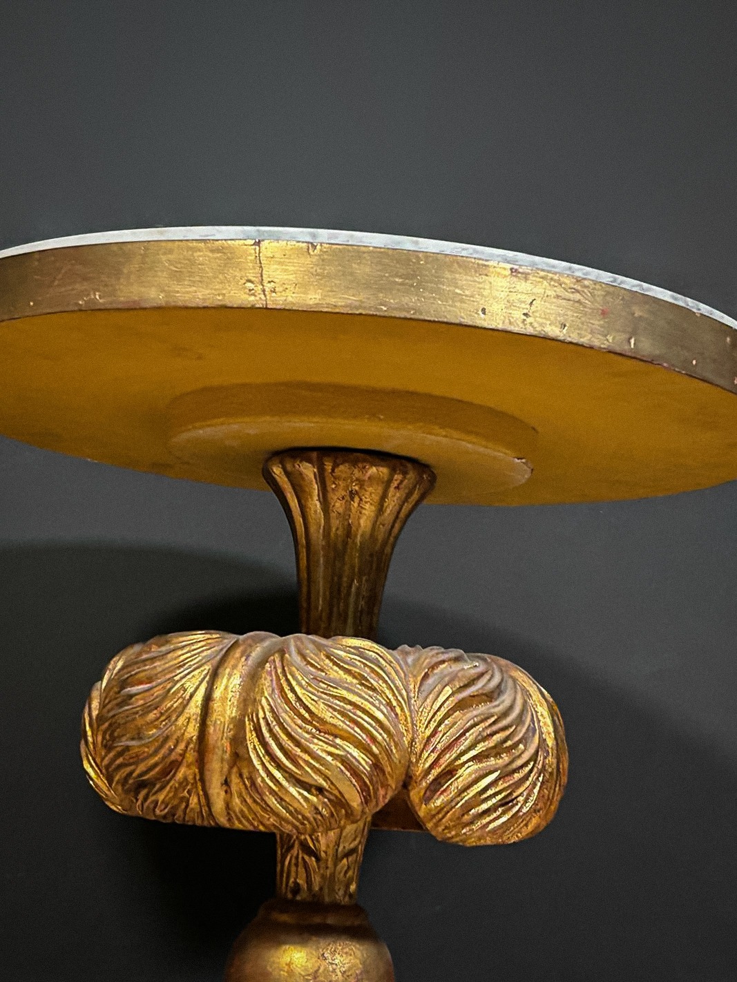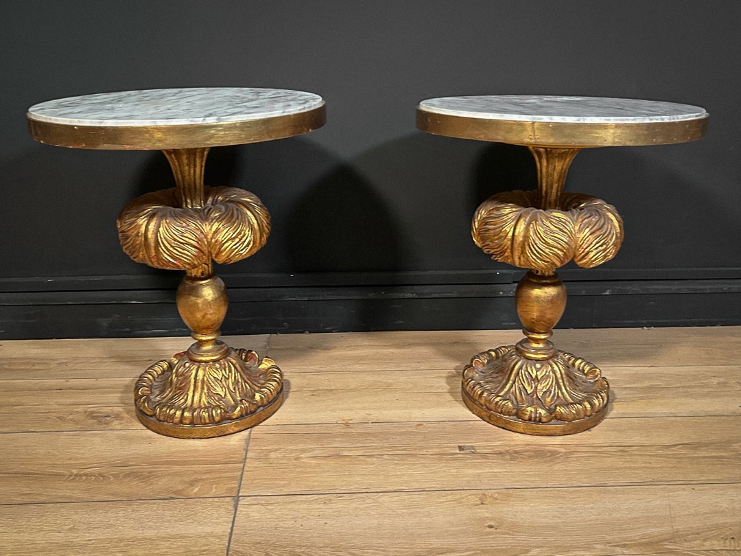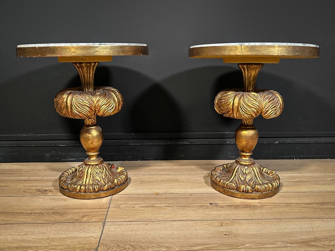 Antica coppia di tavolini di epoca XIX secolo, caratterizzati da una base in legno pregiato dorato, finemente intagliata con motivi vegetali e decorativi. I piani sono realizzati in marmo bianco, elegante e raffinato, in perfetta armonia con la ricca lavorazione della struttura.