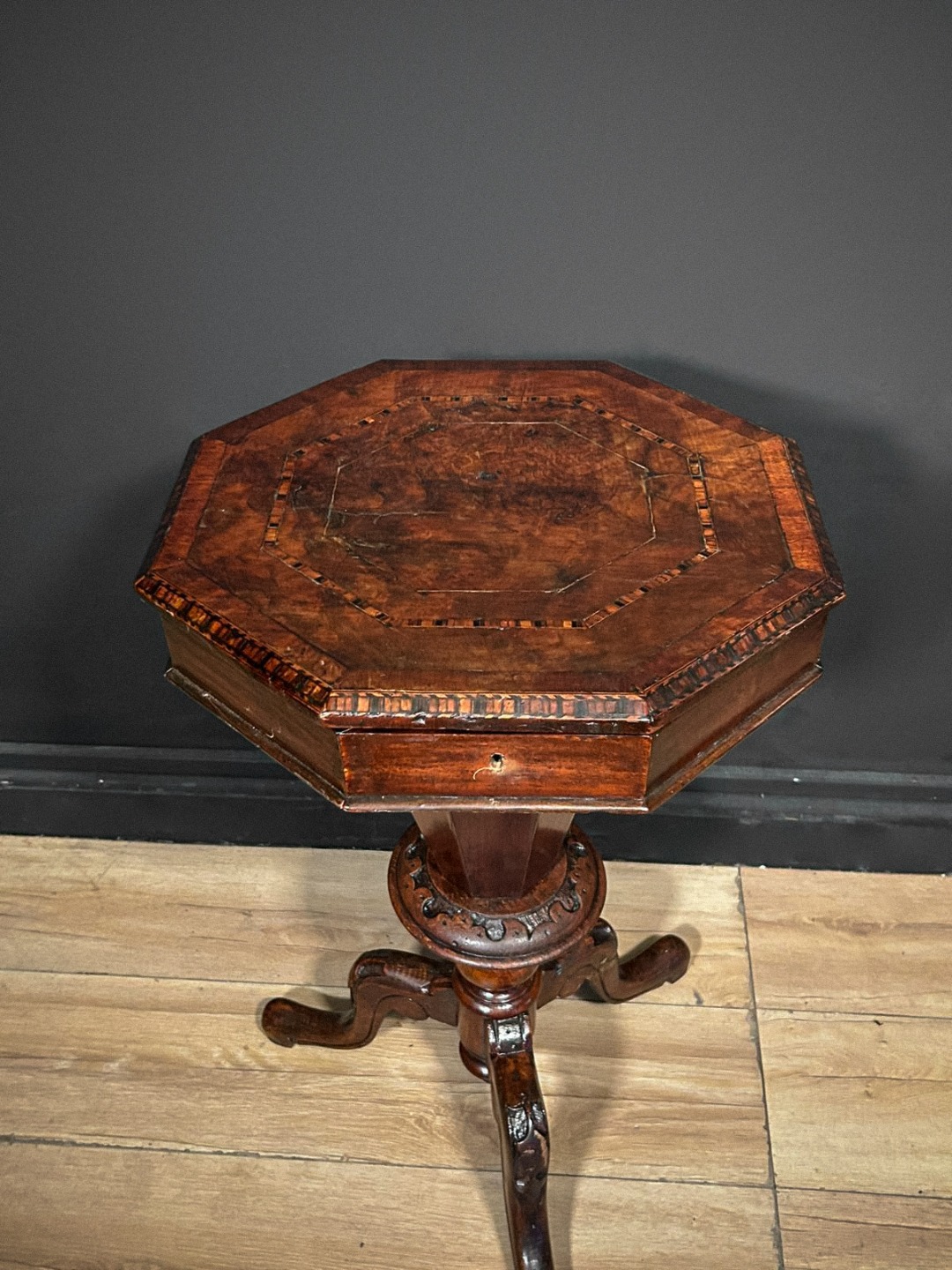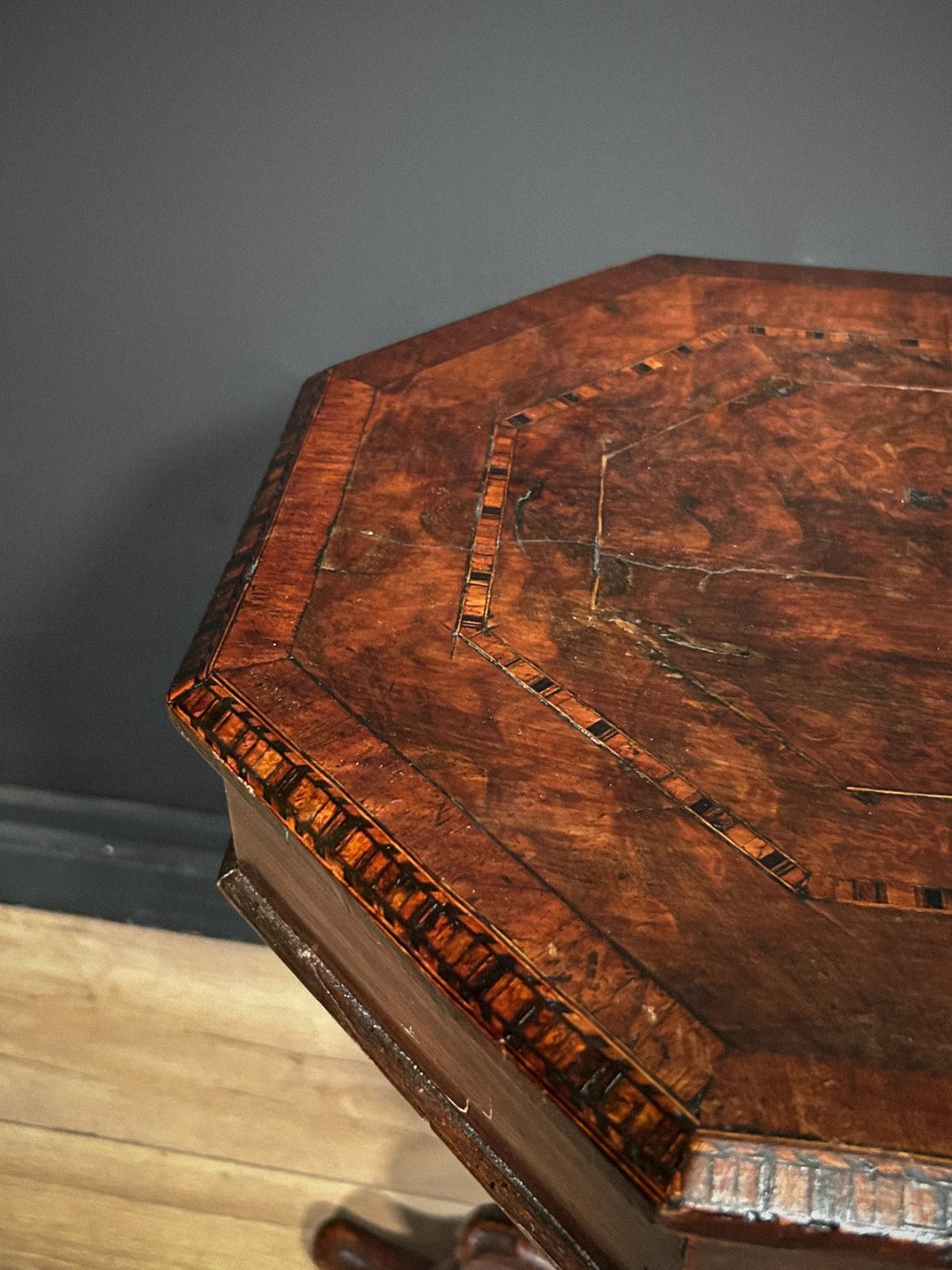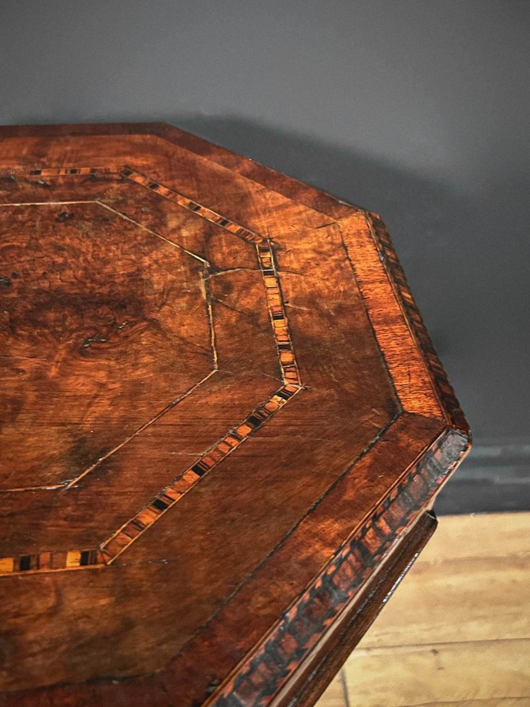 Elegante tavolino da lavoro italiano risalente alla metà del XIX secolo, realizzato in pregiata radica di noce con delicati intarsi in acero sul piano ottagonale. La superficie è finemente decorata con motivi geometrici e cornici intarsiate che valorizzano la naturale marezzatura della radica.