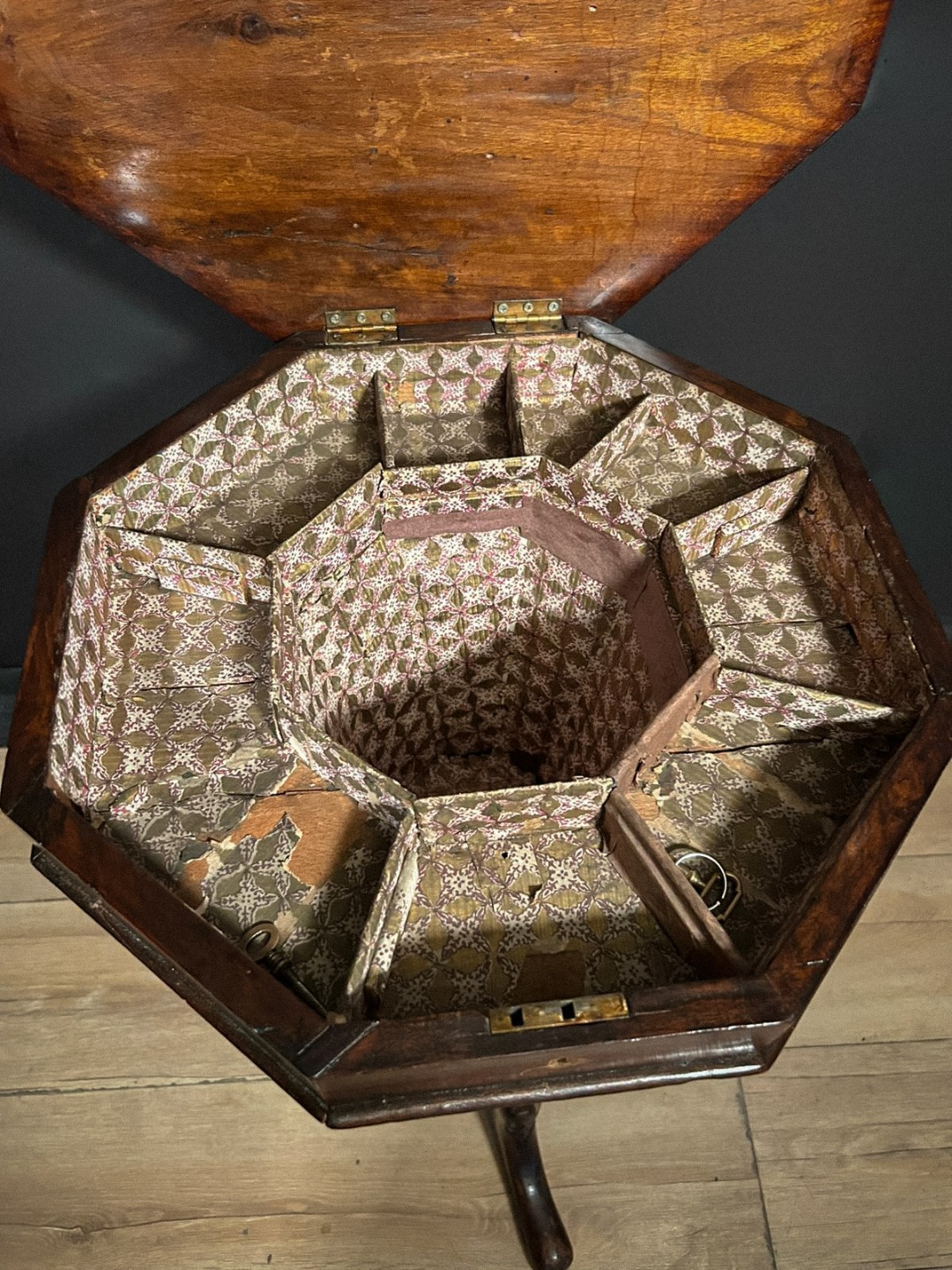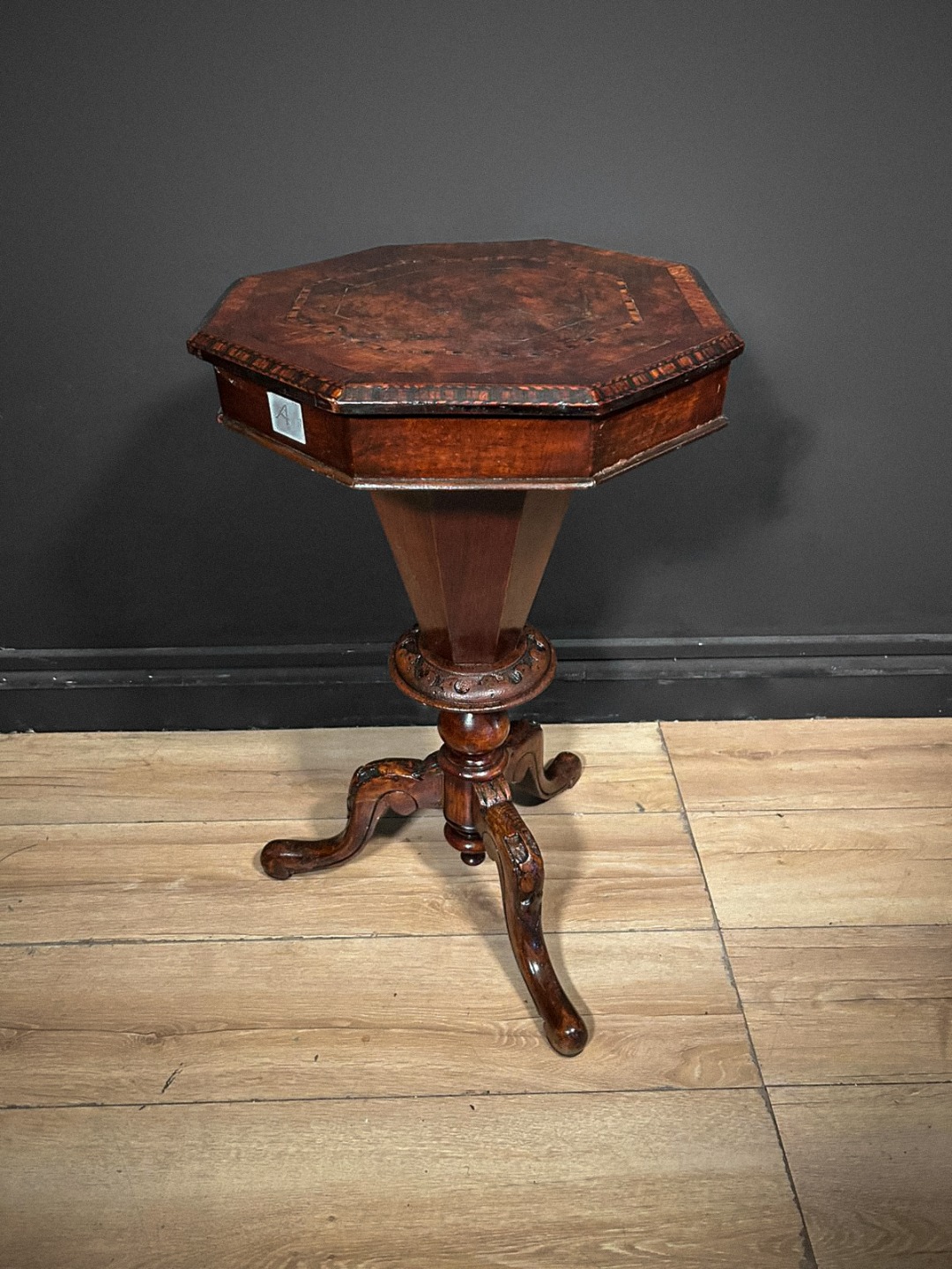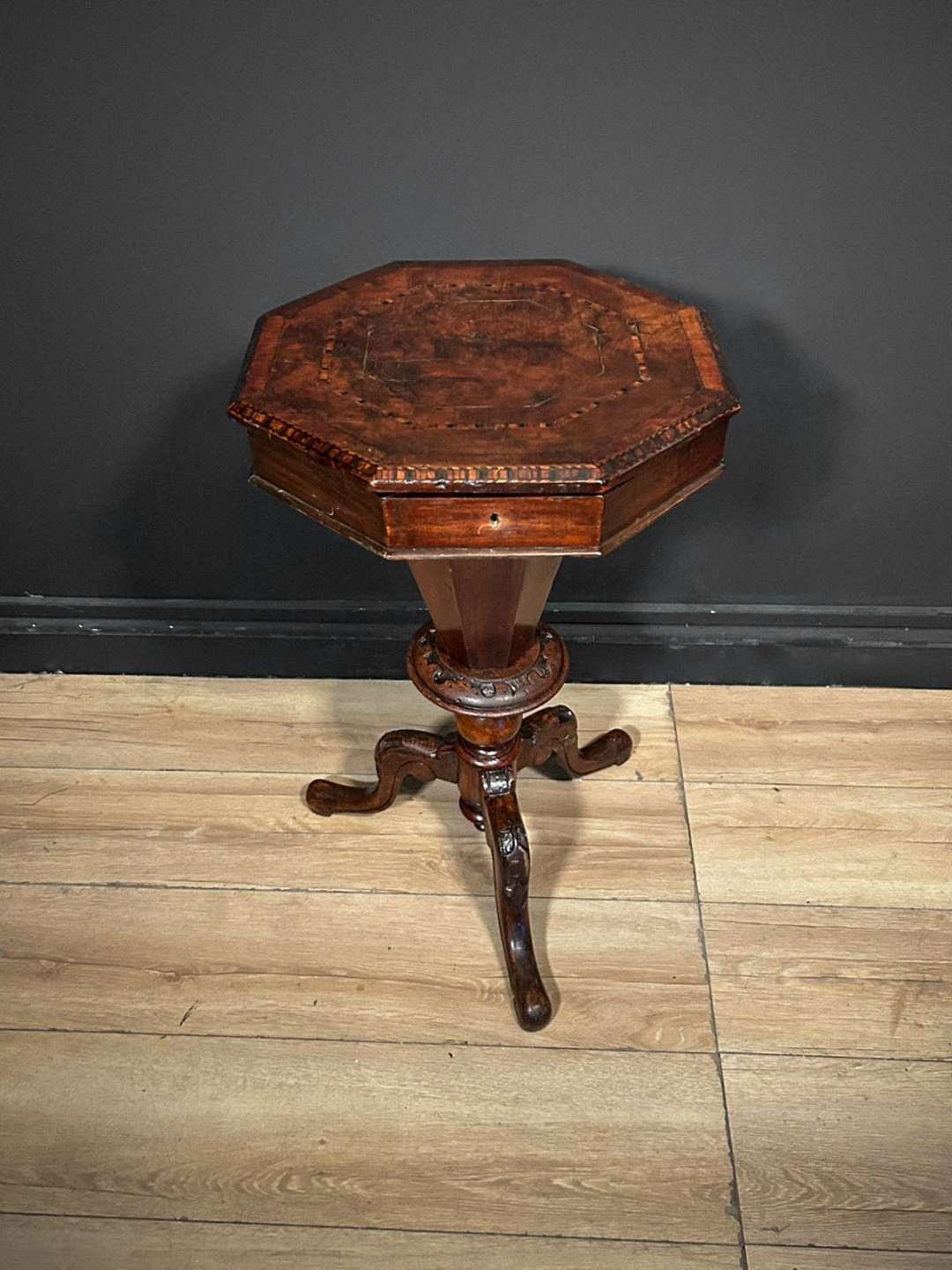 Elegante tavolino da lavoro italiano risalente alla metà del XIX secolo, realizzato in pregiata radica di noce con delicati intarsi in acero sul piano ottagonale. La superficie è finemente decorata con motivi geometrici e cornici intarsiate che valorizzano la naturale marezzatura della radica.
