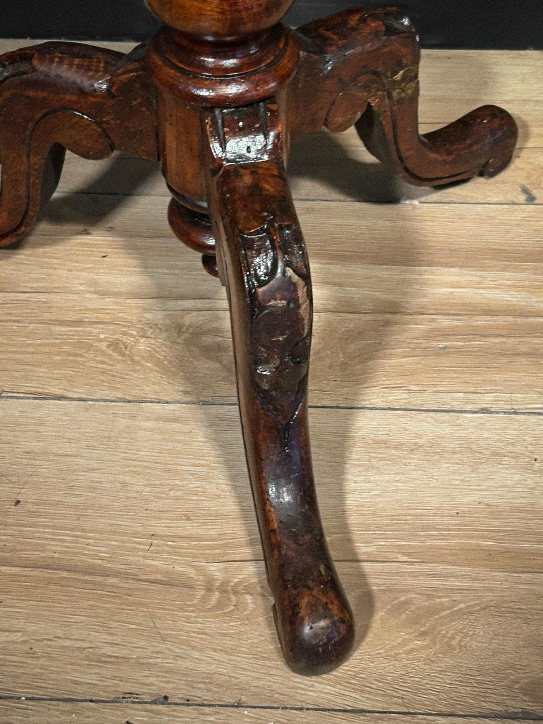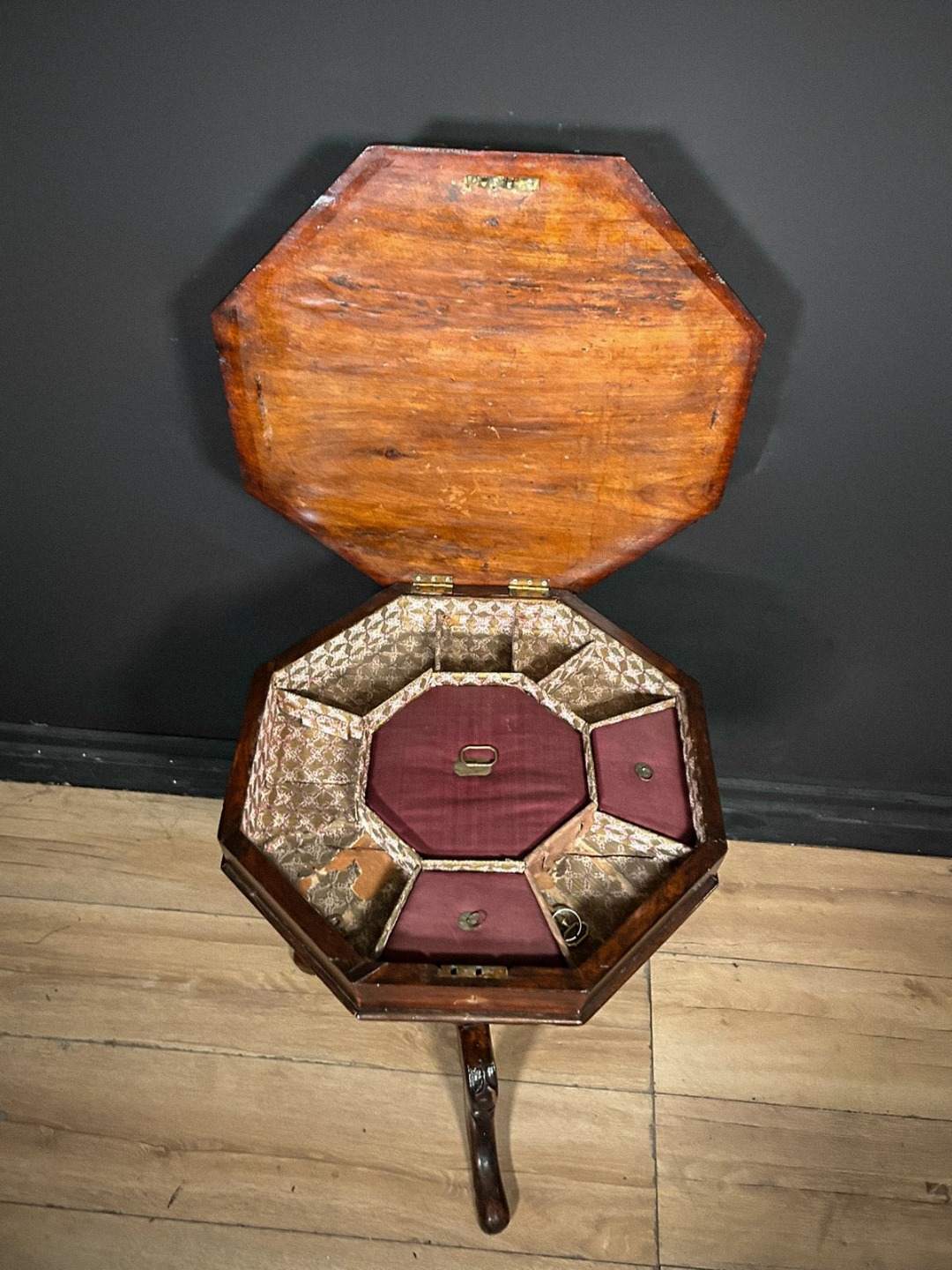 Il mobile presenta una struttura slanciata con fusto a tronco piramidale rovesciato, poggiante su un’elegante base tornita e sorretto da tre gambe mosse riccamente scolpite secondo il gusto Carlo X. Il piano superiore si apre rivelando un raffinato interno suddiviso in scomparti rivestiti in tessuto damascato dell’epoca, ideale per riporre oggetti da cucito, gioielli o piccoli accessori.