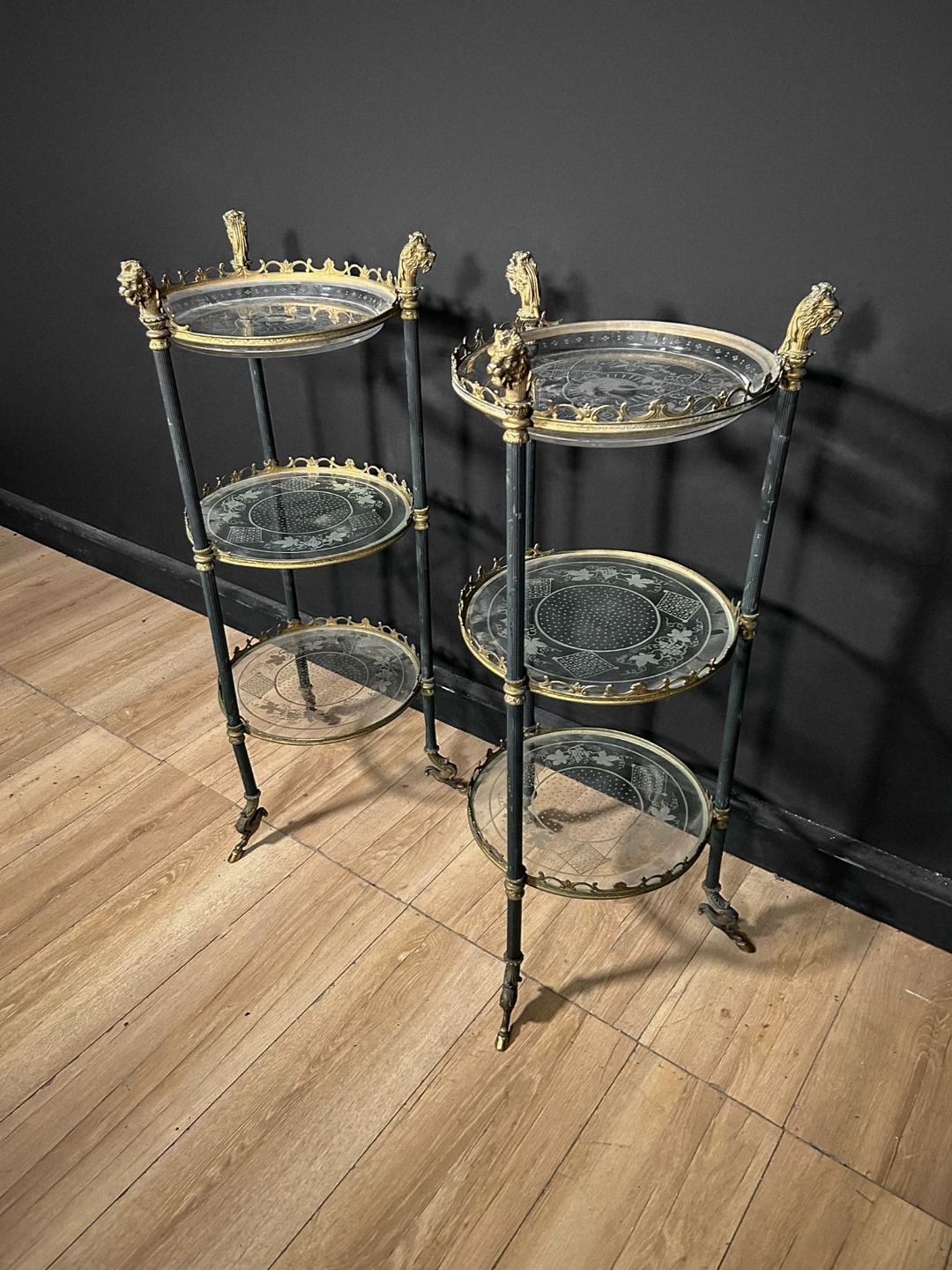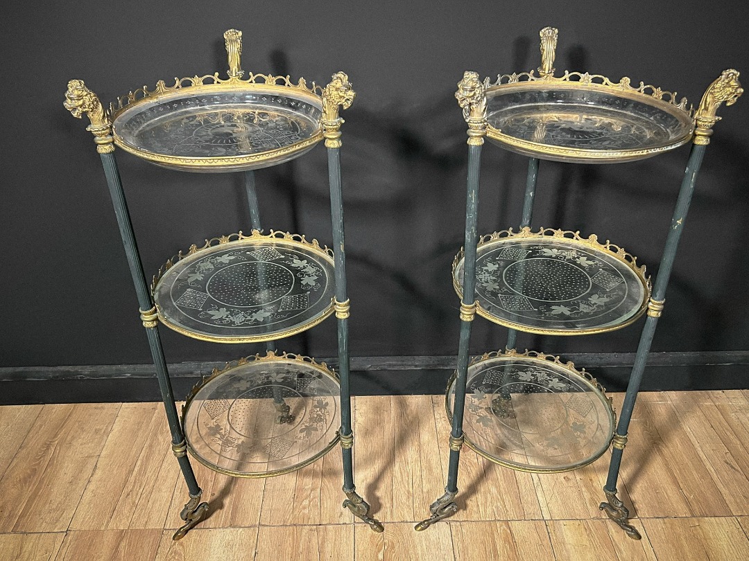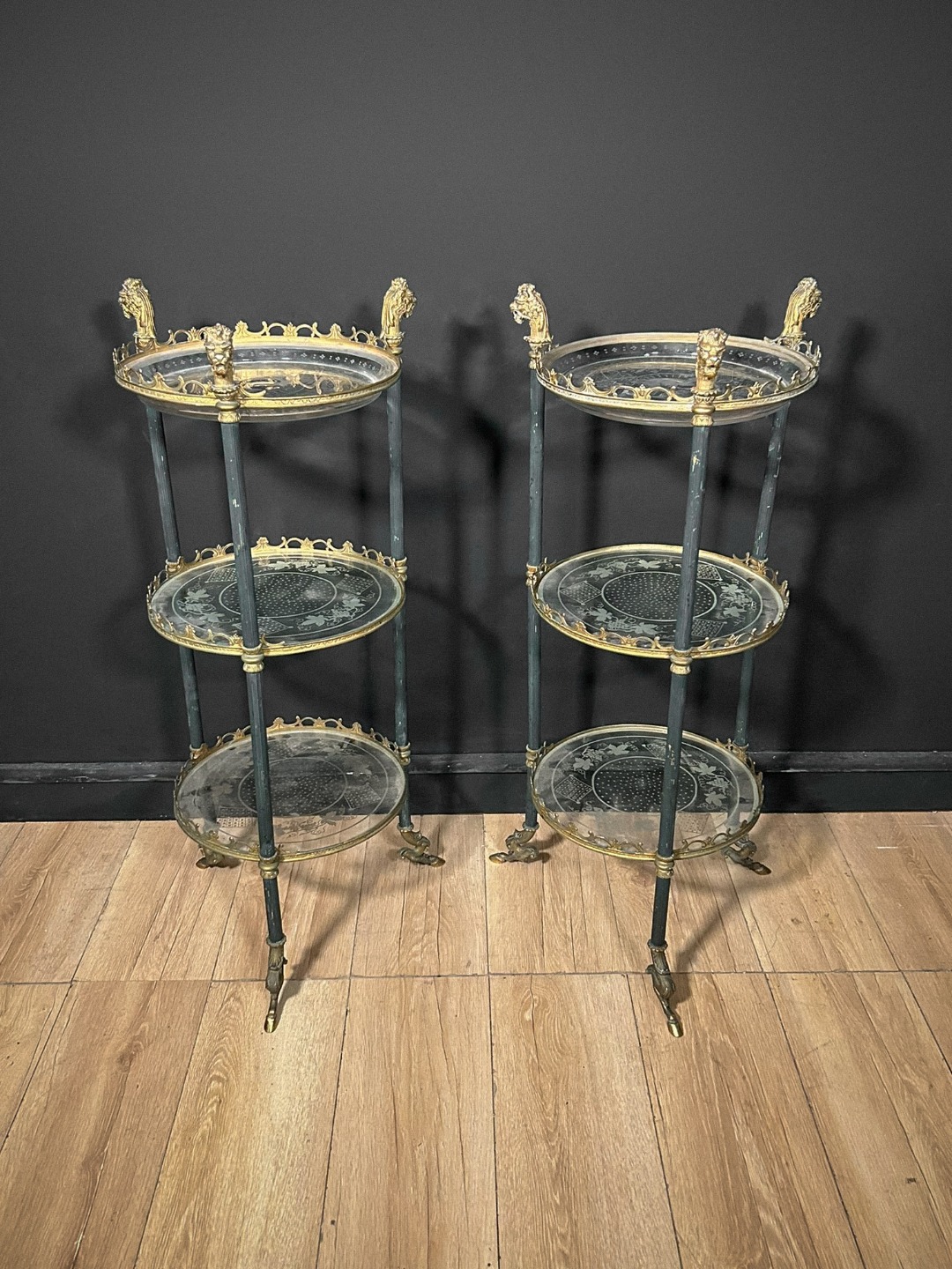 Raffinata coppia di étagères francesi Napoleone III, realizzate in bronzo dorato e cristallo inciso. Ogni struttura presenta tre piani circolari in cristallo finemente lavorato con motivi floreali e geometrici, incastonati in eleganti bordure di bronzo traforato.