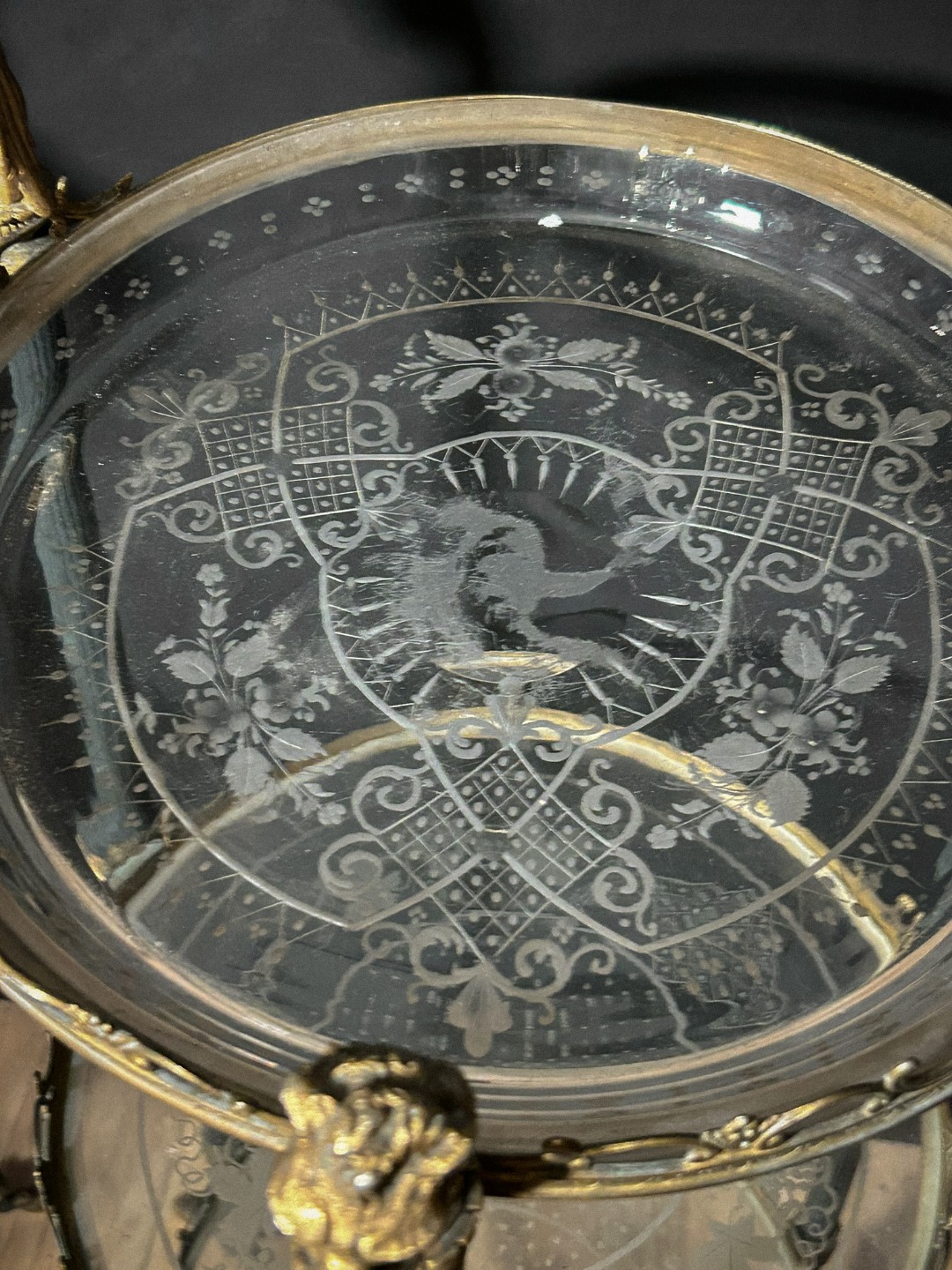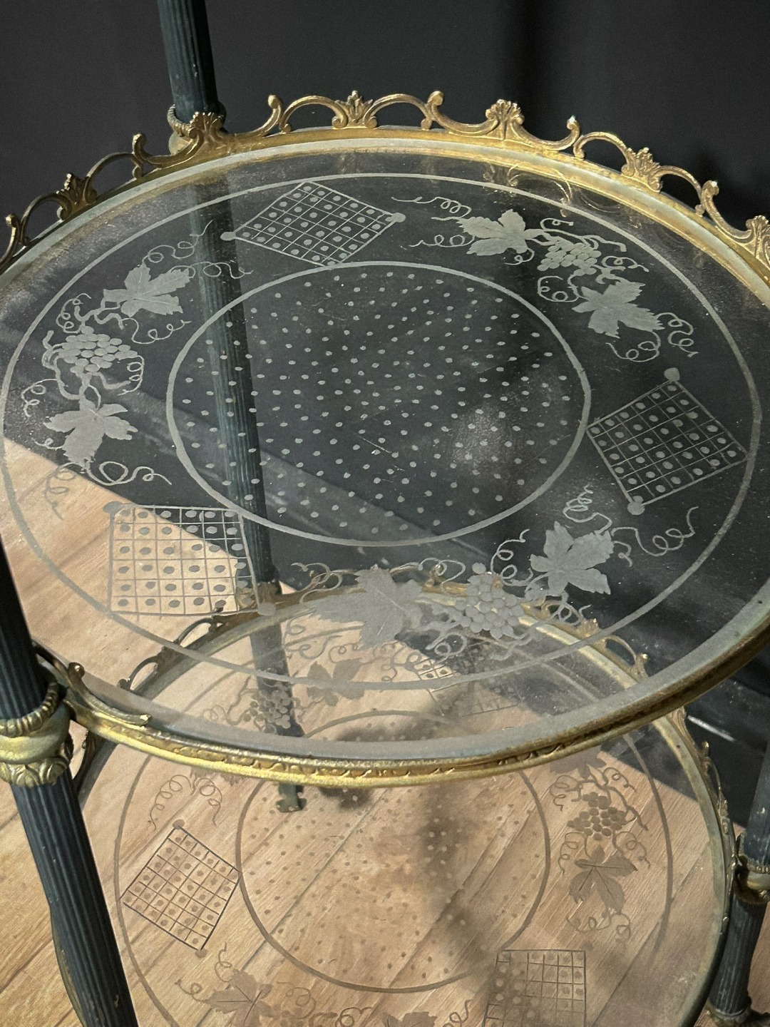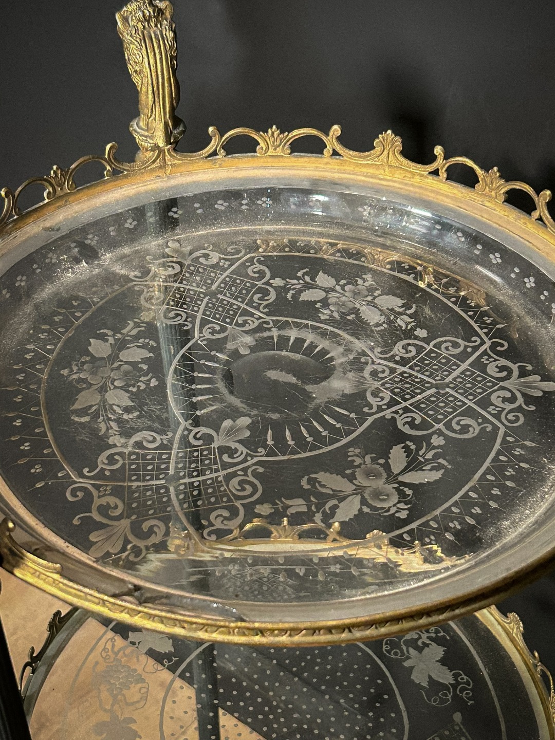 Raffinata coppia di étagères francesi Napoleone III, realizzate in bronzo dorato e cristallo inciso. Ogni struttura presenta tre piani circolari in cristallo finemente lavorato con motivi floreali e geometrici, incastonati in eleganti bordure di bronzo traforato.
