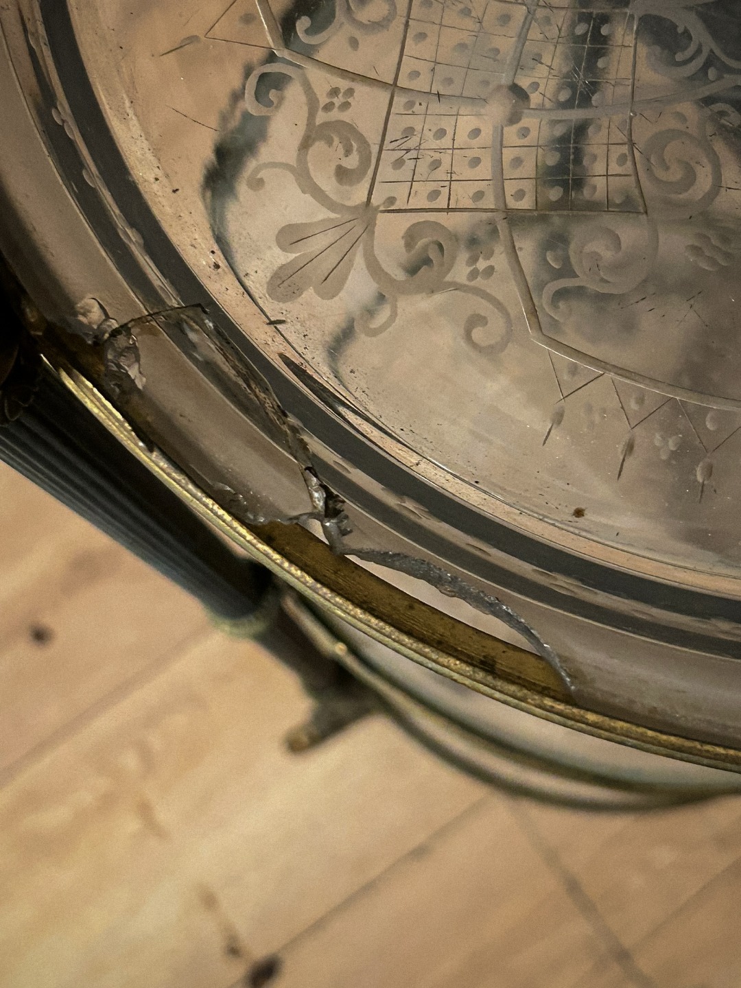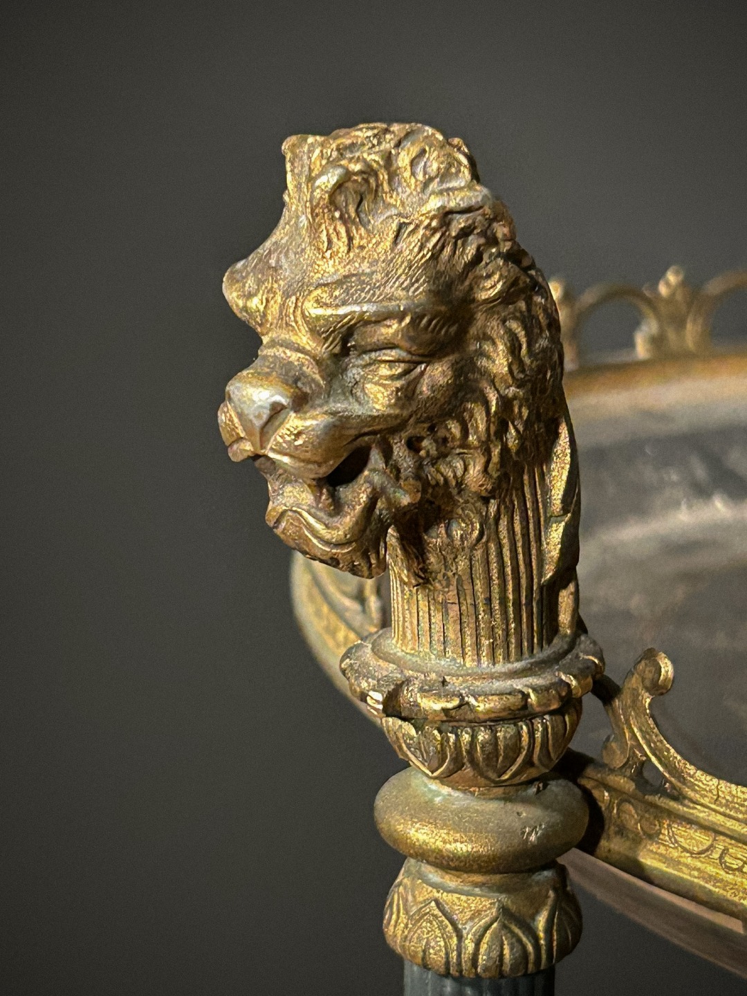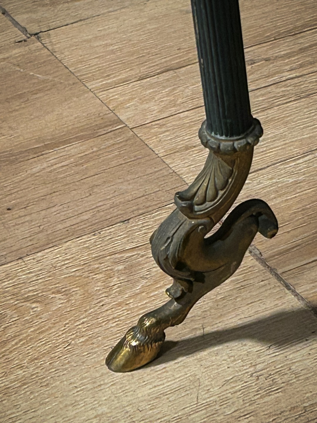 La base poggia su tre piedini zoomorfi in bronzo dorato, modellati con notevole precisione. L’insieme, armonioso e scenografico, le rende perfette come complementi d’arredo in ambienti eleganti, salotti o ingressi.