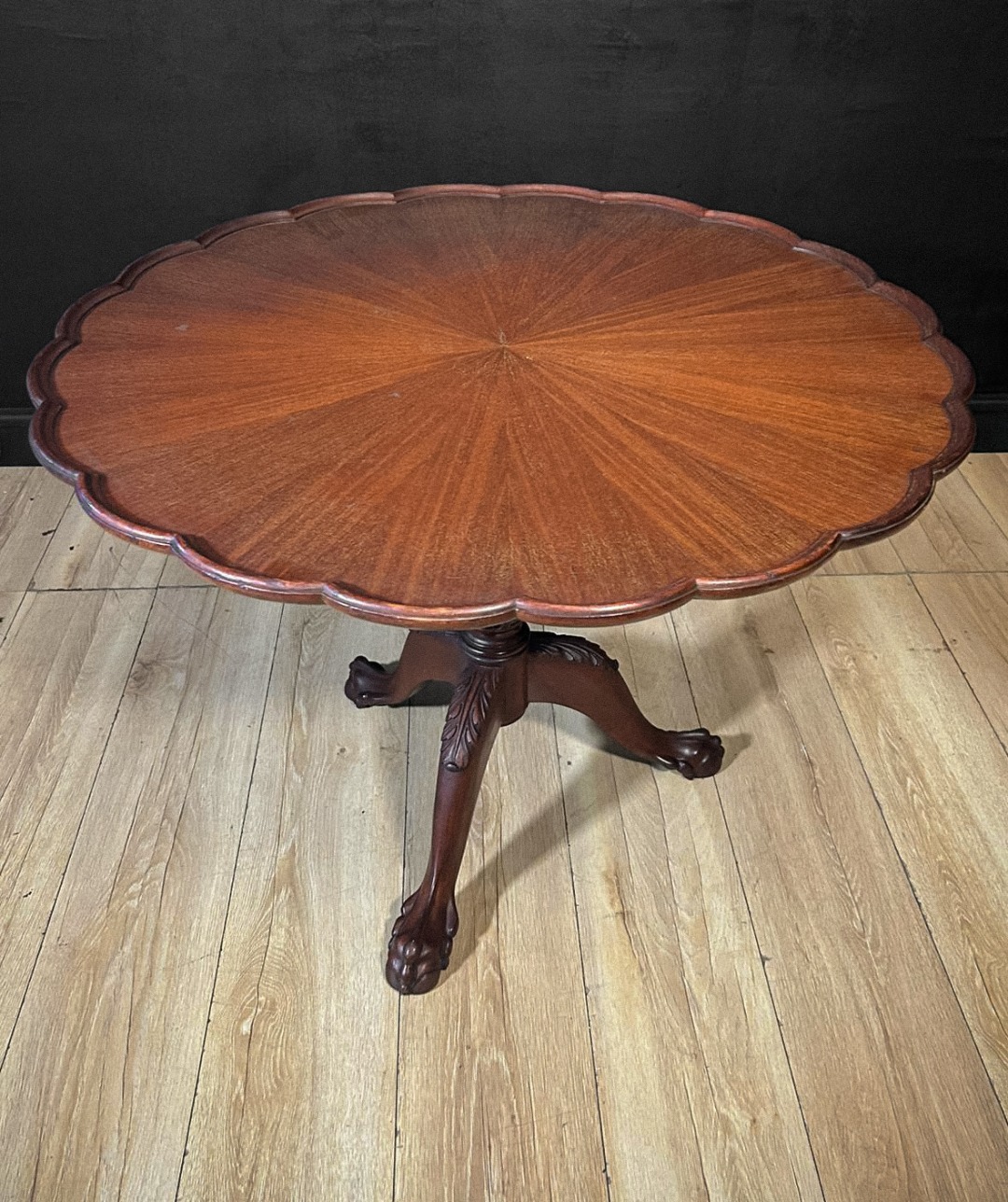 Il piano rotondo è finemente sagomato con bordo mosso a petali, richiamando la forma di una margherita, ed è impreziosito da una spettacolare venatura radiale disposta a raggiera che converge armoniosamente verso il centro, esaltando la qualità del mogano.