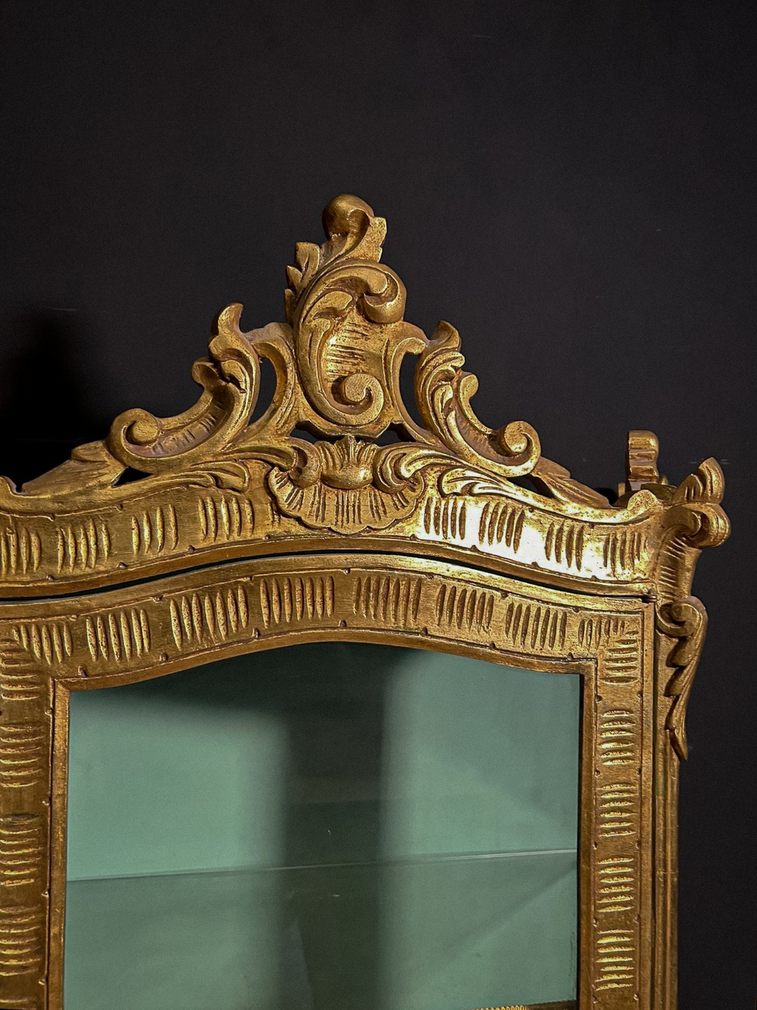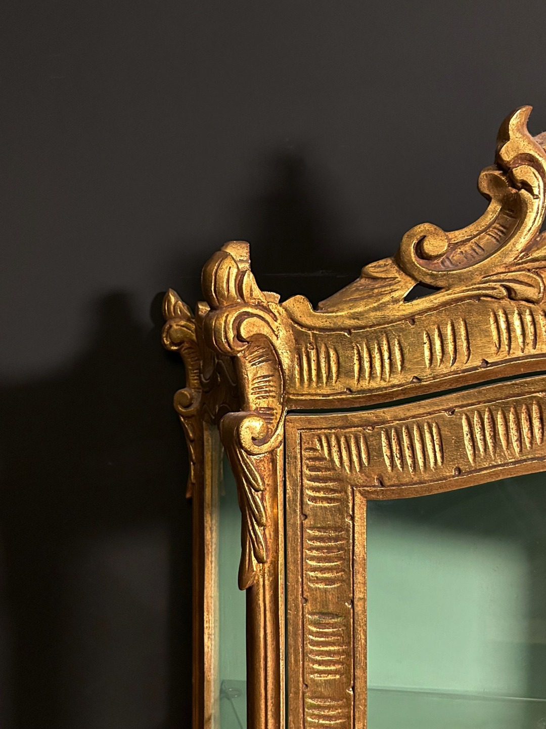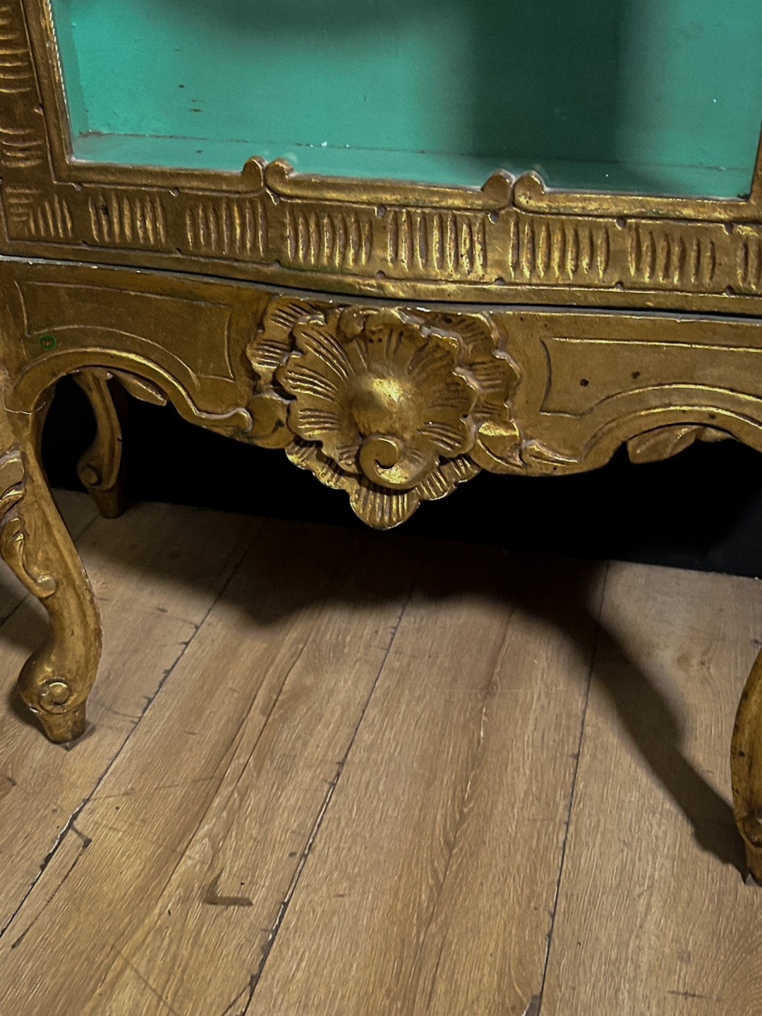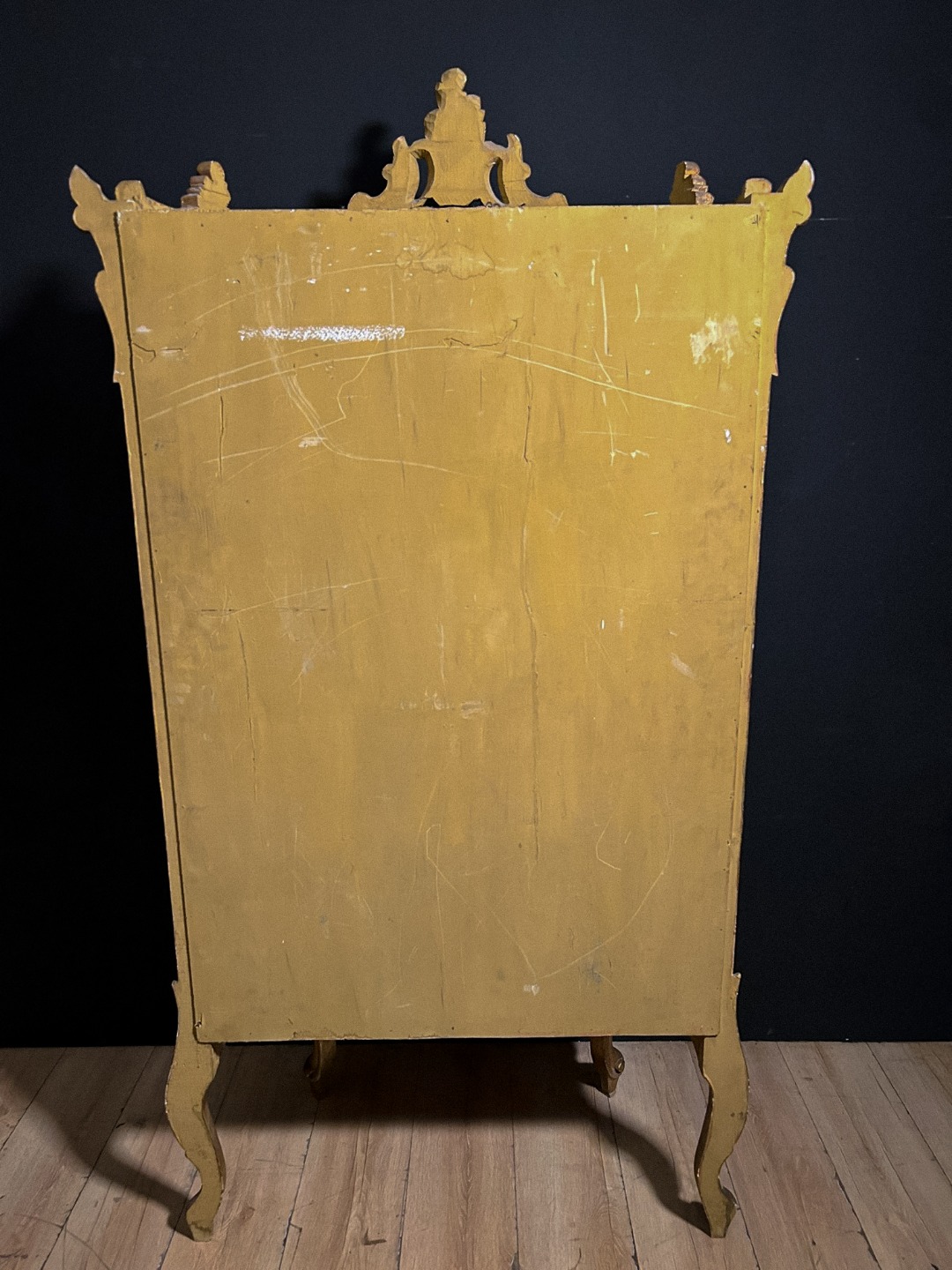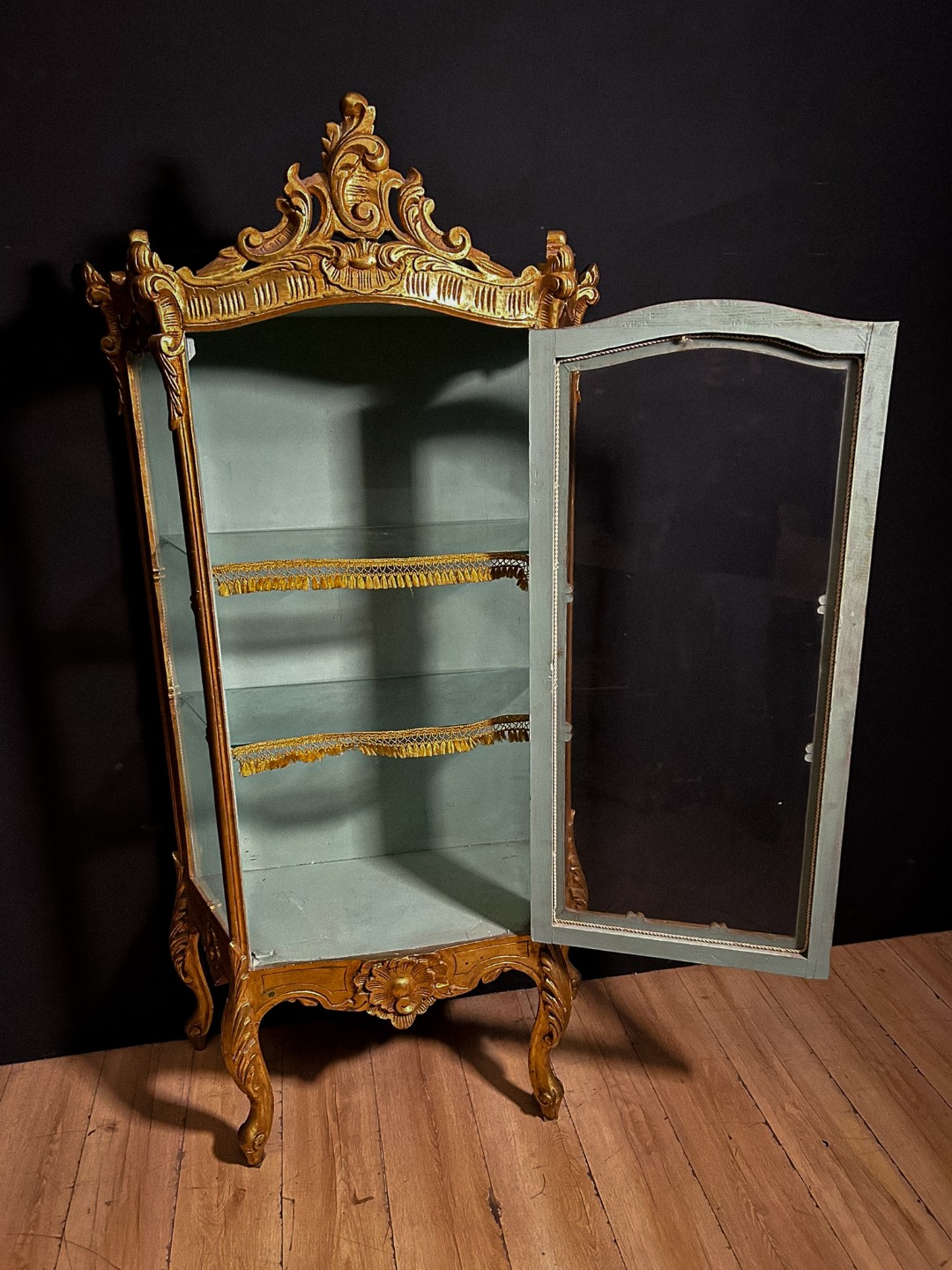 Antica Vetrina in stile Luigi XV, risalente alla prima metà del 1900. Questa elegante vetrina è interamente realizzata in legno finemente intagliato a mano, dimostrando l’abilità artigianale e l’attenzione ai dettagli tipici del design francese. Con una struttura robusta e decorativa, la vetrina misura 188 cm di altezza, 95 cm di larghezza e 43 cm di profondità, offrendo ampio spazio per esporre stoviglie, libri o oggetti collezionabili.
