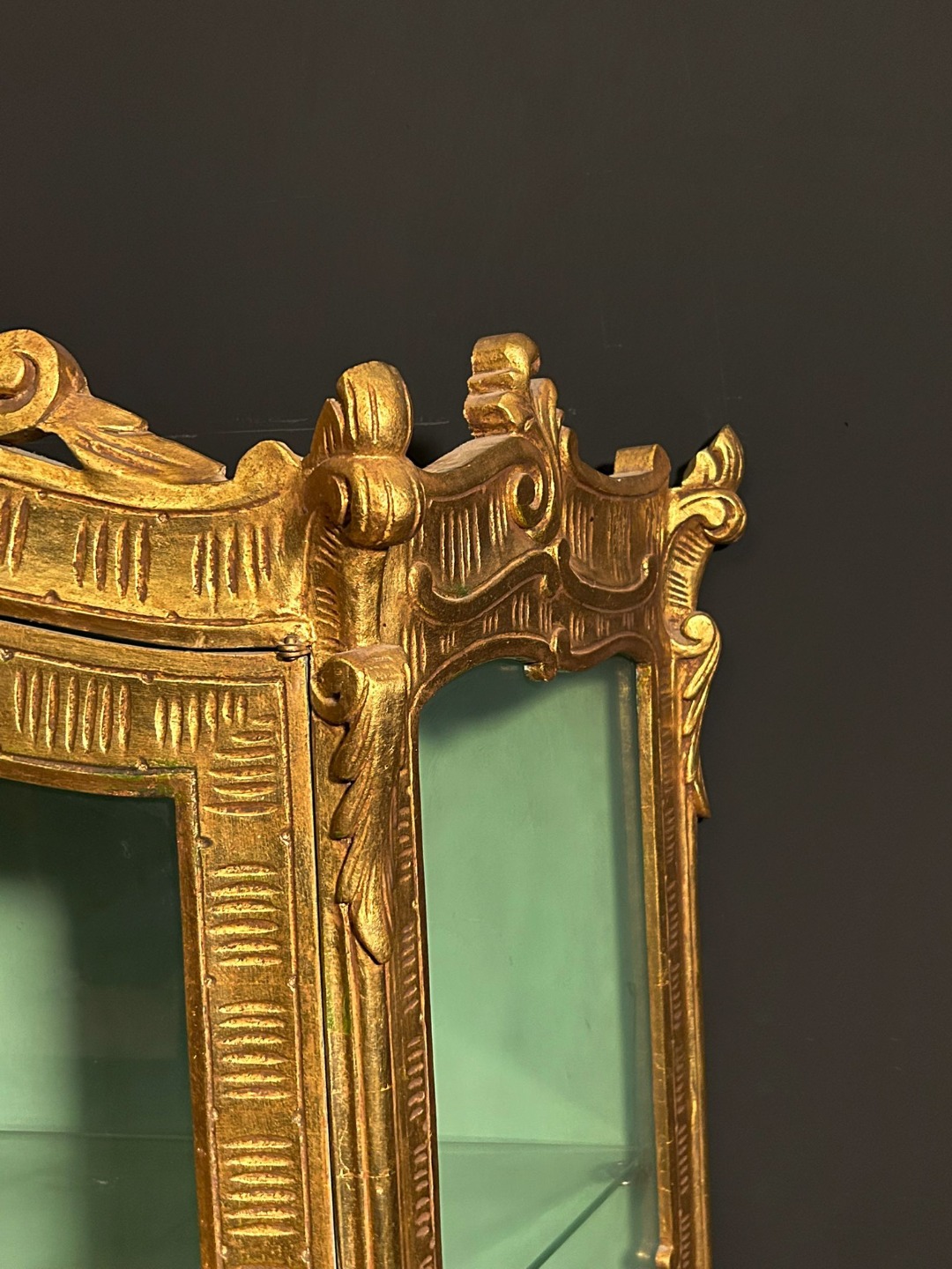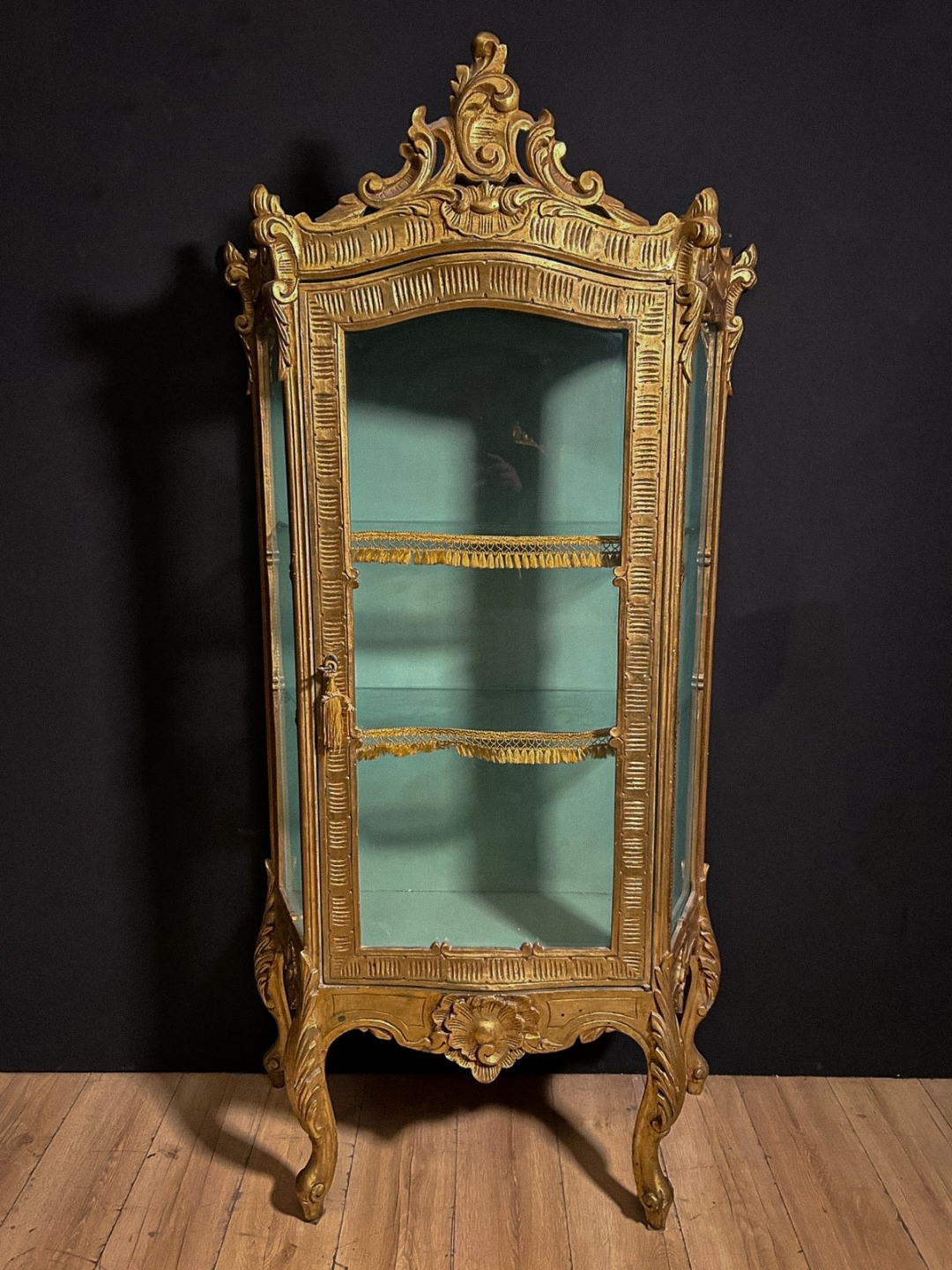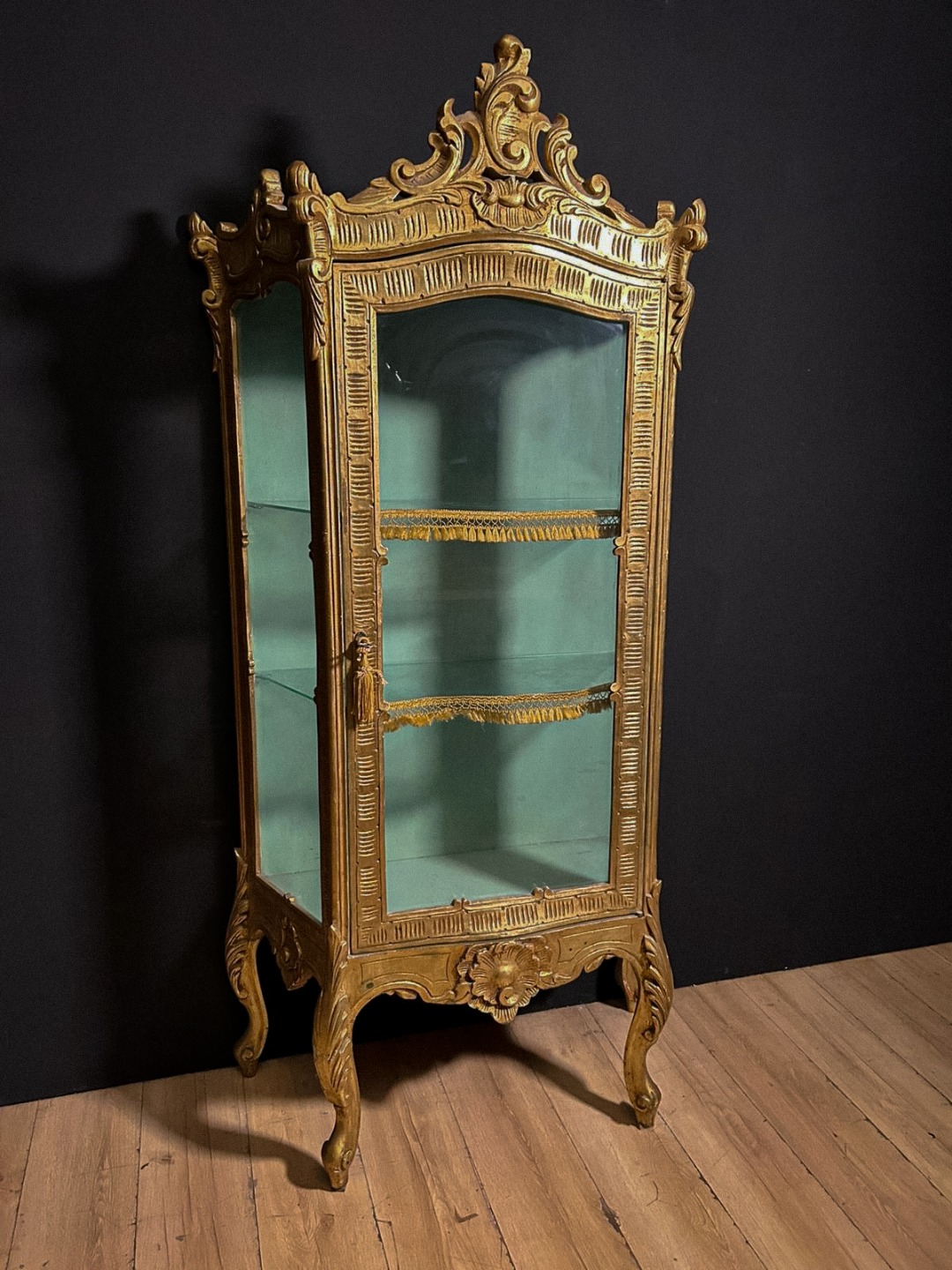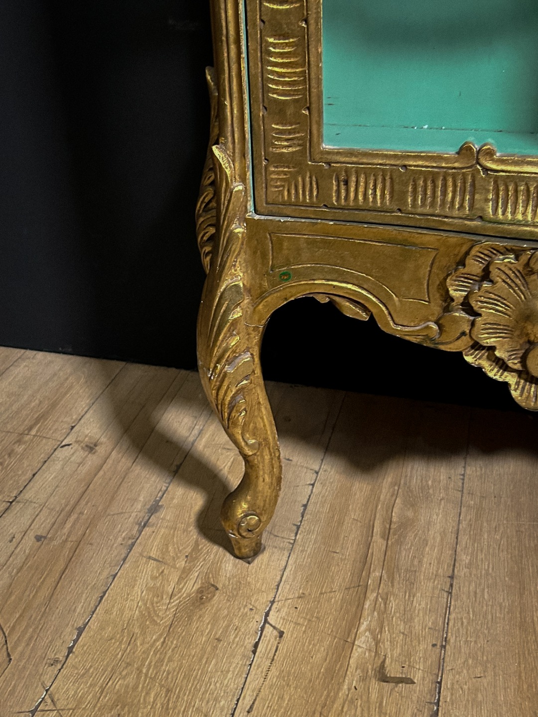 Antica Vetrina in stile Luigi XV, risalente alla prima metà del 1900. Questa elegante vetrina è interamente realizzata in legno finemente intagliato a mano, dimostrando l’abilità artigianale e l’attenzione ai dettagli tipici del design francese. Con una struttura robusta e decorativa, la vetrina misura 188 cm di altezza, 95 cm di larghezza e 43 cm di profondità, offrendo ampio spazio per esporre stoviglie, libri o oggetti collezionabili.